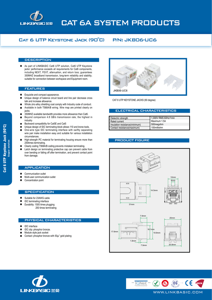 CAT 6A SYSTEM PRODUCTS Cat 6 UTP Keystone Jack (90°C) P/N: JKB06-UC6 DESCRIPTION As part of LINKBASIC Cat6 UTP solution, Cat6 UTP Keystone jacks’ performance exceeds all requirements for Cat6 components, including NEXT, FEXT, attenuation, and return loss; guarantees 350MHZ broadband transmission, long-term reliability and stability; suitable for connection between workspace and Equipment room. Copper solution Cat 6 UTP Keystone Jack (90°C) FEATURES Exquisite and compact appearance. Unique design of balance circuit board and line pair decrease cross talk and increase allowance. Whole zinc-alloy shielding coat comply with Industry code of conduct. Available in both T568A/B wiring. Wire map are printed clearly on jacks. 350MHZ available bandwidth provides more allowance than Cat6. Beyond comparison 4.8 GB/s transmission rate, the highest in industry Backward compatibility for Cat5E and Cat5 Unique design of IDC terminating block allows 110 and krone tools. One-wire type IDC terminating interface with swiftly separating wire pair make installation easy and suitable for various installation circumstances. High-strength PC material for terminating housing ensure more than 250times terminating. Clearly coding T568A/B coding prevents mistaken terminating. Latch design on terminating protective cap can prevent cable from over bending or falling off after termination, and prevent contact point from damage. JKB06-UC6 CAT 6 UTP KEYSTONE JACKS (90 degree) ELECTRICAL CHARACTERISTICS 1,000V RMS 60Hz/1min Maximum 1.5A 500megohm 100milliohm Dielectric strength Rated current Insulation resistance(minimum) Contact resistance(maximum) PRODUCT FIGURE APPLICATION Communication outlet Multi-user communication outlet Concentration point 12mm 4mm 14.5mm SPECIFICATION Suitable for 23AWG cable IDC terminating interface Durability: 1500 times plugging 250 times terminating 31mm 7.9mm 20mm PHYSICAL CHARACTERISTICS IDC interface IDC clip: phosphor bronze. Module style jack socket Contact: phosphor bronze with 50µ’’ gold plating CAT 6 16.1mm 17.6mm 19.9mm 1.8mm 7.9mm 20.8mm WWW.LINKBASIC.COM CAT 6A SYSTEM PRODUCTS Cat 6 UTP Keystone Jack (90°C) P/N: JKB06-UC6 PRODUCT FIGURE TRANSMISSION PERFORMANCE The new design allows high density solution. Allow RJ45 plugs to provide high-density solutions. The material of the contact is covered by 50μ” gold plate which allows 1500 matching recycles. Insertion loss Next PSNext RL (MHz) (Db) (Db) (Db) (Db) 1 0.06 84.3 83.4 52.1 4 0.06 79.8 74.5 53.3 8 0.06 77.1 69.1 55.0 10 0.07 76.1 67.3 55.7 16 0.07 71.7 62.5 57.2 20 0.08 71.6 61.4 59.1 25 0.08 68.8 59.3 58.9 31.25 0.09 67.4 57.9 56.3 62.5 0.10 61.2 52.3 41.8 100 0.10 57.4 48.4 32.7 200 0.10 52.2 41.9 20.9 250 0.16 47.6 39.8 17.1 Compliant with Category 6 component and channel requirement of T568A and T568B. Copper solution Cat 6 UTP Keystone Jack (90°C) Termination caps prevent wire from dropping off. frequency The V style IDC contacts flex not fatigue when terminated. INSTALLATION INSTRUCTIONS A C B strip back cable jacket using Linkbasic tool (P/N: TLD01) or equivalent. view the color on the module to determine proper location of the conductors based upon preferred wiring scheme. insert each wire into the appropriate channel according to the color code on the module G F terminate wires using linkbasic tool Install dust caps by snapping into place as shown. ORDER INFORMATION Part number Description standard color Inner box Carton JKB06-UC6 Cat6 unshielded keystone jacks (90 degree) White 25PCS 250PCS L 53.5cm×W 31.3cm×H 23.4cm Carton measurement Carton weight 4.20KG WWW.LINKBASIC.COM
