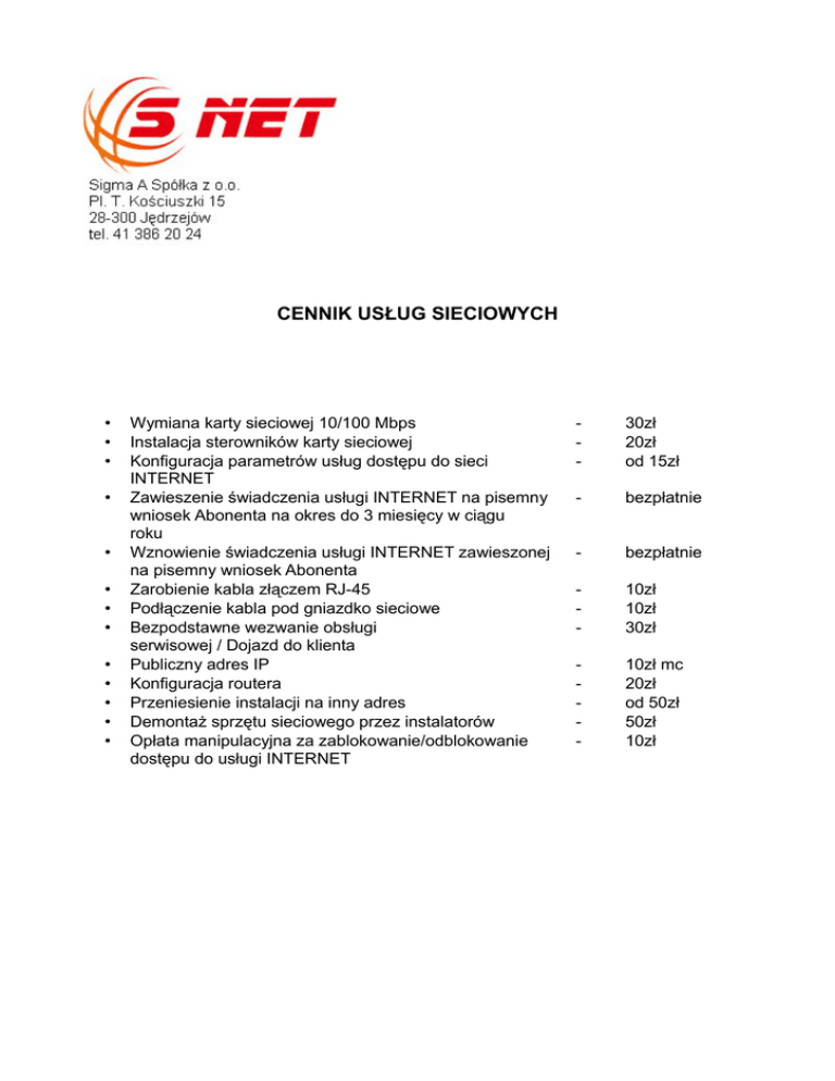 cennik usług sieciowych - S-net Twoja strefa internetu
