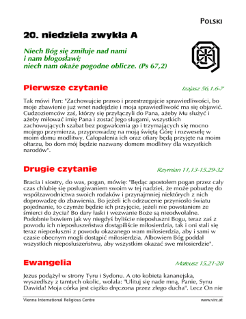 Polski Niech Bóg się zmiłuje nad nami i nam błogosławi; niech nam okaże pogodne oblicze. (Ps 67,2) Tak mówi Pan: "Zachowujcie prawo i przestrzegajcie sprawiedliwości, bo moje zbawienie już wnet nadejdzie i moja sprawiedliwość ma się objawić. Cudzoziemców zaś, którzy się przyłączyli do Pana, ażeby Mu służyć i ażeby miłować imię Pana i zostać Jego sługami, wszystkich zachowujących szabat bez pogwałcenia go i trzymających się mocno mojego przymierza, przyprowadzę na moją świętą Górę i rozweselę w moim domu modlitwy. Całopalenia ich oraz ofiary będą przyjęte na moim ołtarzu, bo dom mój będzie nazwany domem modlitwy dla wszystkich narodów". Bracia i siostry, do was, pogan, mówię: "Będąc apostołem pogan przez cały czas chlubię się posługiwaniem swoim w tej nadziei, że może pobudzę do współzawodnictwa swoich rodaków i przynajmniej niektórych z nich doprowadzę do zbawienia. Bo jeżeli ich odrzucenie przyniosło światu pojednanie, to czymże będzie ich przyjęcie, jeżeli nie powstaniem ze śmierci do życia? Bo dary łaski i wezwanie Boże są nieodwołalne. Podobnie bowiem jak wy niegdyś byliście nieposłuszni Bogu, teraz zaś z powodu ich nieposłuszeństwa dostąpiliście miłosierdzia, tak i oni stali się teraz nieposłuszni z powodu okazanego wam miłosierdzia, aby i sami w czasie obecnym mogli dostąpić miłosierdzia. Albowiem Bóg poddał wszystkich nieposłuszeństwu, aby wszystkim okazać swe miłosierdzie". Jezus podążył w strony Tyru i Sydonu. A oto kobieta kananejska, wyszedłszy z tamtych okolic, wołała: "Ulituj się nade mną, Panie, Synu Dawida! Moja córka jest ciężko dręczona przez złego ducha". Lecz On nie Vienna International Religious Centre www.virc.at odezwał się do niej ani słowem. Na to zbliżyli się do Niego uczniowie i prosili: "Odpraw ją, bo krzyczy za nami". Lecz On odpowiedział: "Jestem posłany tylko do owiec, które poginęły z domu Izraela". A ona przyszła, upadła przed Nim i prosiła: "Panie, dopomóż mi". On jednak odparł: "Niedobrze jest zabrać chleb dzieciom i rzucić psom". A ona odrzekła: "Tak, Panie, lecz i szczenięta jedzą z okruszyn, które spadają ze stołu ich panów". Wtedy Jezus jej odpowiedział: "O niewiasto, wielka jest twoja wiara; niech ci się stanie, jak chcesz". Od tej chwili jej córka została uzdrowiona. Aby ustąpić swoim przeciwnikom, którzy zarzucali Mu nieprzestrzeganie żydowskich przepisów o czystości, udaje się Jezus do pogańskiej krainy Tyru i Sydonu. Tam także konfrontowany jest z kwestią czystości i nieczystości. Kobieta kanaanejska, a więc poganka i tym samym nieczysta, prosi Go o pomoc. Najpierw Jezus nie reaguje na jej prośbę. Wydaje się, jakoby podzielał arogancję Żydów względem tych "psów-pogan" – On bowiem do zaginionych owiec Izraela został posłany, nie do pogan. Kobieta nie daje się zwieść. Sprawia wrażenie wyczuwającej, że pozorna nieustępliwość Jezusa jest tylko Jego ostatnim życzeniem, aby wybrany naród Boga zjednoczyć w wierze wokół prawdziwego i ostatecznego Zbawcy. Nie rości żadnych pretensji i nie twierdzi, że należy do tego narodu, by mieć udział w "chlebie". Prosi z pokorą i godnością o jego okruchy. Tym samym rozpoznała, co jest istotne. Nie przynależność do określonej grupy, rasy lub religii lecz wiara w dobro i zbawienie przychodzące od Boga. Jezus umacnia ją w tej postawie i zapewnia o wypełnieniu jej prośby. Judeochrześcijanie pierwszych wieków rozpoznali w spotkaniu Jezusa z Kanaanejką profetyczny model swojego zachowania wobec pogano-chrześcijan. Wyjście z elitarnej wspólnoty religijnej było konieczne, aby uniwersalny Boży plan zbawienia, który złączony jest nie z rasą lecz z postawą, mógł być wiarygodnie przedstawiany i głoszony. Sytuacja, z którą zostaliśmy skonfrontowani, nie wygląda dzisiaj inaczej. Świat nie stał się w międzyczasie bardziej chrześcijański. Niektórzy przyjęli Chrystusa, ale nawet w kręgu jednej wspólnoty chrześcijan istnieje mnóstwo różnorodnych przekonań. Aby ekumenizm i braterstwo nie pozostały jedynie pustymi hasłami, musimy wcielać to, o czym już Sobór Watykański II wyraźnie mówi: "Także ludzie, którzy nie przyjęli jeszcze Ewangelii, przynależą w różny sposób do Ludu Bożego ... Jego wola zbawienia ogarnia ... wszystkich, którzy uznają Go jako swego Stwórcę. On jest ich zbawicielem, On chce, aby wszyscy ludzie byli zbawieni." (Konstytucja o Kościele, 16) Zatwardziałość i brak poszanowania wobec tych, którzy myślą i czują inaczej, panoszy się także wśród nas, chrześcijan. Nie jest ona nas godna w konfrontacji z kochającą i bezwarunkową wiernością Boga wobec wszystkich ludzi. Spróbujmy w nadchodzącym tygodniu okazać więcej ciepła, pokory i tolerancji wszystkim tym, których mamy "po dziurki w nosie". Vienna International Religious Centre [email protected]