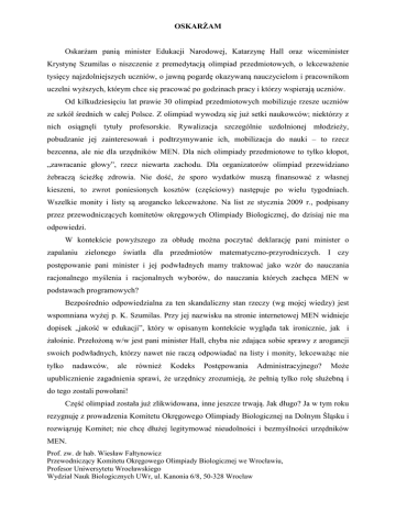 OSKARŻAM Oskarżam panią minister Edukacji Narodowej, Katarzynę Hall oraz wiceminister Krystynę Szumilas o niszczenie z premedytacją olimpiad przedmiotowych, o lekceważenie tysięcy najzdolniejszych uczniów, o jawną pogardę okazywaną nauczycielom i pracownikom uczelni wyższych, którym chce się pracować po godzinach pracy i którzy wspierają uczniów. Od kilkudziesięciu lat prawie 30 olimpiad przedmiotowych mobilizuje rzesze uczniów ze szkół średnich w całej Polsce. Z olimpiad wywodzą się już setki naukowców; niektórzy z nich osiągnęli tytuły profesorskie. Rywalizacja szczególnie uzdolnionej młodzieży, pobudzanie jej zainteresowań i podtrzymywanie ich, mobilizacja do nauki – to rzecz bezcenna, ale nie dla urzędników MEN. Dla nich olimpiady przedmiotowe to tylko kłopot, „zawracanie głowy”, rzecz niewarta zachodu. Dla organizatorów olimpiad przewidziano żebraczą ścieżkę zdrowia. Nie dość, że sporo wydatków muszą finansować z własnej kieszeni, to zwrot poniesionych kosztów (częściowy) następuje po wielu tygodniach. Wszelkie monity i listy są arogancko lekceważone. Na list ze stycznia 2009 r., podpisany przez przewodniczących komitetów okręgowych Olimpiady Biologicznej, do dzisiaj nie ma odpowiedzi. W kontekście powyższego za obłudę można poczytać deklarację pani minister o zapalaniu zielonego światła dla przedmiotów matematyczno-przyrodniczych. I czy postępowanie pani minister i jej podwładnych mamy traktować jako wzór do nauczania racjonalnego myślenia i racjonalnych wyborów, do nauczania których zachęca MEN w podstawach programowych? Bezpośrednio odpowiedzialna za ten skandaliczny stan rzeczy (wg mojej wiedzy) jest wspomniana wyżej p. K. Szumilas. Przy jej nazwisku na stronie internetowej MEN widnieje dopisek „jakość w edukacji”, który w opisanym kontekście wygląda tak ironicznie, jak i żałośnie. Przełożoną w/w jest pani minister Hall, chyba nie zdająca sobie sprawy z arogancji swoich podwładnych, którzy nawet nie raczą odpowiadać na listy i monity, lekceważąc nie tylko nadawców, ale również Kodeks Postępowania Administracyjnego? Może upublicznienie zagadnienia sprawi, że urzędnicy zrozumieją, że pełnią tylko rolę służebną i do tego zostali powołani! Część olimpiad została już zlikwidowana, inne jeszcze trwają. Jak długo? Ja w tym roku rezygnuję z prowadzenia Komitetu Okręgowego Olimpiady Biologicznej na Dolnym Śląsku i rozwiązuję Komitet; nie chcę dłużej legitymować nieudolności i bezmyślności urzędników MEN. Prof. zw. dr hab. Wiesław Fałtynowicz Przewodniczący Komitetu Okręgowego Olimpiady Biologicznej we Wrocławiu, Profesor Uniwersytetu Wrocławskiego Wydział Nauk Biologicznych UWr, ul. Kanonia 6/8, 50-328 Wrocław