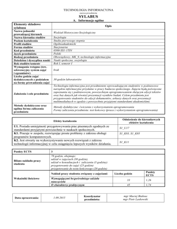 TECHNOLOGIA INFORMACYJNA nazwa przedmiotu SYLABUS A. Informacje ogólne Elementy składowe sylabusu Opis Nazwa jednostki prowadzącej kierunek Nazwa kierunku studiów Poziom kształcenia Profil studiów Forma studiów Kod przedmiotu Język przedmiotu Rodzaj przedmiotu Dziedzina i dyscyplina nauki Rok studiów/semestr Wymagania wstępne (tzw. sekwencyjny system zajęć i egzaminów) Liczba godzin zajęć dydaktycznych z podziałem na formy prowadzenia zajęć Wydział Historyczno-Socjologiczny Socjologia Studia pierwszego stopnia Ogólnoakademicki Stacjonarne 0500-SS1-1TIN Polski Obowiązkowy, MK_9, technologie informacyjne Nauki społeczne, socjologia Rok I, semestr I brak 30 godzin laboratoriów Założenia i cele przedmiotu Technologia informacyjna jest przedmiotem wprowadzającym studentów w podstawowe narzędzia informacyjne przydatne w pracy badacza społecznego. Zajęcia będą poświęcone zapoznaniu się z podstawowym, powszechnym oprogramowaniem służącym edycji tekstów oraz baz danych jak również prezentacji wyników badań. Celem przedmiotu jest przygotowanie studentów do edycji dokumentów, arkuszy danych oraz prezentacji multimedialnych w zgodzie z powszechnie przyjętymi standardami akademickimi. Metody dydaktyczne oraz ogólna forma zaliczenia przedmiotu Metody dydaktyczne: ćwiczenia z wykorzystaniem oprogramowania Formy zaliczenia przedmiotu: test końcowy (praca z wykorzystaniem oprogramowania) Odniesienie do kierunkowych efektów kształcenia Efekty kształcenia U1. Posiada umiejętność przygotowywania prac pisemnych zgodnych ze standardami przyjętymi powszechnie w naukach społecznych. K1. Pracuje w zespole, rozwiązując proste problemy z zakresu obsługi programów komputerowych. K2. Jest otwarty na wykorzystywanie nowych rozwiązań z zakresu technologii informacyjnej w celu osiągnięcia lepszych wyników działania. Punkty ECTS 3 Bilans nakładu pracy studenta 78 godzin, obejmuje: udział w zajęciach (30 godzin), udział w konsultacjach i zaliczeniu (3 godziny) przygotowanie do zajęć (25 godzin) przygotowanie do testu końcowego (20 godzin) Nakład pracy studenta związany z zajęciami: Wskaźniki ilościowe Data opracowania: Wymagającymi bezpośredniego udziału nauczyciela O charakterze praktycznym 1.09.2015 Koordynator przedmiotu: S1_U17 S1_K03, S1_K05 S1_K11 Liczba godzin Punkty ECTS 33 1,26 45 1,74 mgr Maciej Białous mgr Piotr Laskowski SYLABUS B. Informacje szczegółowe Elementy składowe sylabusu Nazwa przedmiotu Kod przedmiotu Nazwa kierunku Nazwa jednostki prowadzącej kierunek Język przedmiotu Rok studiów/ semestr Liczba godzin zajęć dydaktycznych oraz forma prowadzenia zajęć Liczba punktów ECTS Prowadzący Opis Technologia informacyjna 0500-SS1-1TIN Socjologia Wydział Historyczno-Socjologiczny, Instytut Socjologii Polski Rok I, semestr I 30 godzin laboratoriów 3 mgr Piotr Laskowski mgr Maciej Białous Treści merytoryczne przedmiotu MS Word Edycja dokumentów: formatowanie tekstu (czcionka, symbole, wyrównywanie, odstępy, podziały…), wyszukiwanie, numerowanie stron, wstawianie obiektów graficznych; Praca z tekstem: listy punktowane i numerowane kolumny, nagłówki i stopki, podpisy, przypisy; Style i szablony: typy, tworzenie, modyfikacja, usuwanie; Tabele: tworzenie, edytowanie i formatowanie tabel, pasek narzędzi Tabele i krawędzie, obramowanie i cieniowanie tabel; Konspekty, spisy treści i indeksy: tworzenie i modyfikowanie konspektów, spisów treści, spisów ilustracji, indeksów; Inne przydatne opcje: sprawdzanie pisowni, recenzowanie, zmiana wielkości liter, edytor równań, korespondencja seryjna; MS Excel Edycja arkuszy: zawartość komórki (wstawianie i usuwanie, kopiowanie), kopiowanie formuł, przenoszenie komórek, wycofywanie, powtarzanie i ponawianie operacji; Funkcje: budowa funkcji, argumenty funkcji, wprowadzanie funkcji; Formatowanie komórek; Wykresy oraz obiekty graficzne: pasek narzędzi rysowania, rysowanie i wstawianie obrazów, kreator wykresów, dane a wykres, legenda, etykiety danych, tabela danych, formatowanie elementów wykresu; Inne przydatne opcje: polecenie Autofiltr, filtry zaawansowane, sortowanie, blokowanie, szukaj wyniku, solver; MS PowerPoint Tworzenie Prezentacji: projektowanie, przejścia, animacje, wstawianie dźwięków, plików wideo i obrazów; Prezi Tworzenie Prezentacji: projektowanie, przejścia, animacje, wstawianie dźwięków, plików wideo i obrazów; Easel.ly Tworzenie infografiki; Efekty kształcenia wraz ze sposobem ich weryfikacji Efekt Weryfikacja U1. Posiada umiejętność przygotowywania prac pisemnych zgodnych ze standardami przyjętymi powszechnie w naukach społecznych. K1. Pracuje w zespole, rozwiązując proste problemy z zakresu obsługi programów komputerowych. K2. Jest otwarty na wykorzystywanie nowych rozwiązań z zakresu technologii informacyjnej w celu osiągnięcia lepszych wyników działania. Udział w zajęciach (ćwiczenia), test zaliczeniowy Forma i warunki Laboratoria z wykorzystaniem komputerów, ćwiczenia z wykorzystaniem zaliczenia przedmiotu Wykaz literatury podstawowej i uzupełniającej oprogramowania. Formą zaliczenia przedmiotu jest test końcowy oceniany w skali: Niedostateczna (2) Dostateczna (3) Dostateczna+ (3,5) Dobra (4) Dobra+ (4,5) Bardzo dobra (5) Warunkiem zaliczenia przedmiotu jest również obecność studenta na zajęciach (dopuszczalna 1 nieobecność w semestrze). B. Krzymowski, Word 2003 PL Poradnik dla nieinformatyków, Warszawa 2004. B. Krzymowski, Excel 2003 PL Poradnik dla nieinformatyków, Warszawa 2004. Instrukcje obsługi dostępne w formie elektronicznej, dołączonej do programów. ………………………………. podpis osoby składającej sylabus