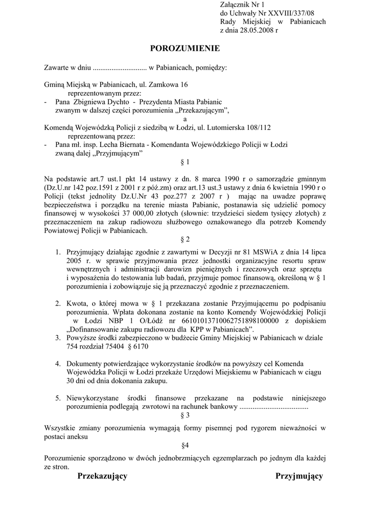 Załącznik Nr 1 do Uchwały Nr XXVIII/337/08 Rady Miejskiej w Pabianicach z dnia 28.05.2008 r POROZUMIENIE Zawarte w dniu ............................. w Pabianicach, pomiędzy: Gminą Miejską w Pabianicach, ul. Zamkowa 16 reprezentowanym przez: - Pana Zbigniewa Dychto - Prezydenta Miasta Pabianic zwanym w dalszej części porozumienia „Przekazującym”, a Komendą Wojewódzką Policji z siedzibą w Łodzi, ul. Lutomierska 108/112 reprezentowaną przez: - Pana mł. insp. Lecha Biernata - Komendanta Wojewódzkiego Policji w Łodzi zwaną dalej „Przyjmującym” §1 Na podstawie art.7 ust.1 pkt 14 ustawy z dn. 8 marca 1990 r o samorządzie gminnym (Dz.U.nr 142 poz.1591 z 2001 r z póź.zm) oraz art.13 ust.3 ustawy z dnia 6 kwietnia 1990 r o Policji (tekst jednolity Dz.U.Nr 43 poz.277 z 2007 r ) mając na uwadze poprawę bezpieczeństwa i porządku na terenie miasta Pabianic, postanawia się udzielić pomocy finansowej w wysokości 37 000,00 złotych (słownie: trzydzieści siedem tysięcy złotych) z przeznaczeniem na zakup radiowozu służbowego oznakowanego dla potrzeb Komendy Powiatowej Policji w Pabianicach. §2 1. Przyjmujący działając zgodnie z zawartymi w Decyzji nr 81 MSWiA z dnia 14 lipca 2005 r. w sprawie przyjmowania przez jednostki organizacyjne resortu spraw wewnętrznych i administracji darowizn pieniężnych i rzeczowych oraz sprzętu i wyposażenia do testowania lub badań, przyjmuje pomoc finansową, określoną w § 1 porozumienia i zobowiązuje się ją przeznaczyć zgodnie z przeznaczeniem. 2. Kwota, o której mowa w § 1 przekazana zostanie Przyjmującemu po podpisaniu porozumienia. Wpłata dokonana zostanie na konto Komendy Wojewódzkiej Policji w Łodzi NBP 1 O/Łódź nr 66101013710062751898100000 z dopiskiem „Dofinansowanie zakupu radiowozu dla KPP w Pabianicach”. 3. Powyższe środki zabezpieczono w budżecie Gminy Miejskiej w Pabianicach w dziale 754 rozdział 75404 § 6170 4. Dokumenty potwierdzające wykorzystanie środków na powyższy cel Komenda Wojewódzka Policji w Łodzi przekaże Urzędowi Miejskiemu w Pabianicach w ciągu 30 dni od dnia dokonania zakupu. 5. Niewykorzystane środki finansowe przekazane na podstawie niniejszego porozumienia podlegają zwrotowi na rachunek bankowy ..................................... §3 Wszystkie zmiany porozumienia wymagają formy pisemnej pod rygorem nieważności w postaci aneksu §4 Porozumienie sporządzono w dwóch jednobrzmiących egzemplarzach po jednym dla każdej ze stron. Przekazujący Przyjmujący