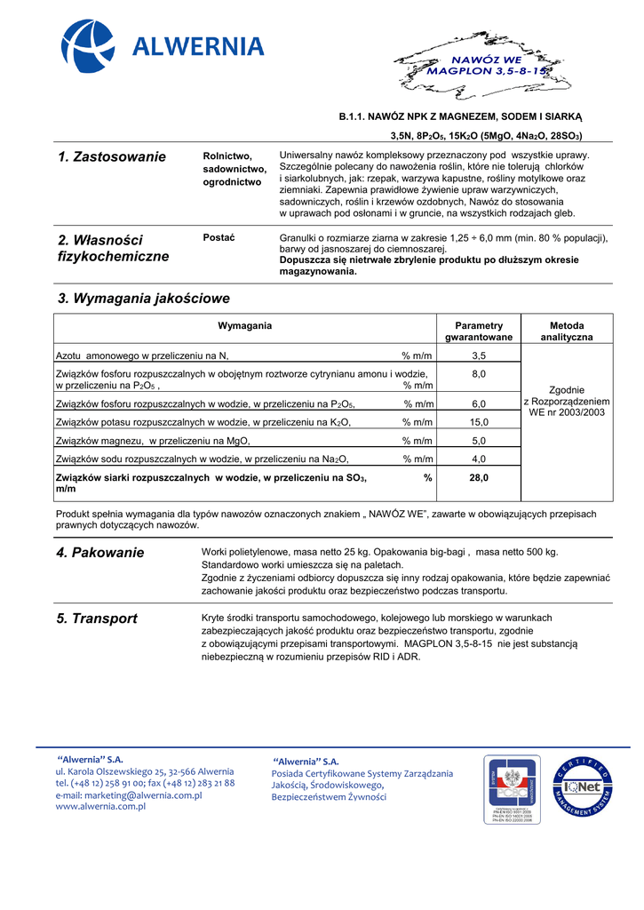 NAWÓZ WE MAGPLON 3,5-8-15 B.1.1. NAWÓZ NPK Z MAGNEZEM, SODEM I SIARKĄ 3,5N, 8P2O5, 15K2O (5MgO, 4Na2O, 28SO3) 1. Zastosowanie Rolnictwo, sadownictwo, ogrodnictwo Uniwersalny nawóz kompleksowy przeznaczony pod wszystkie uprawy. Szczególnie polecany do nawożenia roślin, które nie tolerują chlorków i siarkolubnych, jak: rzepak, warzywa kapustne, rośliny motylkowe oraz ziemniaki. Zapewnia prawidłowe żywienie upraw warzywniczych, sadowniczych, roślin i krzewów ozdobnych, Nawóz do stosowania w uprawach pod osłonami i w gruncie, na wszystkich rodzajach gleb. 2. Własności fizykochemiczne Postać Granulki o rozmiarze ziarna w zakresie 1,25 ÷ 6,0 mm (min. 80 % populacji), barwy od jasnoszarej do ciemnoszarej. Dopuszcza się nietrwałe zbrylenie produktu po dłuższym okresie magazynowania. 3. Wymagania jakościowe Wymagania Azotu amonowego w przeliczeniu na N, Parametry gwarantowane % m/m 3,5 Związków fosforu rozpuszczalnych w obojętnym roztworze cytrynianu amonu i wodzie, w przeliczeniu na P2O5 , % m/m 8,0 Związków fosforu rozpuszczalnych w wodzie, w przeliczeniu na P 2O5, % m/m 6,0 Związków potasu rozpuszczalnych w wodzie, w przeliczeniu na K 2O, % m/m 15,0 Związków magnezu, w przeliczeniu na MgO, % m/m 5,0 Związków sodu rozpuszczalnych w wodzie, w przeliczeniu na Na 2O, % m/m 4,0 % 28,0 Związków siarki rozpuszczalnych w wodzie, w przeliczeniu na SO3, m/m Metoda analityczna Zgodnie z Rozporządzeniem WE nr 2003/2003 Produkt spełnia wymagania dla typów nawozów oznaczonych znakiem „ NAWÓZ WE”, zawarte w obowiązujących przepisach prawnych dotyczących nawozów. 4. Pakowanie Worki polietylenowe, masa netto 25 kg. Opakowania big-bagi , masa netto 500 kg. Standardowo worki umieszcza się na paletach. Zgodnie z życzeniami odbiorcy dopuszcza się inny rodzaj opakowania, które będzie zapewniać zachowanie jakości produktu oraz bezpieczeństwo podczas transportu. 5. Transport Kryte środki transportu samochodowego, kolejowego lub morskiego w warunkach zabezpieczających jakość produktu oraz bezpieczeństwo transportu, zgodnie z obowiązującymi przepisami transportowymi. MAGPLON 3,5-8-15 nie jest substancją niebezpieczną w rozumieniu przepisów RID i ADR. “Alwernia” S.A. ul. Karola Olszewskiego 25, 32-566 Alwernia tel. (+48 12) 258 91 00; fax (+48 12) 283 21 88 e-mail: [email protected] www.alwernia.com.pl “Alwernia” S.A. Posiada Certyfikowane Systemy Zarządzania Jakością, Środowiskowego, Bezpieczeństwem Żywności 6. Magazynowanie Opakowania należy przechowywać w magazynach, w warunkach zabezpieczających jakość produktu oraz chroniących przed bezpośrednim działaniem słońca i zawilgoceniem, zgodnie z informacjami znajdującymi się na opakowaniu. 7. Certyfikaty Produkcja i sprzedaż wyrobu objęta jest : Systemem Zarządzania Jakością, certyfikowanym na zgodność z normą PN-EN ISO 9001, Systemem Zarządzania Środowiskowego, certyfikowanym na zgodność z normą PN-EN ISO 14001. 8. Termin trwałości 36 miesięcy od daty produkcji. www.alwernia.com.pl “Alwernia” S.A. ul. Karola Olszewskiego 25, 32-566 Alwernia tel. (+48 12) 258 91 00; fax (+48 12) 283 21 88 e-mail: [email protected] www.alwernia.com.pl Alwernia, 05.12.2014 “Alwernia” S.A. Posiada Certyfikowane Systemy Zarządzania Jakością, Środowiskowego, Bezpieczeństwem Żywności KK/29, wydanie 4
