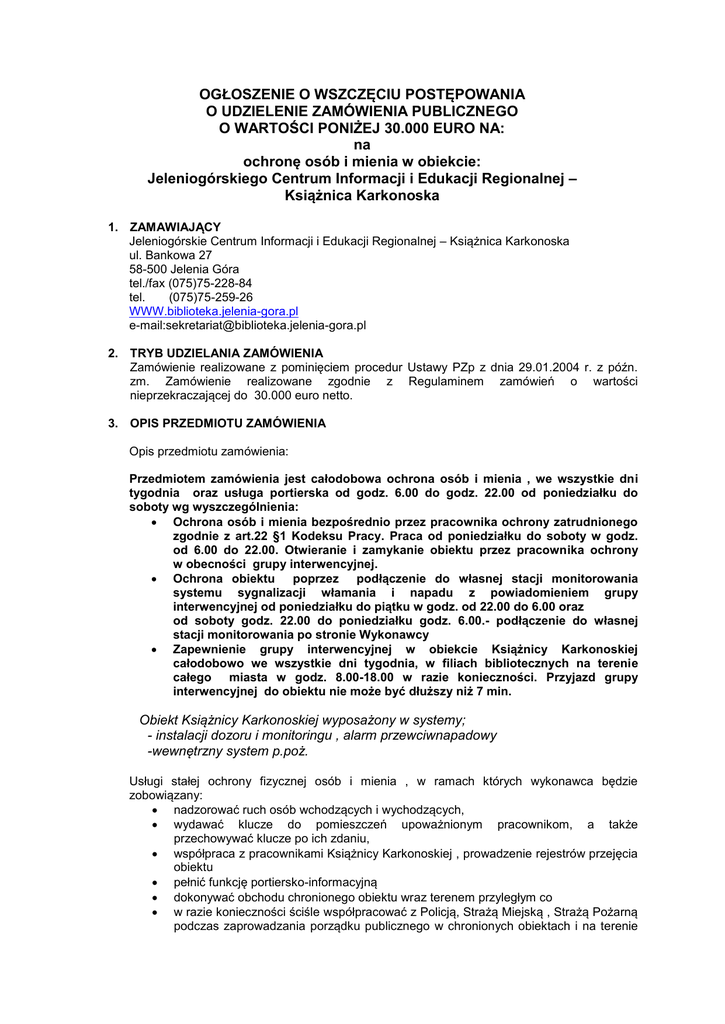 OGŁOSZENIE O WSZCZĘCIU POSTĘPOWANIA O UDZIELENIE ZAMÓWIENIA PUBLICZNEGO O WARTOŚCI PONIŻEJ 30.000 EURO NA: na ochronę osób i mienia w obiekcie: Jeleniogórskiego Centrum Informacji i Edukacji Regionalnej – Książnica Karkonoska 1. ZAMAWIAJĄCY Jeleniogórskie Centrum Informacji i Edukacji Regionalnej – Książnica Karkonoska ul. Bankowa 27 58-500 Jelenia Góra tel./fax (075)75-228-84 tel. (075)75-259-26 WWW.biblioteka.jelenia-gora.pl e-mail:[email protected] 2. TRYB UDZIELANIA ZAMÓWIENIA Zamówienie realizowane z pominięciem procedur Ustawy PZp z dnia 29.01.2004 r. z późn. zm. Zamówienie realizowane zgodnie z Regulaminem zamówień o wartości nieprzekraczającej do 30.000 euro netto. 3. OPIS PRZEDMIOTU ZAMÓWIENIA Opis przedmiotu zamówienia: Przedmiotem zamówienia jest całodobowa ochrona osób i mienia , we wszystkie dni tygodnia oraz usługa portierska od godz. 6.00 do godz. 22.00 od poniedziałku do soboty wg wyszczególnienia: Ochrona osób i mienia bezpośrednio przez pracownika ochrony zatrudnionego zgodnie z art.22 §1 Kodeksu Pracy. Praca od poniedziałku do soboty w godz. od 6.00 do 22.00. Otwieranie i zamykanie obiektu przez pracownika ochrony w obecności grupy interwencyjnej. Ochrona obiektu poprzez podłączenie do własnej stacji monitorowania systemu sygnalizacji włamania i napadu z powiadomieniem grupy interwencyjnej od poniedziałku do piątku w godz. od 22.00 do 6.00 oraz od soboty godz. 22.00 do poniedziałku godz. 6.00.- podłączenie do własnej stacji monitorowania po stronie Wykonawcy Zapewnienie grupy interwencyjnej w obiekcie Książnicy Karkonoskiej całodobowo we wszystkie dni tygodnia, w filiach bibliotecznych na terenie całego miasta w godz. 8.00-18.00 w razie konieczności. Przyjazd grupy interwencyjnej do obiektu nie może być dłuższy niż 7 min. Obiekt Książnicy Karkonoskiej wyposażony w systemy; - instalacji dozoru i monitoringu , alarm przewciwnapadowy -wewnętrzny system p.poż. Usługi stałej ochrony fizycznej osób i mienia , w ramach których wykonawca będzie zobowiązany: nadzorować ruch osób wchodzących i wychodzących, wydawać klucze do pomieszczeń upoważnionym pracownikom, a także przechowywać klucze po ich zdaniu, współpraca z pracownikami Książnicy Karkonoskiej , prowadzenie rejestrów przejęcia obiektu pełnić funkcję portiersko-informacyjną dokonywać obchodu chronionego obiektu wraz terenem przyległym co w razie konieczności ściśle współpracować z Policją, Strażą Miejską , Strażą Pożarną podczas zaprowadzania porządku publicznego w chronionych obiektach i na terenie do nich przylegającym, a także z innymi służbami w przypadku wystąpienia awarii, katastrof, losowych zagrożeń dla bezpieczeństwa osób i mienia, utrzymywać patrol interwencyjny 24 h w gotowości do natychmiastowego działania na wezwanie pracowników KK przy ul. Bankowej 27 i wykonawcy celem zatrzymania sprawcy przestępstwa dokonanego w chronionym obiekcie oraz na terenie przyległym, utrzymywać patrol interwencyjny w godz. 8.00 – 18.00 na wezwanie pracowników filii na terenie miasta wg wykazu: - Filia Nr 3 przy ul. Różyckiego 4 - Filia Nr 4 przy pl. Piastowskim 32 - Filia Nr 5 przy ul. Cieplickiej 172 - Filia Nr 6 przy ul. Wrocławskiej 71 - Filia Nr 7 przy ul. Noskowskiego 6/ 261 - Filia Nr 8 przy ul. Sygietyńskiego 7 i wykonawcy celem zatrzymania sprawcy przestępstwa dokonanego w chronionym obiekcie oraz na terenie przyległym, w przypadku alarmu do podjęcia czynności interwencyjno-zabezpieczających, mających na celu ochronę życia, zdrowia i mienia zamawiającego na terenie chronionego obiektu. Przedmiotem umowy będzie wykonywany zgodnie z przepisami o ochronie osób i mienia przez osoby umundurowane, zaopatrzone w czytelne identyfikatory, wyposażone w sprzęt osobisty ( środki łączności, środki ochrony osobistej itp.). Wykonawca sporządzi szczegółowy plan ochrony i instrukcje ochrony w uzgodnieniu z Zamawiającym. Wykonawca zapewni stałą łączność z osobą upoważnioną przez zamawiającego do wykonywania wszelkich czynności związanych z realizacją umowy. Wykonawca będzie ściśle współpracował z osobą upoważnioną przez zamawiającego do wykonywania wszelkich czynności związanych z realizacja umowy. 4. TERMIN REALIZACJI ZAMÓWIENIA Wymagany termin realizacji zamówienia : od 01 stycznia 2017 r. do 31 grudnia 2017 r. 5. DOKUMENTY Do oferty należy dołączyć następujące dokumenty i oświadczenia: Wypełniony formularz oferty Aktualne zaświadczenie z KRK Polisa CO od prowadzonej działalności o wartości min. 200.000 PLN ( kserokopia) Koncesja na wykonanie zadań związanych z ochroną osób i mienia w zakresie wymaganym ustawą z dnia 22 sierpnia 1997 r. o ochronie osób i mienia ( Dz.U. z 2005 r. Nr 145 , poz. 1221 z poźn. zm.) – kserokopia 6. KRYTERIA ORAZ SPOSÓB OCENY OFERT Wybór oferty najkorzystniejszej zostanie dokonany według kryterium : cena 60 % i warunki podłączenia do stacji monitorowania i czas przyjazdu grupy interwencyjnej 40 %. 7 min. -40 % 8 min.- 30% 9 min. -20 % 10 min.i powyżej – 10 % 7. TERMIN ZWIĄZANIA OFERTĄ Wykonawca pozostaje związany ofertą przez 30 dni. 8. MIEJSCE ORAZ TERMIN SKŁADANIA I OTWARCIA OFERT Oferty należy składać w siedzibie Zamawiającego : Jeleniogórskie Centrum Informacji i Edukacji Regionalnej – Książnica Karkonoska Ul. Bankowa 27 58-500 Jelenia Góra Sekretariat w godz. 8.00 – 15.00 Oferty należy złożyć najpóźniej do dnia 05 grudnia 2016 r. do godz. 10.00 Otwarcie ofert nastąpi w dniu 05 grudnia 2016 r. o godz. 10.30 w siedzibie Zamawiającego. 9. ZAŁĄCZNIKI: Wzór oferty Wzór umowy