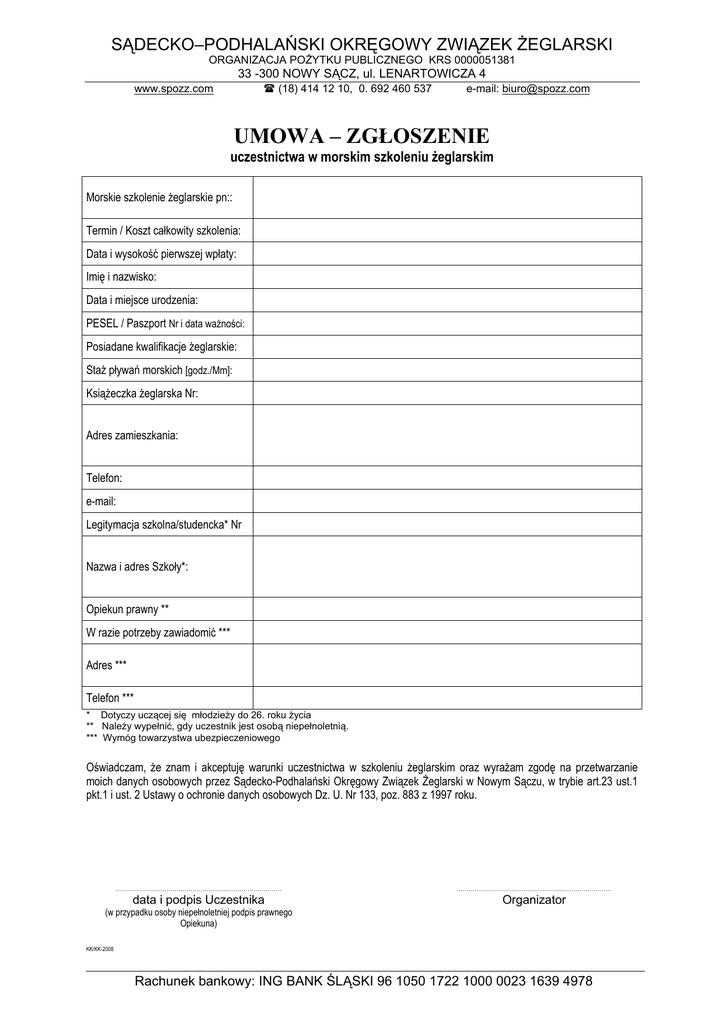 SĄDECKO–PODHALAŃSKI OKRĘGOWY ZWIĄZEK ŻEGLARSKI ORGANIZACJA POŻYTKU PUBLICZNEGO KRS 0000051381 33 -300 NOWY SĄCZ, ul. LENARTOWICZA 4 www.spozz.com (18) 414 12 10, 0. 692 460 537 e-mail: [email protected] UMOWA – ZGŁOSZENIE uczestnictwa w morskim szkoleniu żeglarskim Morskie szkolenie żeglarskie pn:: Termin / Koszt całkowity szkolenia: Data i wysokość pierwszej wpłaty: Imię i nazwisko: Data i miejsce urodzenia: PESEL / Paszport Nr i data ważności: Posiadane kwalifikacje żeglarskie: Staż pływań morskich [godz./Mm]: Książeczka żeglarska Nr: Adres zamieszkania: Telefon: e-mail: Legitymacja szkolna/studencka* Nr Nazwa i adres Szkoły*: Opiekun prawny ** W razie potrzeby zawiadomić *** Adres *** Telefon *** * Dotyczy uczącej się młodzieży do 26. roku życia ** Należy wypełnić, gdy uczestnik jest osobą niepełnoletnią. *** Wymóg towarzystwa ubezpieczeniowego Oświadczam, że znam i akceptuję warunki uczestnictwa w szkoleniu żeglarskim oraz wyrażam zgodę na przetwarzanie moich danych osobowych przez Sądecko-Podhalański Okręgowy Związek Żeglarski w Nowym Sączu, w trybie art.23 ust.1 pkt.1 i ust. 2 Ustawy o ochronie danych osobowych Dz. U. Nr 133, poz. 883 z 1997 roku. ………………………………………………………….…………… ………………………………..………………………………… data i podpis Uczestnika Organizator (w przypadku osoby niepełnoletniej podpis prawnego Opiekuna) KK/KK-2008 Rachunek bankowy: ING BANK ŚLĄSKI 96 1050 1722 1000 0023 1639 4978 SĄDECKO–PODHALAŃSKI OKRĘGOWY ZWIĄZEK ŻEGLARSKI ORGANIZACJA POŻYTKU PUBLICZNEGO KRS 0000051381 33 -300 NOWY SĄCZ, ul. LENARTOWICZA 4 www.spozz.com (18) 414 12 10, 0. 692 460 537 e-mail: [email protected] Warunki uczestnictwa w morskich szkoleniach żeglarskich organizowanych przez Sądecko-Podhalański Okręgowy Związek Żeglarski w Nowym Sączu §1 Zasady ogólne 1. Stronami niniejszej umowy jest Sądecko-Podhalański Okręgowy Związek Żeglarski z siedzibą w Nowym Sączu, zarejestrowany w Krajowym Rejestrze Sądowym prowadzonym przez Sąd Okręgowy Kraków-Śródmieście pod numerem 0000051381 jako organizacja pożytku publicznego, zwany dalej „Organizatorem” oraz biorący udział w szkoleniu lub w przypadku osoby niepełnoletniej jego prawny opiekun zwany dalej „ Uczestnikiem”. 2. Przed zgłoszeniem udziału w szkoleniu Uczestnik winien zapoznać się z niniejszymi warunkami uczestnictwa. 3. Podpisanie zgłoszenia jest równoznaczne z zawarciem umowy pomiędzy stronami. 4. Uczestnik deklaruje, iż jego stan zdrowia pozwala mu na wzięcie udziału w szkoleniu żeglarskim. 5. Osoby niepełnoletnie mogą brać udział w szkoleniu jedynie pod opieką innego pełnoletniego uczestnika lub za zgodą opiekuna, który w trakcie szkolenia przebywa z nim w charakterze osoby towarzyszącej i zapewnia mu opiekę poza portem / przystanią żeglarską. 6. Wszelkie reklamacje i skargi na przebieg szkolenia żeglarskiego powinny być zgłaszane pisemnie do 7.dni po zakończeniu szkolenia w siedzibie Organizatora. 7. Uczestnika zobowiązują zalecenia Kapitana jachtu / Kierownika Wyszkolenia Żeglarskiego / Instruktora w trakcie przebywania na wodzie i na terenie portu / przystani żeglarskiej oraz w pomieszczeniach prowadzonego szkolenia żeglarskiego. W drastycznych przypadkach Organizator zastrzega sobie prawo do rozwiązania umowy w trybie natychmiastowym bez możliwości refundacji jakichkolwiek kosztów poniesionych przez Uczestnika. §2 Warunki płatności 1. Uczestnik zostaje umieszczony na liście szkolenia po podpisaniu zgłoszenia i wpłaceniu zaliczki minimum 30% kosztów wybranego szkolenia, przynajmniej na 90.dni przed planowanym rozpoczęciem szkolenia żeglarskiego. 2. Pozostała należność winna być wpłacona przynamniej na 30.dni przed planowanym rozpoczęciem szkolenia żeglarskiego.. 3. Wpłat należy dokonywać na rachunek bankowy Sądecko-Podhalańskiego Okręgowego Związku Żeglarskiego, prowadzony przez ING BANK ŚLĄSKI 96 1050 1722 1000 0023 1639 4978 lub bezpośrednio u Organizatora. 4. Nieuregulowanie pełnej kwoty przez Uczestnika w terminie określonym w § 5 pkt 2, traktowane jest jako rezygnacja ze szkolenia i stanowi podstawę rozwiązania umowy. W tym przypadku mają zastosowanie zasady określone w § 5 pkt 2 niniejszych Warunków. §3 Odwołanie szkolenia Organizator zastrzega sobie możliwość odwołania szkolenia w przypadku braku odpowiedniej liczby uczestników. W takim przypadku Uczestnik otrzymuje propozycje udziału w szkoleniu w innym terminie lub zwrot dokonanych wpłat dotyczących odwołanego szkolenia. §4 Ubezpieczenie 1. Organizator zobowiązuje się ubezpieczyć Uczestnika od następstw nieszczęśliwych wypadków (NNW) 2. Dochodzenie roszczeń wynikających z ubezpieczenia następuje bezpośrednio przez Uczestnika w danym towarzystwie ubezpieczeniowym. §5 Rezygnacja z imprezy 1. Rezygnacja z udziału w szkoleniu może nastąpić jedynie w formie pisemnego oświadczenia dostarczonego do siedziby Organizatora. 2. Koszty rezygnacji z imprezy: a) w przypadku rezygnacji ze szkolenia, gdy pozostaje ponad 31.dni do rozpoczęcia szkolenia, Uczestnik obarczony jest utratą 10% ceny szkolenia. b) w przypadku rezygnacji ze szkolenia, gdy pozostaje 31.dni lub mniej do rozpoczęcia szkolenia, Uczestnik obarczony jest utratą 30% ceny szkolenia. c) w przypadku rezygnacji, w czasie trwania szkolenia, Uczestnik traci prawo zwrotu poniesionych kosztów szkolenia. 3. Uczestnik rezygnujący z udziału w szkoleniu może zaproponować na swoje miejsce inną osobę. Po uregulowaniu należności za szkolenie przez tę osobę, Uczestnikowi zwrócona zostanie wpłata pomniejszona o opłatę manipulacyjną w wysokości 30,- PLN. §6 Odpowiedzialność organizatora Organizator odpowiada za prawidłową realizację szkolenia zgodnie z wymogami stawianymi przez Polski Związek Żeglarski. §7 Postanowienia końcowe 1. W