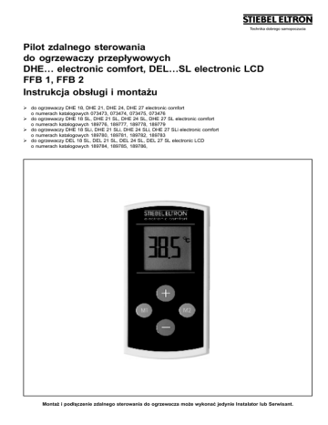 Technika dobrego samopoczucia Pilot zdalnego sterowania do ogrzewaczy przep³ywowych DHE… electronic comfort, DEL…SL electronic LCD FFB 1, FFB 2 Instrukcja obs³ugi i monta¿u ¾ do ogrzewaczy DHE 18, DHE 21, DHE 24, DHE 27 electronic comfort o numerach katalogowych 073473, 073474, 073475, 073476 ¾ do ogrzewaczy DHE 18 SL, DHE 21 SL, DHE 24 SL, DHE 27 SL electronic comfort o numerach katalogowych 189776, 189777, 189778, 189779 ¾ do ogrzewaczy DHE 18 SLi, DHE 21 SLi, DHE 24 SLi, DHE 27 SLi electronic comfort o numerach katalogowych 189780, 189781, 189782, 189783 ¾ do ogrzewaczy DEL 18 SL, DEL 21 SL, DEL 24 SL, DEL 27 SL electronic LCD o numerach katalogowych 189784, 189785, 189786, Monta¿ i pod³¹czenie zdalnego sterowania do ogrzewacza mo¿e wykonaæ jedynie Instalator lub Serwisant. 1 Spis treœci: Dane techniczne 2 1. 1.1 1.2 1.3 1.4 1.5 4 4 4 5 5 5 Instrukcja obs³ugi Opis urz¹dzenia Obs³uga Uchwyt œcienny Czyszczenie Wa¿na wskazówka 2. 2.1 2.2 2.3 2.4 2.5 Instrukcja monta¿u Budowa urz¹dzenia Przepisy i zalecenia Monta¿ urz¹dzenia Wy³¹czenie kodu nadajnika Wy³¹czenie akustycznego sygna³u odbioru 2.6 Przekazanie U¿ytkownikowi 5 5 5 5 6 6 3. Ochrona œrodowiska 6 4. Gwarancja 6 6 Dane techniczne Pilot zdalnego sterowania Wymiary (wys/szer./g³êb.) Ciê¿ar Czêstotliwoœæ nadawania Zakres nastaw temperatury Rodzaj ochrony 2 FFB mm kg MHz C O 130/65/17 0,12 433 30 - 60 IPX7 DHE .. SL(i), DEL .. SL(i) DHE 3 1. Instrukcja obs³ugi dla U¿ytkownika i Instalatora 1.1 Opis urz¹dzenia Piloty zdalnego sterowania FFB 1 i FFB 2 umo¿liwiaj¹ zdalne sterowanie drog¹ radiow¹ (433 MHz) elektronicznych ogrzewaczy przep³ywowych typu DHE…SL electronic comfort, DHE electronic komfort, DHE…SLi electronic komfort oraz DEL… electronic LCD firmy Stiebel Eltron. FFB 1 ¾ Pilot z nadajnikiem (1) ¾ Uchwyt œcienny z osprzêtem (2) ¾ Modu³ odbiornika (3) FFB 2 ¾ Pilot z nadajnikiem (1) ¾ Uchwyt œcienny z osprzêtem (2) Pilot zdalnego sterowania FFB 2 dzia³a tylko w po³¹czeniu z modu³em odbiornika FFB 1. Po zainstalowaniu zespo³u zdalnego sterowania FFB 1 ogrzewacz przep³ywowy mo¿e byæ sterowany poprzez pilota lub panel obs³ugowy ogrzewacza. Pilot z nadajnikiem jest wodoszczelny (IPX7), a tym samym mo¿e byæ u¿ywany zarówno w kabinach prysznicowych, jak i w wannach. Zasiêg dzia³ania pilota w budynku wynosi ok. 25 m. Dodatkowo do wyposa¿enia podstawowego modu³u FFB 1 mo¿liwe jest komunikowanie siê dalszych 5 pilotów FFB 2 (wyposa¿enie dodatkowe) z modu³em odbiornika zamontowanym w ogrzewaczu. Najwa¿niejsze w skrócie Dobór temperatury - w odstêpach co 0,5OC, w zakresie pomiêdzy 30OC i 60OC Przyciski pamiêci - zapamiêtywanie i przywo³anie przez U¿ytkownika 2 temperatur zadanych WskaŸnik koniecznoœci wymiany baterii 4 Poniewa¿ ka¿dy pilot z nadajnikiem posiada indywidualny kod nadawania, ka¿dy u¿ywany pilot FFB 2 musi zostaæ zg³oszony w module odbiornika (patrz pierwsze uruchomienie pilota FFB 2). W przypadku zestawu zdalnego sterowania FFB 1 kod nadawania pilota jest zgrany z nadajnikiem. Je¿eli ogrzewacz u¿ytkowany jest tylko z podstawowym wyposa¿eniem (pilot zdalnego sterowania i modu³ odbiornika) zgrywanie nie jest konieczne. 1.2 Obs³uga Panel obs³ugowy nadajnika znajduje siê normalnie w trybie oszczêdzania energii (wy³¹czony wyœwietlacz). Panel obs³ugowy zostaje uaktywniony poprzez krótkie naciœniêcie dowolnego przycisku (7). Je¿eli w stanie w³¹czenia nie nast¹pi naciœniêcie ¿adnego przycisku przez 20 sekund, pilot przechodzi ponownie automatycznie w tryb oszczêdzania energii. Je¿eli nast¹pi aktywacja przyciskiem " " lub " ", na wyœwietlaczu poka¿e siê ostatnio nastawiona zadana wartoœæ temperatury i zostanie przekazana do ogrzewacza. Zmiana temperatury zadanej mo¿e byæ dokonywana przyciskami " " / " ", w odstêpach co 0,5OC, lub szybko, poprzez naciœniêcie i przytrzymanie tych¿e przycisków. Je¿eli nast¹pi aktywacja poprzez naciœniêcie przycisków pamiêci , na wyœwietlaczu poka¿e siê odpowiednia temperatura zapamiêtana i zostanie przekazana do ogrzewacza. Ka¿da akceptowana przez ogrzewacz zmiana temperatury zadanej, zostanie potwierdzona sygna³em akustycznym z modu³u odbiornika wbudowanego w ogrzewacz. Sygna³ ten mo¿e zostaæ wy³¹czony przez Instalatora/Serwisanta, na ¿yczenie U¿ytkownika. 1.2.1 Wykorzystanie przycisków pamiêci W celu dokonania zmiany wartoœci temperatury zapamiêtanych pod przyciskami pamiêci nale¿y nastawiæ na wyœwietlaczu (6) ¿¹dan¹ wartoœæ zadan¹, nastêpnie nacisn¹æ i przytrzymaæ przez ok. 3 sekundy odpowiedni przycisk pamiêci. Krótkie migniêcie wskazania potwierdza zapamiêtanie temperatury. W przypadku u¿ycia kilku pilotów zdalnego sterowania, ka¿dy z nich posiada dwie w³asne pamiêci. W ten sposób pamiêci mog¹ zostaæ nastawione indywidualnie na ka¿dym pilocie. 1.2.2 Dynamiczna ochrona przed poparzeniem Przy u¿ywanie kilku pilotów zdalnego sterowania priorytet na wybór maksymalnej nastawialnej temperatury zadanej otrzymuje pilot, który wys³a³ sygna³ jako pierwszy. Priorytet ten obowi¹zuje przez 2 minuty podczas pobierania ciep³ej wody lub przez 2 minuty po jego zakoñczeniu i jest nastêpnie automatycznie wy³¹czany. W czasie trwania priorytetu pozosta³e piloty mog¹ jedynie zmniejszaæ temperaturê. Je¿eli temperatura zosta³a zmniejszona na ≤ 43OC w³¹czana jest dynamiczna ochrona prze poparzeniem tzn. ¿aden z pilotów nie mo¿e tej temperatury podwy¿szyæ powy¿ej 43OC. Przyk³ad: jeœli na jednym z pilotów pokazana zosta³a na wyœwietlaczu wartoœæ temperatury np. 55OC i przekazana do ogrzewacza, to podnosi on temperaturê wody tylko na 43OC. Poniewa¿ jak opisano powy¿ej nie ka¿da wartoœæ zadana zostaje przyjêta, w przypadku u¿ywania kilku pilotów zdalnego sterowania równoczeœnie, wartoœæ temperatury nastawiona rzeczywiœcie mo¿e ró¿niæ siê od wskazania na wyœwietlaczu pilota. Aktualn¹ 