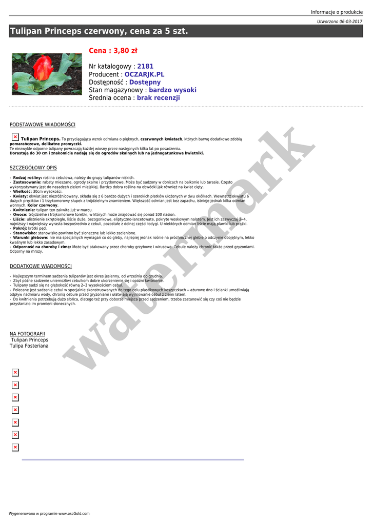 Informacje o produkcie Utworzono 06-03-2017 Tulipan Princeps czerwony, cena za 5 szt. Cena : 3,80 zł Nr katalogowy : 2181 Producent : OCZARJK.PL Dostępność : Dostępny Stan magazynowy : bardzo wysoki Średnia ocena : brak recenzji PODSTAWOWE WIADOMOŚCI SZCZEGÓŁOWY OPIS er m ar k Tulipan Princeps. To przyciągająca wzrok odmiana o pięknych, czerwonych kwiatach, których barwę dodatkowo zdobią pomarańczowe, delikatne promyczki. Te niezwykle odporne tulipany powracają każdej wiosny przez następnych kilka lat po posadzeniu. Dorastają do 30 cm i znakomicie nadają się do ogrodów skalnych lub na jednogatunkowe kwietniki. - Rodzaj rośliny: roślina cebulowa, należy do grupy tulipanów niskich. - Zastosowanie: rabaty mieszane, ogrody skalne i przydomowe. Może być sadzony w donicach na balkonie lub tarasie. Często wykorzystywany jest do nasadzeń zieleni miejskiej. Bardzo dobra roślina na obwódki jak również na kwiat cięty. - Wielkość: 30cm wysokości. - Kwiaty: okwiat jest niezróżnicowany, składa się z 6 bardzo dużych i szerokich płatków ułożonych w dwu okółkach. Wewnątrz okwiatu 6 dużych pręcików i 1 trzykomorowy słupek z trójdzielnym znamieniem. Większość odmian jest bez zapachu, istnieje jednak kilka odmian wonnych. Kolor czerwony. - Kwitnienie: tulipan ten zakwita już w marcu. - Owoce: trójdzielne i trójkomorowe torebki, w których może znajdować się ponad 100 nasion. - Liście: ulistnienie skrętoległe, liście duże, bezogonkowe, eliptyczno-lancetowate, pokryte woskowym nalotem. Jest ich zazwyczaj 2–4, najniższy i największy wyrasta bezpośrednio z cebuli, pozostałe z dolnej części łodygi. U niektórych odmian liście mają plamki lub prążki. - Pokrój: krótki pęd. - Stanowisko: stanowisko powinno być słoneczne lub lekko zacienione. - Warunki glebowe: nie ma specjalnych wymagań co do gleby, najlepiej jednak rośnie na próchnicznej glebie o odczynie obojętnym, lekko kwaśnym lub lekko zasadowym. - Odporność na choroby i zimę: Może być atakowany przez choroby grzybowe i wirusowe. Cebule należy chronić także przed gryzoniami. Odporny na mrozy. DODATKOWE WIADOMOŚCI w NA FOTOGRAFII Tulipan Princeps Tulipa Fosteriana at - Najlepszym terminem sadzenia tulipanów jest okres jesienny, od września do grudnia. - Zbyt późne sadzenie uniemożliwi cebulkom dobre ukorzenienie się i opóźni kwitnienie. - Tulipany sadzi się na głębokość równą 2–3 wysokościom cebul. - Polecane jest sadzenie cebul w specjalnie skonstruowanych do tego celu plastikowych koszyczkach – ażurowe dno i ścianki umożliwiają odpływ nadmiaru wody, chronią cebule przed gryzoniami i ułatwiają wyjmowanie cebul z ziemi latem. - Do kwitnienia potrzebują dużo słońca, dlatego też przy doborze miejsca przed sadzeniem, trzeba zastanowić się czy coś nie będzie przysłaniało im promieni słonecznych. Wygenerowano w programie www.oscGold.com DLACZEGO WARTO KUPIĆ ROŚLINY U NAS - Wszystkie cebule i kłącza staramy się dostarczać w bardzo dobrym stanie, zdrowe i zadbane. Dokładamy wszelkich starań, aby wygląd materiału sadzeniowego spełniał Państwa oczekiwania. Poza tym na większości stron naszych ofert na ostatnim zdjęciu poniżej przedstawiamy wygląd przykładowych rzeczywistych cebul oraz kłączy, aby każdy mógł zobaczyć co kupuje. - W okresie zimowym, wczesnowiosennym lub późnojesiennym możliwe są braki poszczególnych gatunków, co naturalnie związane jest z sezonem wegetacyjnym roślin. - Cebule, kłącza w ilościach jednostkowych przeważnie wysyłane są w kopertach bąbelkowych lub pudełkach kartonowych jako listy dla zminimalizowania kosztu wysyłki. W większych ilościach wysłane są jako paczki. - Cebule tulipanów sprzedawane są po 5 szt. w at er m ar k KONIECZNIE ZOBACZ