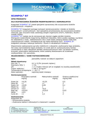 Data: 01.09.2014 Strona 1 z 2 SCANPOL® 87 OPIS PRODUKTU DLA OCZYSZCZANIA ŚCIEKÓW PRZEMYSŁOWYCH I KOMUNALNYCH Koagulant SCANPOL® 87 został specjalnie opracowany dla oczyszczania ścieków przemysłowych i miejskich. SCANPOL® 87 koagulant pomaga wytrącać zanieczyszczenia i metale ze ścieków komunalnych i przemysłowych. Jest specjalnie przystosowany do oczyszczania ścieków wówczas, gdy zrzucane wody zawierają związki organiczne (ChZT), fosforany, fluorki i metale ciężkie. SCANPOL® 87 nadaje się do okresowej jak również ciągłej obróbki ścieków. Wytrącone wodorotlenki mają formę stabilnych kłaczków, które szybko opadają i są łatwe do oddzielenia z wody. Zdekantowana ciecz znad osadu zawiera bardzo małą ilość rozpuszczonych metali i charakteryzuje się niską wartością ChZT. SCANPOL 87 koagulant znacząco redukuje fosforany i fluorki w obrabianych ściekach. Wspomniane zastosowania są tylko niektórymi z obszarów użytkowania tego produktu. Od czasu wprowadzenia tegoż produktu na rynek jest on wykorzystywany bardzo uniwersalnie w wielu obszarach obróbki zanieczyszczonych wód i są bardzo możliwe, przyszłe, potencjalne zastosowania, które zostaną dostosowane do oczekiwań użytkowników i ich warunków. WŁAŚCIWOŚCI / DANE FIZYKOCHEMICZNE Opis: jasnożółty roztwór ze słabym zapachem Skład chemiczny: Glin (AL+3) 4,2 ± 0,3% (procent ciężaru) Siarczany (SO4--) < 1% pH: < 2 ( trudno mierzyć pH ze względu na wysoką zasadowość) Ciężar właściwy: 1 340 ± 25 kg/m3 Temperatura krzepnięcia: < -20 ° C Data ważności: najmniej sześć miesięcy Zanieczyszczenia Przeciętna wartość mg/kg Maksymalna wartość mg/kg Granica analityczna mg/kg AAS Arsen As Ołow Pb Kadm Cd Miedź Cu Chrom Cr Rtęć Hg Nikiel Cynk Zn <0,25 <1 0,05 1 <0,5 <0,015 1 1,5 0,5 2 0,1 1 1 0,03 1 2 <0,25 <1 <0,05 <0,5 <0.5 <0,015 <0,5 <1 Zastosowanie Koagulant do: - Oczyszczania ścieków - Zwalczania bakterii nitkowatych w basenach i osadzie Adres SCANDRILL POLSKA S.C. ul. Czesława Niemena 4/31 81-603 GDYNIA, POLSKA Telefon/Fax 058-663 01 28 Mobil: 0501-798 877 lub 0508-816 074 www.scandrillpolska.pl ©Scandrill Polska SC VAT PL9581566669 [email protected] Data: 01.09.2014 Korzyści - redukcja ilości szlamu w porównaniu do innych produktów zawierających chlorek glinu - krótki czas obróbki - łatwe i dokładne dozowanie - mniejsze zakwaszenie środowiska wodnego PROCEDURA OBRÓBKI SCANPOL® 87 można dozować proporcjonalnie do albo czasowo. Tabela przeliczeniowa dla dozowań SCANPOL® 87 ml SP87/m3 g SP 87/m3 10 13,4 20 26,8 30 40,2 40 53,6 50 67,0 Strona 2 z 2 wielkości przepływu obrabianej wody Al g/m3 1,22 2,45 3,67 4,90 6,12 Aby przyspieszyć i ułatwić tworzenie się kłaczków można dozować flokulant SCANPOL® 55. Powinien on być dozowany również proporcjonalnie do wielkości przepływu obrabianej wody albo proporcjonalnie do wielkości dodawanego SCANPOL® 87. Skłaczkowany osad oddziela się w osadniku i póżniej jest on odwadniany w prasie filtracyjnej. Oddzielną ofertę dla instalacji do oczyszczania ścieków i pełne urządzenia do dozowania SCANPOL® produktów można uzyskać zgodnie z życzeniami. ŚRODKI OSTROŻNOŚCI PODCZAS STOSOWANIA Koagulant j SCANPOL® 87 jest roztworem kwaśnym i należy unikać dłuższych kontaktów ze skórą. Podczas pracy z produktem należy stosować normalne środki ostrożności. – Stosować ochronę oczu, rękawice ochronne i odpowiedni ubiór roboczy podczas pracy z roztworem. – W przypadku kontaktu z oczami, natychmiast przepłukać je dużą ilością wody i obowiązkowo uzyskać pomoc okulisty/lekarza. – W przypadku kontaktu ze skórą, przepłukać skażony obszar i obowiązkowo uzyskać pomoc dermatologa. – Zapoznać się z treścią Karty Charakterystyki produktu przed jego zastosowaniem. OPAKOWANIA Produkt SCANPOL® 87 sprzedaje się w beczkach 200 litrowych (268 kg) lub paletopojemnikach 1000 litrowych (1340 Kg). PRZECHOWYWANIE Produkt należy przechowywać w zbiornikach z tworzyw sztucznych odpornych na chlorki lub stali węglowej z wykładziną gumową. Zbiorniki do magazynowania produktu należy ochraniać przed bezpośrednim oddziaływaniem źródeł ciepła. Temperatura przechowywania: -20 – +30°C. Informacje zawarte w niniejszym dokumencie przedstawiają aktualny stan wiedzy i doświadczeń dotyczących stosowania tegoż produktu. Użytkownik ponosi całkowitą odpowiedzialność za prawidłowe zastosowanie produktu do określonych celów. Adres SCANDRILL POLSKA S.C. ul. Czesława Niemena 4/31 81-603 GDYNIA, POLSKA Telefon/Fax 058-663 01 28 Mobil: 0501-798 877 lub 0508-816 074 www.scandrillpolska.pl ©Scandrill Polska SC VAT PL9581566669 [email protected]