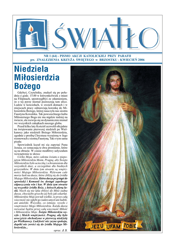 NR 1 (64) - PISMO AKCJI KATOLICKIEJ PRZY PARAFII pw. ZNALEZIENIA KRZYŻA ŚWIĘTEGO w BRZOSTKU - KWIECIEŃ 2006 Niedziela Miłosierdzia Bożego Gdybyś, Czytelniku, znalazł się po południu o godz. 15.00 w którymkolwiek z miast na Filipinach, spostrzegłbyś ze zdumieniem, że o tej porze niemal pustoszeją tam ulice. Ludzie w kościołach, w swoich domach i w miejscach pracy odmawiają koronkę do Miłosierdzia Bożego, której nauczyła nas siostra Faustyna Kowalska. Tak powszechnego kultu Miłosiernego Boga nie ma nigdzie indziej na świecie, ale rozwija się on dynamicznie niemal we wszystkich zakątkach naszego globu. Przed kilku laty Kościół zezwolił oficjalnie na świętowanie pierwszej niedzieli po Wielkanocy jako niedzieli Bożego Miłosierdzia, zgodnie z prośbą Chrystusa wyrażoną w Jego rozmowach z siostrą Faustyną. Tak o tym sama pisała: Spowiednik kazał mi się zapytać Pana Jezusa, co oznaczają te dwa promienie, które są na obrazie. W czasie modlitwy usłyszałam wewnętrznie te słowa: Córko Moja, mów całemu światu o niepojętym Miłosierdziu Moim. Pragnę, aby Święto Miłosierdzia było ucieczką i schronieniem dla wszystkich dusz, a szczególnie dla biednych grzeszników. W dniu tym otwarte są wnętrzności Mojego Miłosierdzia. Wylewam całe morze łask na dusze, które zbliżą się do źródła Mojego Miłosierdzia. Która dusza przystąpi do spowiedzi i Komunii św. dostąpi zupełnego odpuszczenia win i kar. W dniu tym otwarte są wszystkie źródła Boże, z których płyną łaski. Niech się nie lęka zbliżyć do Mnie żadna dusza, chociażby grzechy jej były jak szkarłat. Miłosierdzie Moje jest tak wielkie, że przez całą wieczność nie zgłębi go żaden umysł ani ludzki, ani anielski. Wszystko, co istnieje, wyszło z wnętrzności Mego Miłosierdzia. Każda dusza rozważać będzie przez całą wieczność Miłość i Miłosierdzie Moje. Święto Miłosierdzia wyszło z Moich wnętrzności. Pragnę, aby było uroczyście obchodzone w pierwszą niedzielę po Wielkanocy. Ludzkość nie zazna spokoju, dopóki nie zwróci się do źródła Mojego Miłosierdzia... oprac. J. S. KWIECIEŃ 2006 „ŚWIATŁO” Z życia parafii - Wielki Tydzień Niedziela Palmowa Misterium Męki Pańskiej w wykonaniu aktorów z parafii Gogołów Triduum Paschalne - Wielki Czwartek 2 KWIECIEŃ 2006 „ŚWIATŁO” 3 Św. Małgorzata Maria Alacoque – apostołka Najświętszego Serca Pana Jezusa Odpowiadajcie Mu zatem miłością na miłość i nigdy nie zapominajcie o Tym, którego miłość do was pchnęła aż do śmierci. Św. Małgorzata Maria Alacoque W poprzednim numerze „Światła” rozpoczęliśmy drukowanie cyklu artykułów poświęconych kultowi Najświętszego Serca Pana Jezusa. Radujemy się, że po zakończeniu roku Eucharystii, w naszej diecezji, decyzją ks. biskupa Kazimierza Górnego, rozpoczynamy rok szczególnej kontemplacji Bożego Serca. Ma ona służyć głębszemu uświadomieniu wielkiej miłości Boga, który ofiarował własnego Syna za nasze grzechy i przygotować nas do aktu intronizacji obrazu Najświętszego Serca Pana Jezusa. Boże Serce, wzywa każdego z nas do odpowiedzi całym życiem na Jego wezwanie: Przyjdźcie do Mnie wszyscy, którzy utrudzeni i obciążeni jesteście, a Ja was pokrzepię. Boski Zbawiciel wybrał świętą Małgorzatę Marię Alacoque na apostołkę nabożeństwa ku czci Swego Boskiego Serca. Dzięki skromnej i pobożnej zakonnicy z Paray-le-Monial, nabożeństwo do Najświętszego Serca Pana Jezusa rozpowszechniło się na cały świat, a ludzkość dowiedziała się o wielkim skarbcu miłości, jakim jest Serce Jezusa. *** Święta Małgorzata Alacoque urodziła się 22 lipca 1647 r. we francuskiej miejscowości Lauthecour jako piąte dziecko Klaudiusza, notariusza i sędziego królewskiego. Trzy dni później została ochrzczona. W wieku zaledwie czterech lat Małgorzata złożyła ślub dozgonnej czystości. Ojciec Małgorzaty zmarł wcześnie pozostawiając małżonkę z siedmiorgiem dzieci. W chwili śmierci ojca, nasza święta miała osiem lat. Oddano ją wtedy do kolegium klarysek urbanistek w Charolles. Ciężka choroba zmusiła jednak młodą Małgorzatę do powrotu do domu. Choroba trwała cztery długie lata, jednak to właśnie dzięki niej dziewczynka dojrzała duchowo. Małgorzata czuła wielki głód Boga. Jej pragnieniem było poświęcić się Najwyższemu. W wieku 24 lat wstąpiła do zakonu wizytek w miejscowości Paray-leMonial. Habit zakonny przywdziała Małgorzata 25 sierpnia 1671 r. W latach 1685-1687 była mistrzynią nowicjuszek. A ponadto dwa razy piastowała urząd asystentki przełożonej. Małgorzata zmarła w opinii świętości 17 października 1690 roku. promieni”. Chrystus powiedział do swej wybranki: „Oto Serce, które tak bardzo umiłowało ludzi, a w zamian za to otrzymuje wzgardę i zapomnienie. Ty przynajmniej staraj się mi zadośćuczynić, o ile to będzie w twojej mocy, za ich niewdzięczność”. Następnie Zbawiciel zażądał od Małgorzaty, by często przystępowała do Komunii świętej w pierwsze piątki miesiąca, a w każdą noc z czwartku na pierwszy piątek, by uczestniczyła w Jego konaniu śmiertelnym w Ogrójcu między godziną 23 a 24. *** *** Ostatnie objawienie miało miejsce w tej samej kaplicy w czasie oktawy Bożego Ciała 16 czerwca 1675 roku. Kiedy Święta klęczała przed tabernakulum, ukazał jej się Pan Jezus i powiedział: „Żądam, żeby pierwszy piątek po oktawie Bożego Ciała był odtąd poświęcony jako osobne święto na uczczenie mojego Serca i na wynagrodzenie mi przez Komunię świętą i inne praktyki pobożne za zniewagi, jakich doznaję, gdy w czasie oktawy jestem wystawiony na ołtarzach. W zamian za to obiecuję ci, że Serce moje wyleje hojne łaski na tych wszystkich, którzy w ten sposób Sercu memu oddadzą cześć lub przyczynią się do jej rozszerzenia”. Kiedy Małgorzata zapytała, jak może 
