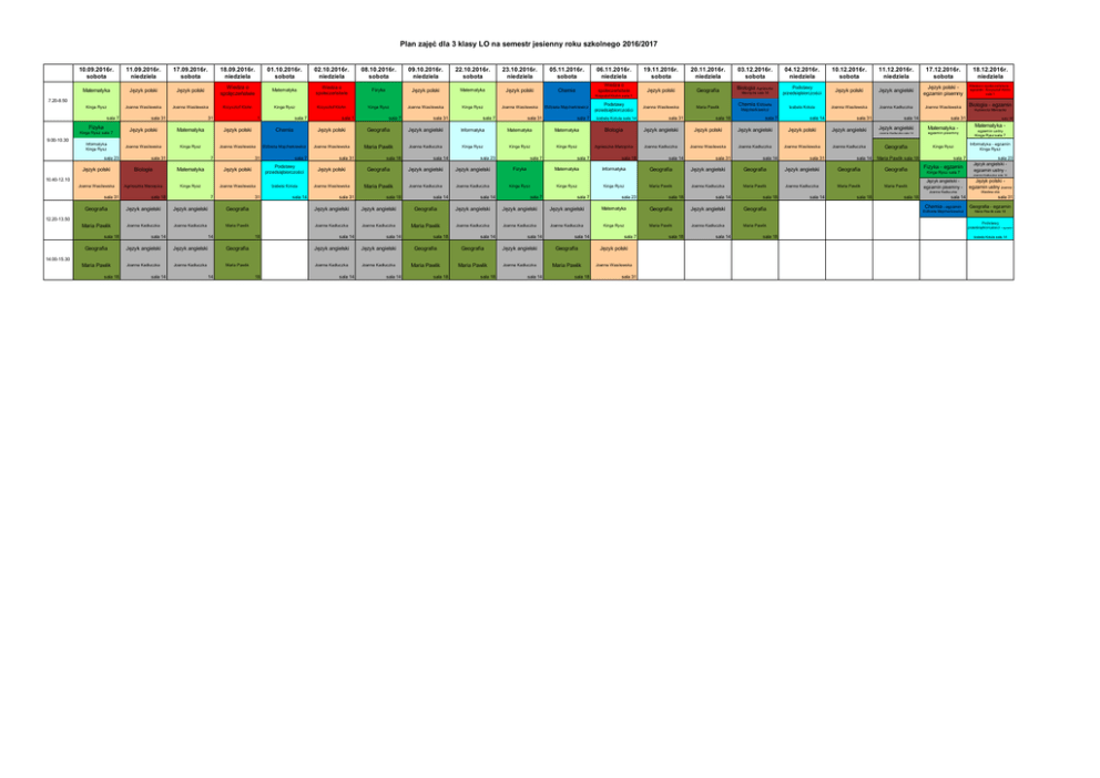 Plan zajęć dla 3 klasy LO na semestr jesienny roku szkolnego 2016