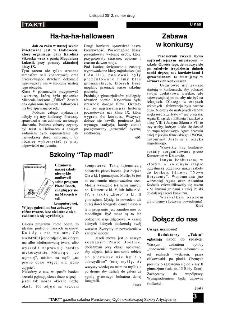 Listopad 2012, numer drugi U nas Ha-ha-ha-halloween Jak co roku w naszej szkole świętowane jest w Halloween, które organizuje pani Karolina Sikorska wraz z panią Magdaleną Łukasik przy pomocy aktualnej klasy IX. Tym razem nie tylko straszna atmosfera sali koncertowej oraz przeszywające strachem dekoracje wprowadziły nas w mroczny nastrój tego obrzędu. Klasa V postanowiła przygotować uwerturę, którą była piosenka Micheala Jacksona „Triller”. Została ona ogłoszona hymnem Halloween i ma być śpiewana co rok. Podczas całego wydarzenia odbyły się trzy konkursy. Pierwszy sprawdzał u nas zdolność uważnego słuchania. Podczas zabawy czytany był tekst o Halloween a naszym zadaniem było zapamiętanie jak największej ilości informacji, by później wykorzystać je przy odpowiedzi na pytania. Drugi konkurs sprawdzał naszą kreatywność. Poszczególne klasy prezentowały wybrane osoby, które przygotowały straszne, upiorne i czasem dziwne stroje. Pod koniec świętowania zostały wyprowadzone klasy najmłodsze (od I do III), ponieważ były prezentowane filmy klas gimnazjalnych, których treść mogłaby przerazić nasze szkolne pociechy. Produkcje gimnazjalistów podlegały również ocenie. Kryterium była straszność danego filmu. Okazało się, że najstraszniejszą historią poczęstowała nas klasa IX, która wygrała ów konkurs. Wszyscy dobrze się bawili, ponieważ jak wymaga tradycja, każdy został poczęstowany „strasznie” pyszną słodkością. eM Szkolny “Tap madl” Uczniowie naszej szkoły niezwykle umiłowali sobie program Photo Booth, znajdujący się na Mac-ach w sali komputerowej. W jego galerii można zobaczyć różne twarze, lecz niektóre z nich ewidentnie się wyróżniają. Galeria programu Photo booth, to idealne portfolio naszych uczniów. Ka ż dy z nas ma tam, CO NAJMNIEJ jedno zdjęcie, na którym ma albo zdeformowaną twarz, albo wyszed ł naprawd ę bardzo niekorzystnie. Mówi ą c, „co najmniej”, miałam na myśli „na pewno du ż o wi ę cej ni ż jedno zdjęcie”. Niektórzy z nas, w sposób bardzo szeroki pojmują słowa dużo więcej – jeżeli tak można określić liczbę oko ł o 100 zdj ę ć na ka ż dym komputerze. Tak ą tajemnicz ą bohaterką photo bootha, jest niejaka Ola z kl. I gimnazjum. Myślę, że jest to ewidentnie niepodważalna teza. Można wymienić też kilku innych, np. Klemens z kl. V, lub Julia z kl. IV, a tak ż e „Boro” z kl. II gimnazjum. Myślę, że powodem tak dużej ilości fotografii danych osób w tym programie jest zamiłowanie do modelingu. Być może są to ich codzienne sesje zdjęciowe, w czasie których których doskonalą swój warsztat. Życzymy im powodzenia w karierze modeli! Jeżeli mowa jest o naszym kochanym Photo Boothie, chciałabym przy okazji apelować, aby zdjęcia, jakie tam sobie robicie po pierwsze nie by ł y „obrzydliwe” (tutaj my ś l ę , ż e wszyscy wiedzą co mam na myśli), a po drugie aby trafiały do galerii za zgodą głównego bohatera danej fotografii. Justa Zabawa w konkursy Październik zwykle bywa najtrudniejszym miesiącem w szkole. Oprócz tego, że nauczyciele po zaledwie trzydziestu dniach nauki dręczą nas kartkówkami i sprawdzianami to startujemy w różnorakich konkursach. Uczniowie nie zawsze startują w konkursach, aby pokazać swoją dodatkową wiedzę, ale najzwyczajniej po to, aby nie być na lekcjach. Dlatego w etapach szkolnych frekwencja była bardzo duża. Niestety do następnych etapów większość z „artystów” nie przeszła. Agata Krząstek i Elżbieta Trzaskoś z klasy VIII i Justyna Sikora z VII to trzy osoby, którym udało się dostać do etapu rejonowego. Agata przeszła dalej z języka francuskiego i WOSu, natomiast Justyna z języka angielskiego. Wszystkie trzy konkursy z o s t a ł y z o rg a n i z o w a n e p r z e z Kuratorium w Krakowie. Innym konkursem, w którym w kolejnym etapie uczestniczą uczennice naszej szkoły do konkurs filmowy “Nowe Horyzonty”. Wspomniana już wcześniej Agata oraz Antonina Kudasik zakwalifikowały się razem z 51 innymi grupami z całej Polski do dalszej części konkursu. Wszystkim osobom gratulujemy i życzymy powodzenia! Ktoś Dołącz do nas Uwaga, uczniowie! Redaktorzy „Taktu” ogłaszają nabór do redakcji. Waszym zadaniem byłoby „donoszenie” różnych informacji – od realnych wydarzeń, przez ciekawostki, po plotki. Chętnych prosimy o zgłoszenia się do klasy II gimnazjum (sala nr. 15 Biały Dom). Zachęcamy do współpracy. Wynagrodzeniem będą zapewne słodkości. Justa “TAKT” gazetka szkolna Państwowej Ogólnokształcącej Szkoły Artystycznej 3