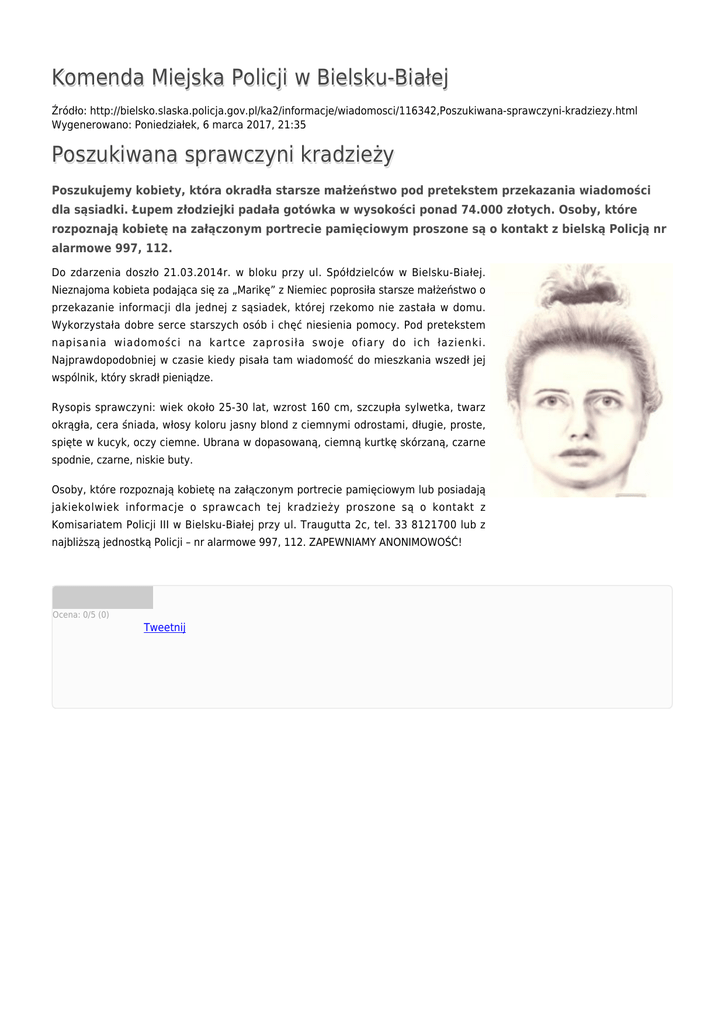 Komenda Miejska Policji w Bielsku-Białej Źródło: http://bielsko.slaska.policja.gov.pl/ka2/informacje/wiadomosci/116342,Poszukiwana-sprawczyni-kradziezy.html Wygenerowano: Poniedziałek, 6 marca 2017, 21:35 Poszukiwana sprawczyni kradzieży Poszukujemy kobiety, która okradła starsze małżeństwo pod pretekstem przekazania wiadomości dla sąsiadki. Łupem złodziejki padała gotówka w wysokości ponad 74.000 złotych. Osoby, które rozpoznają kobietę na załączonym portrecie pamięciowym proszone są o kontakt z bielską Policją nr alarmowe 997, 112. Do zdarzenia doszło 21.03.2014r. w bloku przy ul. Spółdzielców w Bielsku-Białej. Nieznajoma kobieta podająca się za „Marikę” z Niemiec poprosiła starsze małżeństwo o przekazanie informacji dla jednej z sąsiadek, której rzekomo nie zastała w domu. Wykorzystała dobre serce starszych osób i chęć niesienia pomocy. Pod pretekstem napisania wiadomości na kartce zaprosiła swoje ofiary do ich łazienki. Najprawdopodobniej w czasie kiedy pisała tam wiadomość do mieszkania wszedł jej wspólnik, który skradł pieniądze. Rysopis sprawczyni: wiek około 25-30 lat, wzrost 160 cm, szczupła sylwetka, twarz okrągła, cera śniada, włosy koloru jasny blond z ciemnymi odrostami, długie, proste, spięte w kucyk, oczy ciemne. Ubrana w dopasowaną, ciemną kurtkę skórzaną, czarne spodnie, czarne, niskie buty. Osoby, które rozpoznają kobietę na załączonym portrecie pamięciowym lub posiadają jakiekolwiek informacje o sprawcach tej kradzieży proszone są o kontakt z Komisariatem Policji III w Bielsku-Białej przy ul. Traugutta 2c, tel. 33 8121700 lub z najbliższą jednostką Policji – nr alarmowe 997, 112. ZAPEWNIAMY ANONIMOWOŚĆ! Ocena: 0/5 (0) Tweetnij