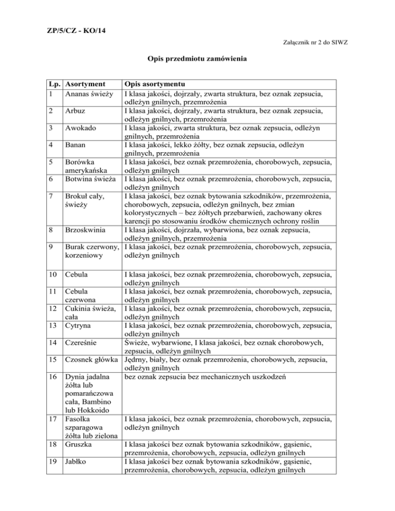 ZP/5/CZ - KO/14 Załącznik nr 2 do SIWZ Opis przedmiotu zamówienia Lp. Asortyment 1 Ananas świeży 2 3 4 5 6 7 8 9 10 11 12 13 14 15 16 17 18 19 Opis asortymentu I klasa jakości, dojrzały, zwarta struktura, bez oznak zepsucia, odleżyn gnilnych, przemrożenia Arbuz I klasa jakości, dojrzały, zwarta struktura, bez oznak zepsucia, odleżyn gnilnych, przemrożenia Awokado I klasa jakości, zwarta struktura, bez oznak zepsucia, odleżyn gnilnych, przemrożenia Banan I klasa jakości, lekko żółty, bez oznak zepsucia, odleżyn gnilnych, przemrożenia Borówka I klasa jakości, bez oznak przemrożenia, chorobowych, zepsucia, amerykańska odleżyn gnilnych Botwina świeża I klasa jakości, bez oznak przemrożenia, chorobowych, zepsucia, odleżyn gnilnych Brokuł cały, I klasa jakości, bez oznak bytowania szkodników, przemrożenia, świeży chorobowych, zepsucia, odleżyn gnilnych, bez zmian kolorystycznych – bez żółtych przebarwień, zachowany okres karencji po stosowaniu środków chemicznych ochrony roślin Brzoskwinia I klasa jakości, dojrzała, wybarwiona, bez oznak zepsucia, odleżyn gnilnych, przemrożenia Burak czerwony, I klasa jakości, bez oznak przemrożenia, chorobowych, zepsucia, korzeniowy odleżyn gnilnych I klasa jakości, bez oznak przemrożenia, chorobowych, zepsucia, odleżyn gnilnych Cebula I klasa jakości, bez oznak przemrożenia, chorobowych, zepsucia, czerwona odleżyn gnilnych Cukinia świeża, I klasa jakości, bez oznak przemrożenia, chorobowych, zepsucia, cała odleżyn gnilnych Cytryna I klasa jakości, bez oznak przemrożenia, chorobowych, zepsucia, odleżyn gnilnych Czereśnie Świeże, wybarwione, I klasa jakości, bez oznak chorobowych, zepsucia, odleżyn gnilnych Czosnek główka Jędrny, biały, bez oznak przemrożenia, chorobowych, zepsucia, odleżyn gnilnych Dynia jadalna bez oznak zepsucia bez mechanicznych uszkodzeń żółta lub pomarańczowa cała, Bambino lub Hokkoido Fasolka I klasa jakości, bez oznak przemrożenia, chorobowych, zepsucia, szparagowa odleżyn gnilnych żółta lub zielona Gruszka I klasa jakości bez oznak bytowania szkodników, gąsienic, przemrożenia, chorobowych, zepsucia, odleżyn gnilnych Jabłko I klasa jakości bez oznak bytowania szkodników, gąsienic, przemrożenia, chorobowych, zepsucia, odleżyn gnilnych Cebula 20 21 22 23 24 25 26 27 28 29 30 31 32 33 34 35 36 37 38 39 40 41 Kalafior cały, świeży Kapusta biała cała Kapusta czerwona cała Kapusta kiszona I klasa jakości bez oznak bytowania szkodników, gąsienic, przemrożenia, chorobowych, zepsucia, odleżyn gnilnych I klasa jakości, bez oznak przemrożenia, chorobowych, zepsucia, odleżyn gnilnych I klasa jakości, bez oznak przemrożenia, chorobowych, zepsucia, odleżyn gnilnych Chrupka, jędrna o charakterystycznym zapach kiszonej kapusty, kremowo-biała barwa, bez oznak gnilnych Kapusta młoda – I klasa jakości, bez oznak zepsucia, mechanicznych uszkodzeń, świeża, zmian gnilnych, chorobowych, zepsucia, wyraźnie zawiązana sezon VI-VIII główka kapusty Kapusta I klasa jakości, bez oznak przemrożenia, chorobowych, zepsucia, pekińska cala odleżyn gnilnych Kapusta włoska I klasa jakości, bez oznak przemrożenia, chorobowych, zepsucia, cała odleżyn gnilnych Kiwi I klasa jakości, bez oznak przemrożenia, chorobowych, zepsucia, odleżyn gnilnych Koper, 1 szt.= 1 Świeży, intensywnie zielony bez przebarwień, bez zmian pęczek= 50g. chorobowych i gnilnych Maliny I klasa jakości, bez oznak chorobowych, zepsucia, pleśni, odleżyn gnilnych Mandarynki I klasa jakości, bez oznak przemrożenia, chorobowych, zepsucia, odleżyn gnilnych Marchewka I klasa jakości, bez oznak przemrożenia, chorobowych, zepsucia, korzeniowa odleżyn gnilnych, bez szkodników Melony I klasa jakości, dojrzały, zwarta struktura, bez oznak zepsucia, odleżyn gnilnych, przemrożenia Nektarynka I klasa jakości, dojrzała, wybarwiona, bez oznak zepsucia, odleżyn gnilnych, przemrożenia Ogórek kiszony Chrupki, jędrna o charakterystycznym zapachu kiszonych ogórków, bez oznak gnilnych, pleśni Ogórek Chrupki, jędrna o charakterystycznym zapachu, bez oznak małosolny gnilnych, pleśni Ogórek I klasa jakości, bez oznak przemrożenia, chorobowych, zepsucia, szklarniowy, odleżyn gnilnych świeży (z wyłączeniem ogórków przeznaczonych do przetwórstwa i korniszonów) Papryka I klasa jakości, bez oznak przemrożenia, chorobowych, zepsucia, (czerwona, odleżyn gnilnych zielona, żółta) Pieczarka biała I klasa jakości, bez oznak przemrożenia, chorobowych, zepsucia, odleżyn gnilnych Pietruszka I klasa jakości, bez oznak przemrożenia, chorobowych, zepsucia, korzeniowa odleżyn gnilnych PietruszkaŚwieża, intensywnie zielona bez przebarwień, bez zmian natka, 1 szt.= 1 chorobowych i gnilnych pęczek= 50g. Pietruszka natka Świeża, intensywnie zielona bez przebarwień, bez zmian ozdobna chorobowych i gnilnych Pomarańcza I klasa jakości, dojrzała, wybarwiona, bez oznak zepsucia, odleżyn gnilnych, przemrożenia 42 43 44 45 46 47 48 49 51 52 53 54 55 56 57 58 59 60 61 I klasa jakości, bez oznak przemrożenia, chorobowych, zepsucia, odleżyn gnilnych Pomidor I klasa jakości, bez oznak przemrożenia, chorobowych, zepsucia, koktajlowy odleżyn gnilnych Por I klasa jakości, bez oznak przemrożenia, chorobowych, zepsucia, odleżyn gnilnych Rzodkiew biała/ I klasa jakości, bez oznak przemrożenia, chorobowych, zepsucia, rzepa biała odleżyn gnilnych (biały sopel) Rzodkiewka, Świeża, jędrna, bez oznak chorobowych, bez oznak bytowania wiązana w szkodników pęczki, 1 pęczek = 10-12 szt. Sałata masłowa, I klasa jakości, bez oznak przemrożenia, chorobowych, zepsucia, świeża odleżyn gnilnych Sałata lodowa I klasa jakości, bez oznak przemrożenia, chorobowych, zepsucia, cala odleżyn gnilnych Sałata ozdobna I klasa jakości, bez oznak przemrożenia, chorobowych, zepsucia, zielona i odleżyn gnilnych bordowa Sałata rukola, I klasa jakośc