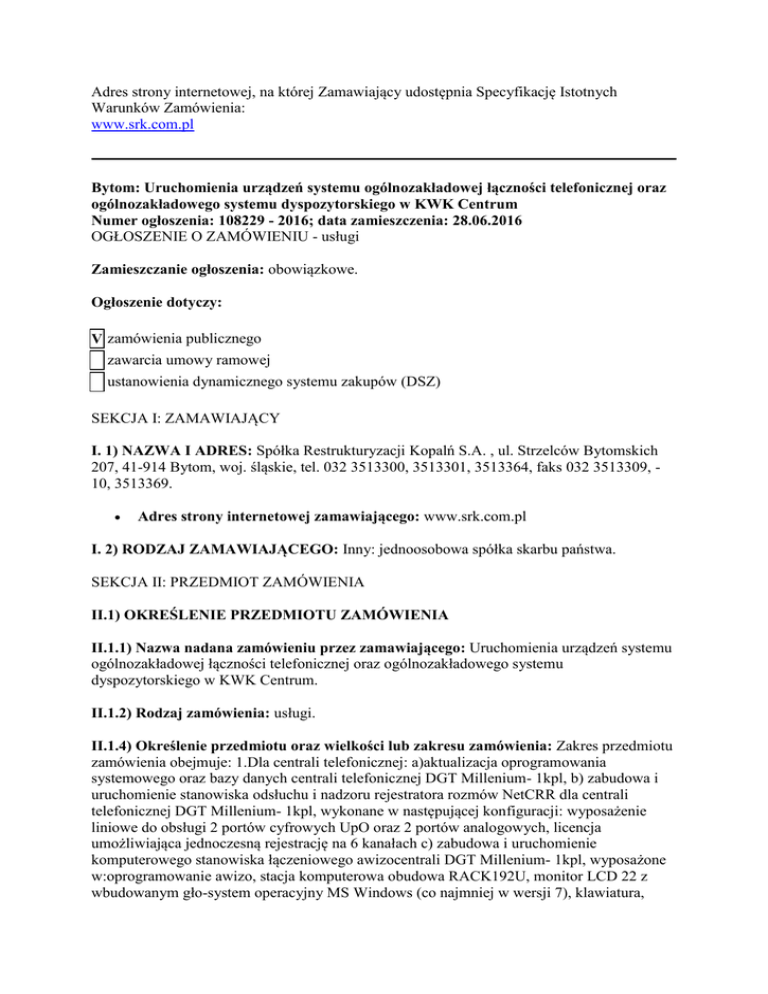Adres strony internetowej, na której Zamawiający udostępnia Specyfikację Istotnych Warunków Zamówienia: www.srk.com.pl Bytom: Uruchomienia urządzeń systemu ogólnozakładowej łączności telefonicznej oraz ogólnozakładowego systemu dyspozytorskiego w KWK Centrum Numer ogłoszenia: 108229 - 2016; data zamieszczenia: 28.06.2016 OGŁOSZENIE O ZAMÓWIENIU - usługi Zamieszczanie ogłoszenia: obowiązkowe. Ogłoszenie dotyczy: V zamówienia publicznego zawarcia umowy ramowej ustanowienia dynamicznego systemu zakupów (DSZ) SEKCJA I: ZAMAWIAJĄCY I. 1) NAZWA I ADRES: Spółka Restrukturyzacji Kopalń S.A. , ul. Strzelców Bytomskich 207, 41-914 Bytom, woj. śląskie, tel. 032 3513300, 3513301, 3513364, faks 032 3513309, 10, 3513369. Adres strony internetowej zamawiającego: www.srk.com.pl I. 2) RODZAJ ZAMAWIAJĄCEGO: Inny: jednoosobowa spółka skarbu państwa. SEKCJA II: PRZEDMIOT ZAMÓWIENIA II.1) OKREŚLENIE PRZEDMIOTU ZAMÓWIENIA II.1.1) Nazwa nadana zamówieniu przez zamawiającego: Uruchomienia urządzeń systemu ogólnozakładowej łączności telefonicznej oraz ogólnozakładowego systemu dyspozytorskiego w KWK Centrum. II.1.2) Rodzaj zamówienia: usługi. II.1.4) Określenie przedmiotu oraz wielkości lub zakresu zamówienia: Zakres przedmiotu zamówienia obejmuje: 1.Dla centrali telefonicznej: a)aktualizacja oprogramowania systemowego oraz bazy danych centrali telefonicznej DGT Millenium- 1kpl, b) zabudowa i uruchomienie stanowiska odsłuchu i nadzoru rejestratora rozmów NetCRR dla centrali telefonicznej DGT Millenium- 1kpl, wykonane w następującej konfiguracji: wyposażenie liniowe do obsługi 2 portów cyfrowych UpO oraz 2 portów analogowych, licencja umożliwiająca jednoczesną rejestrację na 6 kanałach c) zabudowa i uruchomienie komputerowego stanowiska łączeniowego awizocentrali DGT Millenium- 1kpl, wyposażone w:oprogramowanie awizo, stacja komputerowa obudowa RACK192U, monitor LCD 22 z wbudowanym gło-system operacyjny MS Windows (co najmniej w wersji 7), klawiatura, mysz,przedłużacz sygnałowy (EXTENDER ATEN), cyfrowy aparat systemowy typu DGT 3490LX (lub nowszy) d)zabudowa i uruchomienie telefonu systemowego łączeniowego awizo centrali DGT Millenium - 1kpl, wyposażony w:aparat cyfrowy systemowy DGT 3490LX z przystawką rozszerzającą DGT 4372 wraz z zasilaniem e)zabudowa i uruchomienie komputerowego stanowiska utrzymaniowego centrali DGT Millenium - 1kpl, wyposażony w: stacja komputerowa w wykonaniu RACK 1948U DC, monitor LCD 22, klawiatura, mysz f)zabudowa i uruchomienie komputerowego stanowiska edycji książki telefonicznej dla centrali DGT Millenium - 1kpl, wyposażony w: Platformę komputerową w wykonaniu RACK 192U, serwer usług dodatkowych (SUD), licencja na aplikację centralnej książki telefonicznej g)zabudowa i uruchomienie pulpitu łączności ogólnozakładowej DGT- 2kpl, wyposażone w: terminal dyspozytorski typu DGT 5810 wraz z oprogramowaniem 2.Dla systemu łączności alarmowo rozgłoszeniowej: a)zabudowa i uruchomienie stanowiska utrzymaniowego systemu Alarmowo - rozgłoszeniowego HETMAN A - 1kpl, wyposażone w: stacja komputerowa w wykonaniu RACK 19, monitor LCD 22, klawiatura, mysz b)zabudowa i uruchomienie pulpitu łączności dyspozytorskiej i alarmowo - rozgłoszeniowej - 2kpl. wyposażony w: terminal dyspozytorski DGT 5810- 10 wraz z oprogramowaniem do systemu alarmowania Hetman A opartego o serwer DGT Milenium (wykonanie NJ) 3.Dla systemu łączności iskrobezpiecznej: a)zabudowa telefonów dołowych - 122 szt. parametry urządzeń do zabudowy: Zasilanie: centralne z zespołów separacji iskrobezpiecznej ZSD (ZSI), Biegunowość linii abonenckiej: dowolna, Pamięci numerów: powtarzanie ostatniego numeru - do 32 cyfr, pamięć z dostępem bezpośrednim- 3 x 16cyfr, pamięć z dostępem pośrednim -10x16cyfr , Sygnał optyczny przywołania: widoczny z dużej odległości, Stopień ochrony obudowy:IP65; Gabaryty obudowy:275x140x90 mm, Masa: ok. 2.5 kg, Zakres temp. pracy: od -40 do +40° C. 4.Dla systemu wspomagania dyspozytora THOR: a)zabudowa i uruchomienie serwera bazodanowego systemu wspomagania dyspozytora THOR 1kpl, wyposażonego w: Serwer Dell R530 + baza danych systemu THOR b) zabudowa i uruchomienie serwera lustrzanego systemu wspomagania dyspozytora THOR 1kpl, wyposażonego w: Serwer Dell R530 + baza danych systemu THOR c) zabudowa i uruchomienie stanowiska dyspozytorskiego systemu wspomagania dyspozytora THOR 1kpl, wyposażonego w:Komputer stacjonarny Dell OptiPlex 9020 + oprogramowanie systemu THOR d)zabudowa i uruchomienie stanowiska utrzymaniowego systemu wspomagania dyspozytora THOR 1kpl, wyposażonego w:Komputer stacjonarny Dell OptiPlex 9020 + oprogramowanie systemu THOR e)zabudowa i uruchomienie stacji roboczych systemu wspomagania dyspozytora THOR 7kpl, wyposażonego w:Komputer stacjonarny Inspiron 3847 + oprogramowanie systemu THOR f)uruchomienie systemu wspomagania dyspozytora THOR 1kpl, 5.Dla urządzeń obiektowych przynależnych do centrali metanometrycznej CMC 5: a)zabudowa i uruchomienie centralek dołowych MKS 2 (kontrola sygnałów dwustanowych) 20szt, wyposażonych w:Modemowy koncentrator sygnałów do współpracy z czujnikami cyfrowymi i analogowymi z wyjściem 0,4-2,0V. Transmisja zewnętrzna: linia telemetryczna modemowa lub magistrala RS-485 b)włączenie centralek MKS- 2 do systemu kontroli sygnałów dwustanowych- 20szt, c)podłączenie czujników kontroli sygnałów dwustanowych do centralek MKS- 2 z istniejącego systemu CTT 32 - 60szt. 6.Zabudowa i uruchomienie systemu łączności do kierowania akcją ratowniczą SKAR- 1kpl. wyposażonego w:Centrala telefoniczna IPL-256, Aparat systemowe, analogowe lub IP, System nagrywania i archiwizacji rozmów, Bramki GSM dla syst. powiadamianie, Stanowiska komputerowe, Urządzenia peryferyjne Multi Audio i Multi Switch , Systemowe, indywidualne urządzenia do nasłuchu prowadzonych rozmów, w trybie głośnomówiącym i dyskretnym, SMS-owy system p