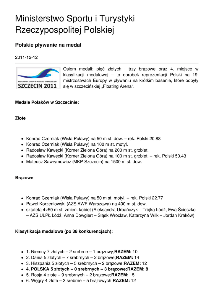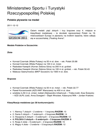 Ministerstwo Sportu i Turystyki Rzeczypospolitej Polskiej Polskie pływanie na medal 2011-12-12 Osiem medali: pięć złotych i trzy brązowe oraz 4. miejsce w klasyfikacji medalowej – to dorobek reprezentacji Polski na 19. mistrzostwach Europy w pływaniu na krótkim basenie, które odbyły się w szczecińskiej „Floating Arena". Medale Polaków w Szczecinie: Złote Konrad Czerniak (Wisła Puławy) na 50 m st. dow. – rek. Polski 20.88 Konrad Czerniak (Wisła Puławy) na 100 m st. motyl. Radosław Kawęcki (Korner Zielona Góra) na 200 m st. grzbiet. Radosław Kawęcki (Korner Zielona Góra) na 100 m st. grzbiet. – rek. Polski 50.43 Mateusz Sawrymowicz (MKP Szczecin) na 1500 m st. dow. Brązowe Konrad Czerniak (Wisła Puławy) na 50 m st. motyl. – rek. Polski 22.77 Paweł Korzeniowski (AZS AWF Warszawa) na 400 m st. dow. sztafeta 4×50 m st. zmien. kobiet (Aleksandra Urbańczyk – Trójka Łódź, Ewa Ścieszko – AZS UŁPŁ Łódź, Anna Dowgiert – Śląsk Wrocław, Katarzyna Wilk – Jordan Kraków) Klasyfikacja medalowa (po 38 konkurencjach): 1. Niemcy 7 złotych – 2 srebrne – 1 brązowy;RAZEM: 10 2. Dania 5 złotych – 7 srebrnych – 2 brązowe; RAZEM: 14 3. Hiszpania 5 złotych – 5 srebrnych – 2 brązowe;RAZEM: 12 4. POLSKA 5 złotych – 0 srebrnych – 3 brązowe;RAZEM: 8 5. Rosja 4 złote – 9 srebrnych – 2 brązowe; RAZEM: 15 6. Węgry 4 złote – 3 srebrne – 5 brązowych;RAZEM: 12 7. Włochy 3 złote – 2 srebrne – 4 brązowe;RAZEM: 9 8. Ukraina 3 złote – 0 srebrnych – 1 brązowy;RAZEM: 4 9. Słowenia 1 złoty – 2 srebrne – 0 brązowych; RAZEM: 3 10. Norwegia 1 złoty – 0 srebrnych – 1 brązowy; RAZEM: 2 11. W. Brytania 0 złotych – 4 srebrne – 5 brązowych; RAZEM: 9 12. Estonia 0 złotych – 1 srebrny – 2 brązowe;RAZEM: 3 13. Austria 0 złotych – 1 srebrny – 0 brązowych; RAZEM: 1 Francja 0 złotych – 1 srebrny – 0 brązowych; RAZEM: 1 Szwajcaria 0 złotych – 1 srebrny – 0 brązowych; RAZEM: 1 16. Belgia 0 złotych – 0 srebrnych – 3 brązowe;RAZEM: 3 Białoruś 0 złotych – 0 srebrnych – 3 brązowe; RAZEM: 3 18. Izrael 0 złotych – 0 srebrnych – 2 brązowe; RAZEM: 2 19. Czechy 0 złotych – 0 srebrnych – 1 brązowy;RAZEM: 1 Irlandia 0 złotych – 0 srebrnych – 1 brązowy; RAZEM: 1