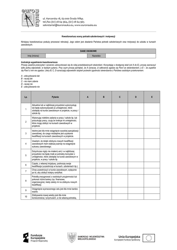 ul. Harcerska 18, 63-000 Środa Wlkp. tel./fax (61) 28 64 964, (61) 28 64 965 [email protected], www.euronauka.eu Kwestionariusz oceny potrzeb szkoleniowych i motywacji Niniejszy kwestionariusz posłuży procesowi rekrutacji. Jego celem jest zbadanie Państwa potrzeb szkoleniowych oraz motywacji do udziału w kursach zawodowych. DANE OSOBOWE Imię (imiona) Nazwisko Instrukcja wypełniania kwestionariusza Proszę uważnie przeczytać i szczerze ustosunkować się do niżej przedstawionych stwierdzeń. Korzystając z dostępnej skali (od A do E), proszę zaznaczyć tylko jedną odpowiedź, w każdym pytaniu. Przy czym proszę pamiętać, że A oznacza, iż całkowicie zgadza się Pan/i ze stwierdzeniem, a E – że zupełnie się Pan/i z nim nie zgadza. Litery B, C, D oznaczają odpowiedni stopień pośredni zgodności stwierdzenia z Państwa osobistym przekonaniem. A - zdecydowanie tak B - raczej tak C - nie mam zdania D - raczej nie E - zdecydowanie nie Lp. Pytanie 1 Aktualnie lub w najbliższej przyszłości wykorzystuję lub będę wykorzystywał(-a) umiejętności, które zdobędę na kursie zawodowym w projekcie, w pracy / szkole itp. 2 Wykonując niektóre zadania w pracy / szkole itp. lub poszukując pracy, czuję że brakuje mi umiejętności, które mogę zdobyć na kursach zawodowych w projekcie. 3 Istotne jest dla mnie osiągnięcie wysokiej specjalizacji zawodowej, do czego niezbędne jest uzyskanie kwalifikacji na kursach zawodowych w projekcie. 4 Uważam, że dzięki zdobyciu nowych kwalifikacji zawodowych mam większą szansę na osiągnięcie sukcesu zawodowego. 5 Dotychczas nigdy nie miałem(-am) i w najbliższej przyszłości nie będę miał(-a) potrzeby korzystać z umiejętności, które zdobędę na kursie zawodowym w projekcie, w pracy / szkole itp. 6 7 8 9 10 Często, z własnej inicjatywy, podnoszę swoje kwalifikacje (uczestniczę w kursach, szkoleniach itp.). Chcę uczestniczyć w kursie zawodowym, wyłącznie po to, aby zdobyć kolejny certyfikat. Potrafię zrezygnować z osobistych przyjemności lub pokonać różne bariery (np. finansowe, organizacyjne), kiedy zależy mi na zdobyciu nowych kwalifikacji. Osiągnięcie wyznaczonego celu jest dla mnie bardzo ważne. Zdobywanie nowej wiedzy jest dla mnie koniecznością / przymusem, a nie własną potrzebą. A B C D E