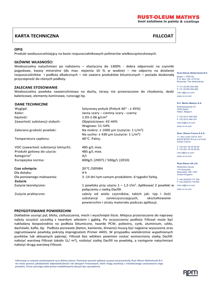 KARTA TECHNICZNA FILLCOAT OPIS Produkt wodouszczelniający na bazie rozpuszczalnikowych polimerów wielkocząsteczkowych. GŁÓWNE WŁASNOŚCI Wodoszczelny natychmiast po nałożeniu – elastyczny do 1300% - dobra odporność na czynniki pogodowe, kwasy mineralne (do max. stężenia 10 % w wodzie) – nie odporny na działanie rozpuszczalników i podłoży alkalicznych – nie zawiera produktów bitumicznych – posiada doskonałą przyczepność do różnych podłoży. Rust-Oleum Netherlands B.V. ZALECANE STOSOWANIE T +31 (0)165 593 636 F +31 (0)165 593 600 Wodoszczelna powłoka nawierzchniowa na dachy, tarasy nie przeznaczone do chodzenia, deski kalenicowe, elementy kominowe, rurociągi itp. Temperatura zapłonu: Satynowy połysk (Połysk 60 : ± 45%) Jasny szary – ciemny szary - czarny 1.03-1.06 g/cm³ Objętościowo: 42-44% Wagowo: 51-54% Na mokro: ± 1000 µm (zużycie: 1 L/m²) Na sucho: ± 430 µm (zużycie: 1 L/m²) 40C. Palny. VOC (zawartość substancji lotnych): Produkt gotowy do użycia: Kategoria” Europejska norma: 485 g/L max. 485 g/L max. A/i 600g/L (2007) / 500g/L (2010) Zalecana grubość powłoki: [email protected] www.ro-m.com N.V. Martin Mathys S.A. DANE TECHNICZNE Wygląd: Kolor: Gęstość: Zawartość substancji stałych: Braak 1, 4704 RJ P.O. Box 138, 4770 AC Rosendal, The Netherlands Kolenbergstraat 23 3545 Zelem Halen, Belgium T +32 (0)13 460 200 F +32 (0)13 460 201 [email protected] www.ro-m.com Rust -Oleum France S.A.S 11, Rue Jules Verne, B.P. 60039 95322 St-Leu-La-Foret Cedex France T +33 (0)1 30 40 00 44 F +33 (0)1 30 40 99 80 [email protected] www.ro-m.com Rust-Oleum UK Ltd. Czas schnięcia: Dla dotyku: Dla ponownego malowania: Zużycie Zużycie teoretyczne: Zużycie praktyczne: o 20 C /50%RH 4h 3 -14 dni tym samym produktem. 6 tygodni farbą. Rotterdam House 116 Quayside Newcastle, NE1 3DY United Kingdom T +44 (0)2476 717 329 F +44 (0)2476 718 930 2 1 powłoka przy użyciu 1 – 1,5 l/m . Aplikować 2 powłoki w połączeniu z siatką Dacfill. zależy od wielu czynników, takich jak: typ i ilość substancji zanieczyszczających, ukształtowanie powierzchni i straty materiału podczas aplikacji. PRZYGOTOWANIE POWIERZCHNI Dokładnie usunąć pył, błoto, zatłuszczenia, mech i wyschnięte liście. Miejsca przeznaczone do naprawy należy oczyścić szczotką z twardym włosiem i gąbką. Po oczyszczeniu podłoża Fillcoat może być nakładany bezpośrednio na podłoża bitumiczne, twarde PCW, poliestry, cynk, aluminium, szkło, dachówki, kafle, itp. Podłoża porowate (beton, kamienie, drewno) muszą być najpierw wysuszone oraz zagruntowane powłoką pokrytą impregnatem Primer 44HS. W przypadku wielokrotnie wypełnianych punktów lub aktywnych pęknięć, Fillcoat bez włókien powinien zostać wzmocniony siatką Dacfill: nałożyć warstwę Fillcoat (około 1L/ m2), rozłożyć siatkę Dacfill na powłokę, a następnie natychmiast nałożyć drugą warstwę Fillcoat. Informacje tu zawarte przekazywane są w dobrej wierze. Ponieważ warunki aplikacji są poza naszą kontrolą, Rust-Oleum Netherlands B.V. nie może ponosić jakiejkolwiek odpowiedzialności lub obciążeń finansowych, które mogą wyniknąć z niewłaściwego zastosowania tego produktu. Firma zastrzega sobie prawo modyfikowania danych bez uprzedzenia. [email protected] www.ro-m.com SPOSÓB UŻYCIA W calu zapewnienia jednolitości, produkt powinien zostać dokładnie wymieszany przed użyciem. ROZCIEŃCZANIE I APLIKACJA Pędzel: Nie rozcieńczać. Wałek: Nie rozcieńczać. Natrysk powietrzny: Nie zalecany. Natrysk bezpowietrzny: Nie rozcieńczać. Dysza: 18 – 23. Ciśnienie natrysku: 220 atm. Czyszczenie: Rozcieńczalnik 22 lub benzyna lakowa. Rust-Oleum Netherlands B.V. Braak 1, 4704 RJ P.O. Box 138, 4770 AC Rosendal, The Netherlands T +31 (0)165 593 636 F +31 (0)165 593 600 [email protected] www.ro-m.com WARUNKI APLIKACJI Produkt może być nakładany w każdych warunkach pogodowych z wyjątkiem opadów śniegu. UWAGI Podkład poprawiający przyczepność na Dac Alu. Możliwość przemalowania z użyciem Dacfill, Powłoka PRT lub Dac Alu. Nigdy nie aplikować produktu na izolacje polistyrenowe lub na nowy beton (beton musi mieć co najmniej 2 lata). Nie aplikować Fillcoat jako podkład pod Dac Hydro Alu. WARUNKI BEZPIECZEŃSTWA Zapoznać się z informacjami w ulotce i na puszce. N.V. Martin Mathys S.A. Kolenbergstraat 23 3545 Zelem Halen, Belgium T +32 (0)13 460 200 F +32 (0)13 460 201 [email protected] www.ro-m.com Rust -Oleum France S.A.S 11, Rue Jules Verne, B.P. 60039 95322 St-Leu-La-Foret Cedex France T +33 (0)1 30 40 00 44 F +33 (0)1 30 40 99 80 [email protected] WARUNKI PRZECHOWYWANIA Zamknięte puszki można przechowywać 5 lat od daty produkcji w suchych, dobrze wietrzonych pomieszczeniach, bez dostępu promieni słonecznych, w temperaturach od +5C do +35C. www.ro-m.com Rust-Oleum UK Ltd. Rotterdam House 116 Quayside Newcastle, NE1 3DY United Kingdom T +44 (0)2476 717 329 F +44 (0)2476 718 930 [email protected] www.ro-m.com Informacje tu zawarte przekazywane są w dobrej wierze. Ponieważ warunki aplikacji są poza naszą kontrolą, Rust-Oleum Netherlands B.V. nie może ponosić jakiejkolwiek odpowiedzialności lub obciążeń finansowych, które mogą wyniknąć z niewłaściwego zastosowania tego produktu. Firma zastrzega sobie prawo modyfikowania danych bez uprzedzenia.
