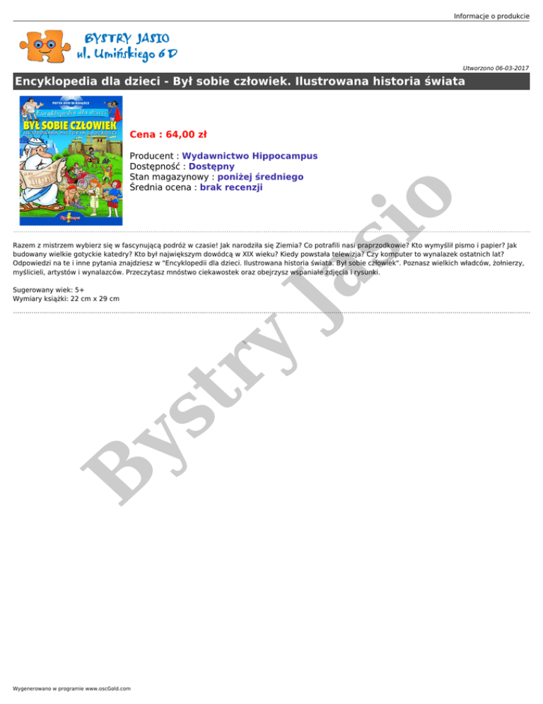 Informacje o produkcie Utworzono 06-03-2017 Encyklopedia dla dzieci - Był sobie człowiek. Ilustrowana historia świata Cena : 64,00 zł si o Producent : Wydawnictwo Hippocampus Dostępność : Dostępny Stan magazynowy : poniżej średniego Średnia ocena : brak recenzji Ja Razem z mistrzem wybierz się w fascynującą podróż w czasie! Jak narodziła się Ziemia? Co potrafili nasi praprzodkowie? Kto wymyślił pismo i papier? Jak budowany wielkie gotyckie katedry? Kto był największym dowódcą w XIX wieku? Kiedy powstała telewizja? Czy komputer to wynalazek ostatnich lat? Odpowiedzi na te i inne pytania znajdziesz w "Encyklopedii dla dzieci. Ilustrowana historia świata. Był sobie człowiek". Poznasz wielkich władców, żołnierzy, myślicieli, artystów i wynalazców. Przeczytasz mnóstwo ciekawostek oraz obejrzysz wspaniałe zdjęcia i rysunki. B ys tr y Sugerowany wiek: 5+ Wymiary książki: 22 cm x 29 cm Wygenerowano w programie www.oscGold.com