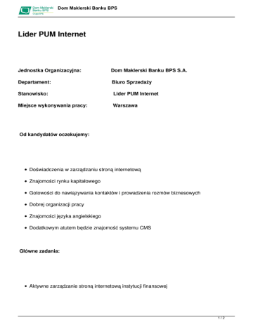 Dom Maklerski Banku BPS Lider PUM Internet Jednostka Organizacyjna: Dom Maklerski Banku BPS S.A. Departament: Biuro Sprzedaży Stanowisko: Lider PUM Internet Miejsce wykonywania pracy: Warszawa Od kandydatów oczekujemy: Doświadczenia w zarządzaniu stroną internetową Znajomości rynku kapitałowego Gotowości do nawiązywania kontaktów i prowadzenia rozmów biznesowych Dobrej organizacji pracy Znajomości języka angielskiego Dodatkowym atutem będzie znajomość systemu CMS Główne zadania: Aktywne zarządzanie stroną internetową instytucji finansowej 1/2 Dom Maklerski Banku BPS Prowadzenie działań marketingowych w celu pozyskania i obsługi klientów Współpraca ze wszystkimi departamentami Domu Maklerskiego i siecią sprzedaży Współpraca z instytucjami rynku kapitałowego ( GPW, KDPW, KNF) Sprzedaż produktów Domu Maklerskiego Oferujemy: Pracę w prężnie rozwijającej się firmie Możliwość realizacji własnych koncepcji biznesowych w ramach strategii Domu Maklerskiego Dużą samodzielność Pakiet opieki medycznej Umowę o pracę Stabilne warunki wynagrodzenia Osoby zainteresowane prosimy o przesłanie listu motywacyjnego oraz CV na adres: [email protected] W aplikacji prosimy zawrzeć klauzulę o ochronie danych osobowych (zgodnie z ustawą z dnia 29.08.97 o ochronie danych osobowych, Dziennik Ustaw Nr 133 Poz. 883). 2/2