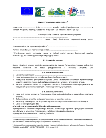 PROJEKT UMOWY PARTNERSKIEJ1 zawarta w ……………………. dnia …………………… w celu realizacji projektu pn. …………………. w ramach Programu Rozwoju Obszarów Wiejskich – Oś 4 Leader po m i ę d z y: …………………………………………… - zwanym dalej Liderem, reprezentowanym przez: …………………………………………………………………………………………………. a ……………………………………………… zwaną dalej Partnerem, reprezentowaną ………………………………………………………………………………………….. przez: 2 Lider oświadcza, że reprezentuje sektor …………………………………………………. Partner oświadcza, że reprezentuje sektor ………………………………………………... Wymienione wyżej podmioty zwane w dalszej części umowy Partnerami zgodnie oświadczają, że zawierają umowę następującej treści: § 1. Przedmiot umowy. Strony niniejszej umowy zgodnie postanawiają, że tworzą Partnerstwo, którego celem jest wspólne działanie na rzecz przygotowania i realizacji projektu pn. …………………………………………………………………………………………………... § 2. Status Partnerstwa. 1. Liderem projektu jest …………………………………………………………………… 2. Lider jest uprawniony do podpisywania umów finansowych. 3. Wszystkie działania podejmowane przez Lidera i Partnerów w ramach wykonywanego wspólnie projektu muszą być realizowane zgodnie z umową i przepisami prawa. 4. Partner upoważnia Lidera do podpisania umowy o finansowanie oraz występowania we wszystkich sprawach związanych z realizacją umowy i projektem. § 3. Zadania partnerów. 1. Lider jest stroną umowy o finansowanie i jest odpowiedzialny za prawidłową realizację projektu. 2. Dokumentacja projektu jest przechowywana w siedzibie Lidera. 3. Partnerzy zobowiązują się do przestrzegania Ustawy o ochronie danych osobowych. 4. Lider zobowiązany jest do: a) w zakresie przygotowania Wniosku o finansowanie: -sporządzenia i złożenia kompletnego wniosku płatniczego, zgodnie z przyjętymi zasadami określonymi w umowie o finansowanie i właściwymi przepisami prawa, -sporządzenia sprawozdania z realizacji zadania; 1 Projekt umowy partnerskiej określa jedynie podstawowe relacje pomiędzy Liderem a Partnerami. Umowa może być rozszerzona o inne elementy regulujące przedmiot współpracy. 2 Sektorowość rozumiana według kryteriów dostępu i wyboru LGD określonych w Programie Rozwoju Obszarów Wiejskich na lata 2007 – 2013 (PROW 2007 – 2013 strona 294). b) w zakresie organizacji i zarządzania projektem: -koordynacja oraz monitorowanie i kontrola działań związanych z realizacją projektu, -systematycznego monitorowania przebiegu realizacji Projektu oraz informowania niezwłocznie Partnera Projektu o zaistniałych nieprawidłowościach, c) w zakresie sprawozdawczości finansowej i zarządzania finansami: -rzetelne i terminowe sporządzanie sprawozdań w formie zgodnej z umową. Kopie sprawozdań są jawne dla Partnerów. 7. Partner zobowiązuje się : a) w zakresie przygotowania wniosku i rozliczania dofinansowania: -dostarczania Liderowi wszelkich informacji i dokumentów niezbędnych do terminowego składania sprawozdań, b) w zakresie organizacji i zarządzania projektem partnerzy gwarantują: -aktywny współudział w promocji projektu i rekrutacji beneficjentów ostatecznych Projektu, Partner odpowiada za poprawność formalną i merytoryczną dokumentów. Lider nie odpowiada wobec Partnera za wstrzymanie całości lub części finansowania projektu z powodu błędnego lub niewłaściwego przygotowania przez Partnera dokumentacji lub informacji wchodzących w skład przygotowywanego sprawozdania oraz wniosku płatniczego. § 4 Zaangażowanie. Zadania realizowane w ramach projektu wymagają zaangażowania się Partnerów w sposób, który umożliwi realizację w/w projektu. Partnerzy wyrażają zgodę na opublikowanie informacji o podjętej współpracy. § 5. Płatności. 1.Środki na realizację projektu będą przekazane poprzez Lidera w formie przelewów na podstawie wystawionych rachunków i faktur. Za dokumenty obciążające rozumie się dokumenty w rozumieniu ustawy o rachunkowości. § 6. Monitoring i kontrola. 1. Partnerzy zobowiązują się do rzetelnego realizowania przyjętych założeń. 2. Lider odpowiedzialny jest za monitorowanie i kontrolę realizacji projektu. 3.Partner zobowiązuje się do: -niezwłocznego informowania Lidera o problemach w realizacji projektu, 4.Koszty zawieszenia lub przerwania realizacji projektu obarczają Partnera winnego powstania nieprawidłowości. 5. Lider prowadzi rozliczenia finansowe i nadzoruje wydatkowanie środków pieniężnych oraz dokumentację Projektu. 6. Prawo kontroli i weryfikacji dokumentów przysługuje Liderowi. 11. Partner ponosi odpowiedzialność za przedstawienie nierzetelnych dokumentów finansowych. Partner winny nadużycia zobowiązany jest do zwrotu niesłusznie pobranych korzyści majątkowych wraz z odsetkami. §7 Rozwiązanie sporów. 1.Spory związane z realizacją niniejszej umowy Partnerzy będą się starali rozwiązywać polubownie. 2.Do czasu rozstrzygnięcia sporu stanowisko Lidera jest wiążące. 3.W przypadku braku porozumienia spór zostanie poddany pod rozstrzygnięć sądu właściwego dla siedziby Lidera. § 8. Rozwiązanie umowy. 1.Rozwiązanie umowy może nastąpić w związku z wystąpieniem niezależnych od stron okoliczności uniemożliwiających dalsze wykonywanie zawartych postanowień. § 9. Postanowienia końcowe. 1.Umowa zostaje zawarta na czas trwania projektu. 2.Umowę sporządzono w dwóch jednobrzmiących egzemplarzach, po jednym dla każdej ze stron. 3. Integralną częścią umowy jest opracowany projekt. Lider Partner