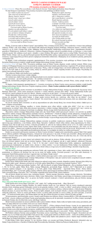 MONTE CASSINO SYMBOLEM WALKI O PRAWA BOSKIE I LUDZKIE (70 rocznica zwycięstwa na Monte Cassino) O. Marcel Sokalski: Witam Was zacni Rodacy i miłe Rodaczki sławami: Niech będzie pochwalony Jezus Chrystus! W roku bieżącym wspominamy 70-tą rocznicę zwycięstwa oręża polskiego na Monte Cassino. Czy widzisz te gruzy na szczycie? Runęli przez ogień ,straceńcy, Tam wróg twój się ukrył jak szczur. niejeden z nich dostał i padł, Musicie, musicie, musicie jak ci z Samosierry szaleńcy, Za kark wziąć i strącić go z chmur. Jak ci spod Racławic z przed lat. I poszli szaleni zażarci, Runęli impetem szalonym, I poszli zabijać i mścić, I doszli . I udał się szturm. I poszli jak zawsze uparci, I sztandar swój biało czerwony Jak zawsze za honor się bić. Zatknęli na gruzach wśród chmur, Czerwone maki na Monte Cassino… Czerwone maki... Zamiast rosy piły polską krew. Czy widzisz ten rząd białych krzyży? Po tych makach szedł żołnierz i ginął, Tam Polak z honorem brał ślub. Lecz od śmierci silniejszy był gniew. Idź naprzód, im dalej ,im wyżej, Przejdą lata i wieki przeminą. Tym więcej ich znajdziesz u stóp. Pozostaną ślady dawnych dni Ta ziemia do Polski należy, I wszystkie maki na Monte Cassino Choć Polska daleko jest stąd, Czerwieńsze będą, bo z polskiej wzrosną krwi. Bo wolność krzyżami się mierzy, Czerwone maki na Monte Cassino… Historia ten jeden ma błąd. Czerwone maki... Pieśnią „Czerwone maki na Monte Cassino” przywitaliśmy Was w kolejną rocznicę bitwy, która rozsławiła w świecie imię polskiego żołnierza. Polska i cały świat oddaje w tych dniach hołd żołnierzom Drugiego Korpusu Polskiego, żołnierzom honoru i wolności, którzy walczyli o to, by świat i Europa były wolne. Oddajemy hołd ich alianckim, bohaterskim towarzyszom broni i legendarnemu dowódcy, generałowi Władysławowi Andersowi. Oficerowie i żołnierze Drugiego Korpusu walczyli ku polskiej chwale, za Ojczyznę i w imię świętej wolności narodu. Szli szlakiem swych ojców i dziadów z ziemi włoskiej. Byli gotowi oddać życie za wolną Polskę. Przeszli przez Azję, Bliski Wchód, Afrykę i stali się, jak pisał brytyjski premier Harold Macmillan «jedną z najwspanialszych jednostek walczących w II wojnie światowej, wygrywającą bitwę po bitwie przeciw najlepszym niemieckim żołnierzom». Dziękujemy im za świadectwo prawdy, patriotyzmu i niezłomnej woli. W drugim z kolei archiwalnym programie upamiętniającym 70-tą rocznicę zwycięstwa oręża polskiego na Monte Cassino Ojciec Kornelian Dende przytoczy niektóre wyjątki homilii biskupa tarnowskiego Jerzego Ablewicza. O. Kornelian Dende (13 maja 1984): Zwycięstwo polskiego oręża na Monte Cassino okupione zostało ciężkimi stratami. Blisko tysiąc żołnierzy II (Drugiego) Korpusu na zawsze pozostał na cmentarzu położonym między górą klasztorną a wzgórzem 593, po którym najwięcej polało się polskiej krwi. Na obcej polegli ziemi za Ojczyznę i Wiarę, z dala od swojego kraju i od swoich najbliższych. Nikt nie ronił nad nimi łez. Nie było matki ni ojca, brata ni siostry, którzy by zmówili pacierz i złożyli wiązankę kwiatów na ich mogile. Przychodząc na pamięć słowa piosenki ułożonej po wojnie: „Nie zobaczysz Matko syna choćbyś oczy wypłakała, Choćbyś wyszła na kraj świata i wołała i płakała… Ale zamiast ojca, matki, brata, siostry sam Bóg przychodzi na ten cmentarz wojskowy wiosną i zasiewa łany czerwonych maków, które są teraz czerwieńsze – jak mówi polska piosenka – bo z polskiej wzrosły krwi. Chwałę nieśmiertelną poległych głosi prosty napis wykuty w kamieniu „Przechodniu, powiedz Polsce, żeśmy polegli wierni Jej służbie”. W drugim z kolei programie upamiętniającym […] rocznicę zwycięstwa na Monte Cassino znowu przytoczę niektóre wyjątki homilii biskupa tarnowskiego Jerzego Ablewicza. Program zaopatruję tytułem: „Monte Cassino symbolem walki o prawa Boskie i ludzkie”. Miłość karmi się ofiarami Duszę polską najlepiej można zrozumieć na przykładzie świętego Maksymiliana Kolego, którego nie przestawały fascynować słowa Boskiego Zbaiwciela: „Jeżeli ziarno pszeniczne wrzucone w ziemię obumrze, przynosi plon obfity”. Święty Maksymilian Kolbe tymi słowami żył i innych zachęcał, by nimi żyli. Mówił: „Musimy wyniszczyć się jak ziarno”. A wyniszczał się przez miłość. Święty Maksymilian kierował się w życiu dwiema zasadami. Pierwsza z nich brzmiała: „tylko miłość jest siłą twórczą”. Nienawiść do niczego nie prowadzi. Tylko miłość buduje. A druga zasada życiowa łączyła się z pierwszą: „Bez ofiary nie ma miłości”. Uczył Maksymilian Kolbe, że „miłość żywi się i karmi ofiarami”. Do swoich braci w Japonii skierował życzenia, które nas zdumiewają: „Życzę więc wszystkim i sobie najwięcej ofiar”. Na tym tle możemy łatwo zrozumieć, że stał się męczennikiem nie tylko chwały Bożej, lecz również Bożej miłości. Oddał życie za brata w bunkrze oświęcimskim. „Jeżeli ziarno życia ludzkiego wpadłszy w ziemię obumiera przez ofiarę miłości, wydaje plon obfity”. Czyż my o tym nie przekonujemy się dzisiaj? Jakże obfity plon przynosi męczeństwo z miłości świętego Maksymiliana? A przecież byli i tacy i zawsze się znajdują, którzy uważali i uważają go za naiwnego czy głupiego. Mówią, że jego śmierć była daremna (por. Mdr 3, 1-9). Męczeństwo miłości świętego Maksymiliana skupia dziś cały Naród Polski wokół najwyższych wartości i nie pozwala się spodlić. Męczeństwo miłości świętego Maksymiliana natchnęło twórców „Solidarności” i Naród do podjęcia metody pokojowej, ewangelicznej do pokonywania zła dobrem i miłością. Święty Maksymilian będzie na pewno obrońcą i odnowicielem duszy polskiej w drugim Millenium. Przez męczeństwo miło