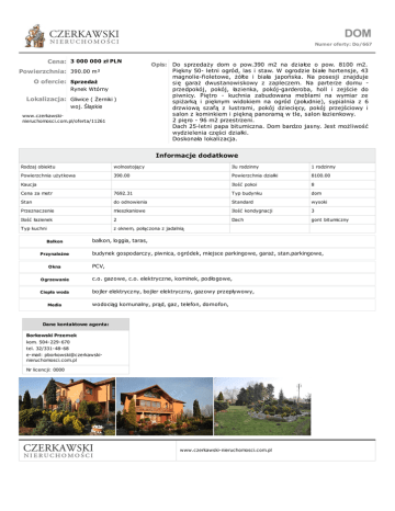 DOM Numer oferty: Do/667 Cena: 3 000 000 zł PLN Powierzchnia: 390.00 m² O ofercie: Sprzedaż Rynek Wtórny Lokalizacja: Gliwice ( Żerniki ) woj. Śląskie www.czerkawskinieruchomosci.com.pl/oferta/11261 Opis: Do sprzedaży dom o pow.390 m2 na działce o pow. 8100 m2. Piękny 50- letni ogród, las i staw. W ogrodzie białe hortensje, 43 magnolie-fioletowe, żółte i biała japońska. Na posesji znajduje się garaż dwustanowiskowy z zapleczem. Na parterze domu przedpokój, pokój, łazienka, pokój-garderoba, holl i zejście do piwnicy. Piętro - kuchnia zabudowana meblami na wymiar ze spiżarką i pięknym widokiem na ogród (południe), sypialnia z 6 drzwiową szafą z lustrami, pokój dziecięcy, pokój przejściowy i salon z kominkiem i piękną panoramą w tle, salon łazienkowy. 2 pięro - 96 m2 przestrzeni. Dach 25-letni papa bitumiczna. Dom bardzo jasny. Jest możliwość wydzielenia części działki. Doskonała lokalizacja. Informacje dodatkowe Rodzaj obiektu wolnostojący Ilu rodzinny 1 rodzinny Powierzchnia użytkowa 390.00 Powierzchnia działki 8100.00 Ilość pokoi 8 Kaucja Cena za metr 7692.31 Typ budynku dom Stan do odnowienia Standard wysoki Przeznaczenie mieszkaniowe Ilość kondygnacji 3 Ilość łazienek 2 Dach gont bitumiczny Typ kuchni z oknem, połączona z jadalnią Balkon Przynależne Okna balkon, loggia, taras, budynek gospodarczy, piwnica, ogródek, miejsce parkingowe, garaż, stan.parkingowe, PCV, Ogrzewanie c.o. gazowe, c.o. elektryczne, kominek, podłogowe, Ciepła woda bojler elektryczny, bojler elektryczny, gazowy przepływowy, Media wodociąg komunalny, prąd, gaz, telefon, domofon, Dane kontaktowe agenta: Borkowski Przemek kom. 504-229-670 tel. 32/331-48-68 e-mail: [email protected] Nr licencji: 0000 www.czerkawski-nieruchomosci.com.pl