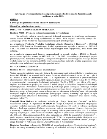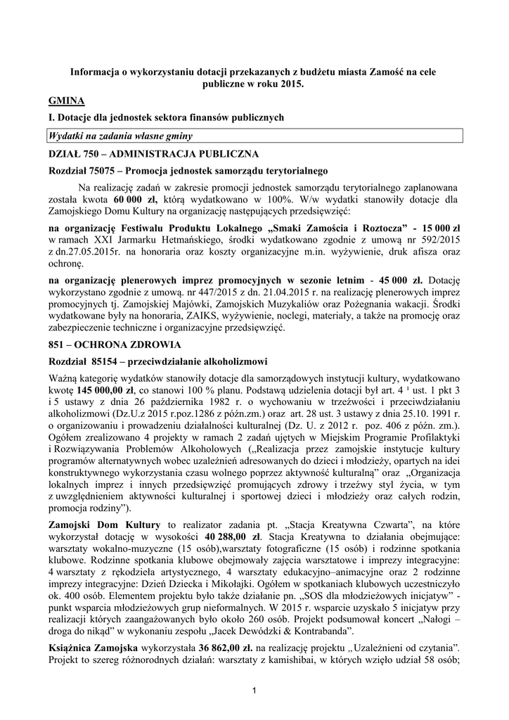 Informacja o wykorzystaniu dotacji przekazanych z budżetu miasta Zamość na cele publiczne w roku 2015. GMINA I. Dotacje dla jednostek sektora finansów publicznych Wydatki na zadania własne gminy DZIAŁ 750 – ADMINISTRACJA PUBLICZNA Rozdział 75075 – Promocja jednostek samorządu terytorialnego Na realizację zadań w zakresie promocji jednostek samorządu terytorialnego zaplanowana została kwota 60 000 zł, którą wydatkowano w 100%. W/w wydatki stanowiły dotacje dla Zamojskiego Domu Kultury na organizację następujących przedsięwzięć: na organizację Festiwalu Produktu Lokalnego „Smaki Zamościa i Roztocza” - 15 000 zł w ramach XXI Jarmarku Hetmańskiego, środki wydatkowano zgodnie z umową nr 592/2015 z dn.27.05.2015r. na honoraria oraz koszty organizacyjne m.in. wyżywienie, druk afisza oraz ochronę. na organizację plenerowych imprez promocyjnych w sezonie letnim - 45 000 zł. Dotację wykorzystano zgodnie z umową. nr 447/2015 z dn. 21.04.2015 r. na realizację plenerowych imprez promocyjnych tj. Zamojskiej Majówki, Zamojskich Muzykaliów oraz Pożegnania wakacji. Środki wydatkowane były na honoraria, ZAIKS, wyżywienie, noclegi, materiały, a także na promocję oraz zabezpieczenie techniczne i organizacyjne przedsięwzięć. 851 – OCHRONA ZDROWIA Rozdział 85154 – przeciwdziałanie alkoholizmowi Ważną kategorię wydatków stanowiły dotacje dla samorządowych instytucji kultury, wydatkowano kwotę 145 000,00 zł, co stanowi 100 % planu. Podstawą udzielenia dotacji był art. 4 ¹ ust. 1 pkt 3 i 5 ustawy z dnia 26 października 1982 r. o wychowaniu w trzeźwości i przeciwdziałaniu alkoholizmowi (Dz.U.z 2015 r.poz.1286 z późn.zm.) oraz art. 28 ust. 3 ustawy z dnia 25.10. 1991 r. o organizowaniu i prowadzeniu działalności kulturalnej (Dz. U. z 2012 r. poz. 406 z późn. zm.). Ogółem zrealizowano 4 projekty w ramach 2 zadań ujętych w Miejskim Programie Profilaktyki i Rozwiązywania Problemów Alkoholowych („Realizacja przez zamojskie instytucje kultury programów alternatywnych wobec uzależnień adresowanych do dzieci i młodzieży, opartych na idei konstruktywnego wykorzystania czasu wolnego poprzez aktywność kulturalną” oraz „Organizacja lokalnych imprez i innych przedsięwzięć promujących zdrowy i trzeźwy styl życia, w tym z uwzględnieniem aktywności kulturalnej i sportowej dzieci i młodzieży oraz całych rodzin, promocja rodziny”). Zamojski Dom Kultury to realizator zadania pt. „Stacja Kreatywna Czwarta”, na które wykorzystał dotację w wysokości 40 288,00 zł. Stacja Kreatywna to działania obejmujące: warsztaty wokalno-muzyczne (15 osób),warsztaty fotograficzne (15 osób) i rodzinne spotkania klubowe. Rodzinne spotkania klubowe obejmowały zajęcia warsztatowe i imprezy integracyjne: 4 warsztaty z rękodzieła artystycznego, 4 warsztaty edukacyjno–animacyjne oraz 2 rodzinne imprezy integracyjne: Dzień Dziecka i Mikołajki. Ogółem w spotkaniach klubowych uczestniczyło ok. 400 osób. Elementem projektu było także działanie pn. „SOS dla młodzieżowych inicjatyw” punkt wsparcia młodzieżowych grup nieformalnych. W 2015 r. wsparcie uzyskało 5 inicjatyw przy realizacji których zaangażowanych było około 260 osób. Projekt podsumował koncert „Nałogi – droga do nikąd” w wykonaniu zespołu „Jacek Dewódzki & Kontrabanda”. Książnica Zamojska wykorzystała 36 862,00 zł. na realizację projektu „Uzależnieni od czytania”. Projekt to szereg różnorodnych działań: warsztaty z kamishibai, w których wzięło udział 58 osób; 1 warsztaty biblioterapeutyczne w których uczestniczyły 83 osoby; cykliczne wakacyjne spotkania literackie „Z książką zwiedzamy świat”, w których wzięły udział 1744 osoby, warsztaty profilaktyczne „Mity i fakty o dopalaczach i marihuanie” z liczbą 101 uczestników; spotkania autorskie z Renatą Piątkowską i Ewą Nowak - cykl 6 spotkań zgromadził 290 odbiorców, 3 spektakle profilaktyczne dla 211 adresatów; zajęcia o tematyce prozdrowotnej „Zdrowy styl życia - bez tytoniu, alkoholu i dopalaczy” dla 132 uczestników; konkurs plastyczny „Stawiam na mój bohater literacki” wraz z wystawą pokonkursową, do którego zgłosiło się 528 osób, publikacja w nakładzie 200 egzemplarzy kalendarza na 2016 rok, opartego na pracach wykonanych w ramach konkursu plastycznego. Biuro Wystaw Artystycznych Galeria Zamojska otrzymało dotację w kwocie 7 850,00 zł na projekt „Zamość – kreską i plamą” – działania plenerowe na zamojskiej Starówce, skierowane do młodzieży zainteresowanej twórczością plastyczną. Zrealizowano 12 spotkań plenerowych w okresie wakacji, w których każdorazowo uczestniczyło od 14 do 21 osób. Elementem projektu była wystawa pokonkursowa. Zamojski Dom Kultury we współpracy z zarządami osiedli zorganizował 4 festyny rekreacyjno – kulturalne pn. „Wędrująca estrada”. W 2015 r. Wędrująca estrada odwiedziła: Osiedle Rataja (28.07.2015 r.), Osiedle Świętego Piątka (30.07.2015 r.), Osiedle Partyzantów (04.08.2015r.), Osiedle Zamczysko (06.08.2015 r.). W trakcie festynów dystrybuowano materiały informacyjno edukacyjne z obszaru przeciwdziałania uzależnieniom. Instytucja wykorzystała dotację w wysokości 60 000,00 zł. Szacunkowa liczba odbiorców to ponad 1200 osób. W Miejskim Programie Profilaktyki i Rozwiązywania Problemów Alkoholowych również zaplanowano dotację na wydatki bieżące w kwocie 3 200 zł, którą przekazano na Fundusz Wsparcia Policji i wykorzystano na sfinansowanie kosztów transportu uczestników w ramach realizacji przez KMP w Zamościu projektu pn „X Jubileuszowy Ogólnopolski Przystanek PaT”. Wyjazd został zorganizowany do Warszawy w dniach 23 – 24 czerwca 2015 r. i uczestniczyło w nim 48 osób. DZIAŁ 852 – POMOC SPOŁECZNA Rozdział 85295 – Pozostała działalność W okresie sprawozdawczym, w miesiącu grudniu powstał Dom Dzienny Senior