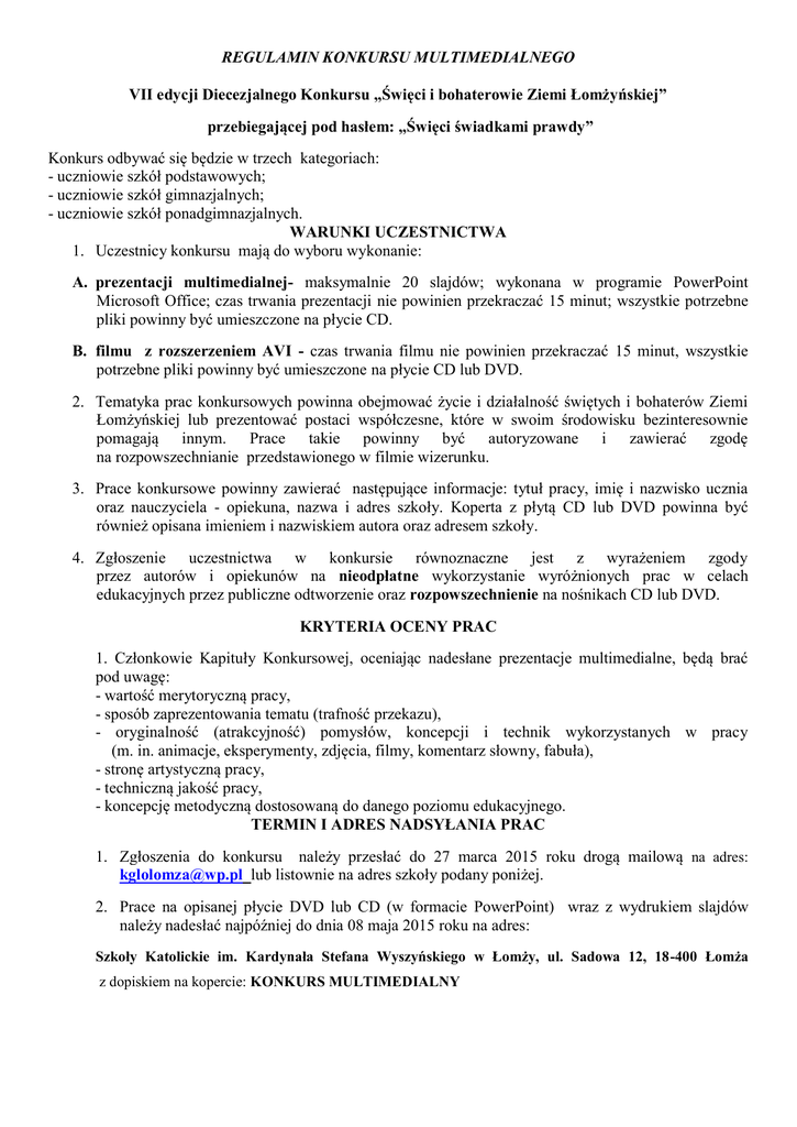 REGULAMIN KONKURSU MULTIMEDIALNEGO VII edycji Diecezjalnego Konkursu „Święci i bohaterowie Ziemi Łomżyńskiej” przebiegającej pod hasłem: „Święci świadkami prawdy” Konkurs odbywać się będzie w trzech kategoriach: - uczniowie szkół podstawowych; - uczniowie szkół gimnazjalnych; - uczniowie szkół ponadgimnazjalnych. WARUNKI UCZESTNICTWA 1. Uczestnicy konkursu mają do wyboru wykonanie: A. prezentacji multimedialnej- maksymalnie 20 slajdów; wykonana w programie PowerPoint Microsoft Office; czas trwania prezentacji nie powinien przekraczać 15 minut; wszystkie potrzebne pliki powinny być umieszczone na płycie CD. B. filmu z rozszerzeniem AVI - czas trwania filmu nie powinien przekraczać 15 minut, wszystkie potrzebne pliki powinny być umieszczone na płycie CD lub DVD. 2. Tematyka prac konkursowych powinna obejmować życie i działalność świętych i bohaterów Ziemi Łomżyńskiej lub prezentować postaci współczesne, które w swoim środowisku bezinteresownie pomagają innym. Prace takie powinny być autoryzowane i zawierać zgodę na rozpowszechnianie przedstawionego w filmie wizerunku. 3. Prace konkursowe powinny zawierać następujące informacje: tytuł pracy, imię i nazwisko ucznia oraz nauczyciela - opiekuna, nazwa i adres szkoły. Koperta z płytą CD lub DVD powinna być również opisana imieniem i nazwiskiem autora oraz adresem szkoły. 4. Zgłoszenie uczestnictwa w konkursie równoznaczne jest z wyrażeniem zgody przez autorów i opiekunów na nieodpłatne wykorzystanie wyróżnionych prac w celach edukacyjnych przez publiczne odtworzenie oraz rozpowszechnienie na nośnikach CD lub DVD. KRYTERIA OCENY PRAC 1. Członkowie Kapituły Konkursowej, oceniając nadesłane prezentacje multimedialne, będą brać pod uwagę: - wartość merytoryczną pracy, - sposób zaprezentowania tematu (trafność przekazu), - oryginalność (atrakcyjność) pomysłów, koncepcji i technik wykorzystanych w pracy (m. in. animacje, eksperymenty, zdjęcia, filmy, komentarz słowny, fabuła), - stronę artystyczną pracy, - techniczną jakość pracy, - koncepcję metodyczną dostosowaną do danego poziomu edukacyjnego. TERMIN I ADRES NADSYŁANIA PRAC 1. Zgłoszenia do konkursu należy przesłać do 27 marca 2015 roku drogą mailową na adres: [email protected] lub listownie na adres szkoły podany poniżej. 2. Prace na opisanej płycie DVD lub CD (w formacie PowerPoint) wraz z wydrukiem slajdów należy nadesłać najpóźniej do dnia 08 maja 2015 roku na adres: Szkoły Katolickie im. Kardynała Stefana Wyszyńskiego w Łomży, ul. Sadowa 12, 18-400 Łomża z dopiskiem na kopercie: KONKURS MULTIMEDIALNY
