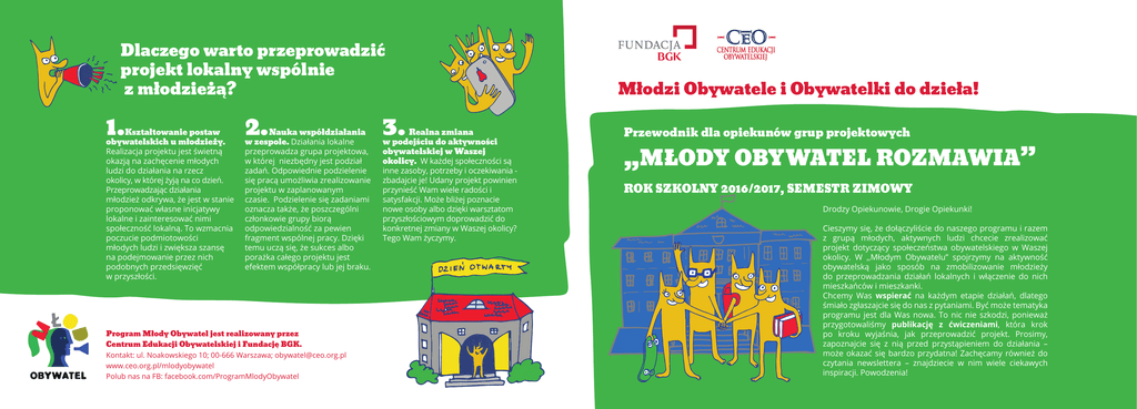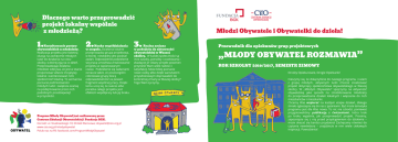 Dlaczego warto przeprowadzić projekt lokalny wspólnie z młodzieżą? 1. Kształtowanie postaw obywatelskich u młodzieży. Realizacja projektu jest świetną okazją na zachęcenie młodych ludzi do działania na rzecz okolicy, w której żyją na co dzień. Przeprowadzając działania młodzież odkrywa, że jest w stanie proponować własne inicjatywy lokalne i zainteresować nimi społeczność lokalną. To wzmacnia poczucie podmiotowości młodych ludzi i zwiększa szansę na podejmowanie przez nich podobnych przedsięwzięć w przyszłości. 2. Nauka współdziałania w zespole. Działania lokalne przeprowadza grupa projektowa, w której niezbędny jest podział zadań. Odpowiednie podzielenie się pracą umożliwia zrealizowanie projektu w zaplanowanym czasie. Podzielenie się zadaniami oznacza także, że poszczególni członkowie grupy biorą odpowiedzialność za pewien fragment wspólnej pracy. Dzięki temu uczą się, że sukces albo porażka całego projektu jest efektem współpracy lub jej braku. Program Młody Obywatel jest realizowany przez Centrum Edukacji Obywatelskiej i Fundację BGK. Kontakt: ul. Noakowskiego 10; 00-666 Warszawa; [email protected] www.ceo.org.pl/mlodyobywatel Polub nas na FB: facebook.com/ProgramMlodyObywatel 3. Realna zmiana w podejściu do aktywności obywatelskiej w Waszej okolicy. W każdej społeczności są inne zasoby, potrzeby i oczekiwania zbadajcie je! Udany projekt powinien przynieść Wam wiele radości i satysfakcji. Może bliżej poznacie nowe osoby albo dzięki warsztatom przyszłościowym doprowadzić do konkretnej zmiany w Waszej okolicy? Tego Wam życzymy. Młodzi Obywatele i Obywatelki do dzieła! Przewodnik dla opiekunów grup projektowych „MŁODY OBYWATEL ROZMAWIA” ROK SZKOLNY 2016/2017, SEMESTR ZIMOWY Drodzy Opiekunowie, Drogie Opiekunki! Cieszymy się, że dołączyliście do naszego programu i razem z grupą młodych, aktywnych ludzi chcecie zrealizować projekt dotyczący społeczeństwa obywatelskiego w Waszej okolicy. W ,,Młodym Obywatelu” spojrzymy na aktywność obywatelską jako sposób na zmobilizowanie młodzieży do przeprowadzania działań lokalnych i włączenie do nich mieszkańców i mieszkanki. Chcemy Was wspierać na każdym etapie działań, dlatego śmiało zgłaszajcie się do nas z pytaniami. Być może tematyka programu jest dla Was nowa. To nic nie szkodzi, ponieważ przygotowaliśmy publikację z ćwiczeniami, która krok po kroku wyjaśnia, jak przeprowadzić projekt. Prosimy, zapoznajcie się z nią przed przystąpieniem do działania – może okazać się bardzo przydatna! Zachęcamy również do czytania newslettera – znajdziecie w nim wiele ciekawych inspiracji. Powodzenia! Harmonogram działań w programie „Młody Obywatel”, czyli co i kiedy? Zapoznanie się z publikacją i wybór tematu Relacje z działań grup projektowych Młodych Obywateli Przysyłajcie nam swoje relacje – będziemy je na bieżąco zamieszczać na stronie internetowej naszego programu oraz fanpage’u na Facebooku. (październik 2016 – luty 2017) Realizacja projektów lokalnych To pierwszy i bardzo ważny krok! Razem z uczniami i uczennicami wybierzcie temat, którym chcecie się zająć. Proponujemy 3 tematy: Urząd od podszewki, Reportaż po sąsiedzku i Przyszłość na warsztacie. Dyplom Młodego Obywatela Dyplom otrzymają wszyscy uczestnicy, którzy ukończą program. (luty 2017) To najważniejszy punkt programu! Razem z młodzieżą poszukajcie lokalnych sojuszników i sojuszniczeki wspólnie ,,rozruszajcie” okolicę. Powodzenia! (październik 2016 – luty2017) Ankieta końcowa Podzielcie się z nami swoją opinią o Programie i pomóżcie nam go ulepszać. Uwaga: ankieta jest obowiązkowa! (luty 2017) Newsletter Co drugi czwartek otrzymacie newsletter z inspiracjami oraz bieżącymi informacjami o programie. październik Pakiet startowy z materiałami edukacyjnymi Pakiet z materiałami edukacyjnymi zostanie wysłany do Was pocztą. (październik 2016) listopad Mentoring i warsztaty z uczniami Mentoringiem zostaną objęte grupy, które nie brały udziału w programie. (listopad 2016 – luty 2017) Szkolenie o metodzie projektu dla opiekunów grup Miejsce i temin szkolenia zadeklarowaliście podczas rejestracji do programu. grudzień Webinaria (listopad – grudzień 2016) Wizyta koordynatora programu „Młody Obywatel” Z chęcią spotkamy się, aby porozmawiać o Waszych działaniach i wesprzeć Was w realizacji projektu z młodzieżą. (listopad 2016 – luty 2017) styczeń luty Sprawozdanie końcowe programu Przesłanie sprawozdania jest niezbędne do ukończenia programu! Formularz sprawozdania jest dostępny na stronie internetowej „Młodego Obywatela". (do 28 lutego 2017)