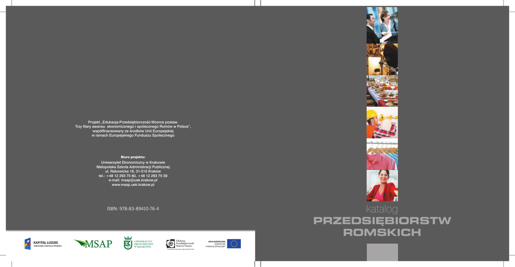 Projekt „Edukacja-Przedsiębiorczość-Wzorce postaw. Trzy filary awansu ekonomicznego i spolecznego Romów w Polsce”, współfinansowany ze środków Unii Europejskiej w ramach Europejskiego Funduszu Społecznego Biuro projektu: Uniwersytet Ekonomiczny w Krakowie Małopolska Szkoła Administracji Publicznej ul. Rakowicka 16, 31-510 Kraków tel.: +48 12 293 75 60, +48 12 293 75 59 e-mail: [email protected] www.msap.uek.krakow.pl ISBN: 978-83-89410-76-4 katalog PRZEDSIĘBIORSTW ROMSKICH katalog PRZEDSIĘBIORSTW ROMSKICH Kraków 2010 Niniejsza publikacja została przygotowana dzięki realizacji projektu „Edukacja-Przedsiębiorczość-Wzorce postaw. Trzy filary awansu ekonomicznego i społecznego Romów w Polsce”, współfinansowanego ze środków Unii Europejskiej w ramach Europejskiego Funduszu Społecznego. Publikacja jest dystrybuowana bezpłatnie. Niniejsza publikacja odzwierciedla wyłącznie poglądy Autorów. Instytucja Zarządzająca Programem Operacyjnym Kapitał Ludzki nie ponosi odpowiedzialności za sposób wykorzystania informacji w niej zawartych. WYDAWCA: Uniwersytet Ekonomiczny w Krakowie Małopolska Szkoła Administracji Publicznej ul. Rakowicka 16, 31-510 Kraków tel.: +48 12 293 75 60, +48 12 293 75 59 e-mail: [email protected] www.msap.uek.krakow.pl © Uniwersytet Ekonomiczny w Krakowie Małopolska Szkoła Administracji Publicznej Kraków 2010 AUTORZY: Agata Machnik-Pado, dr Michał Kudłacz REDAKCJA JĘZYKOWA I KOREKTA: Anna Szczepanik SKŁAD: Olison’s Project www.olisons.pl DRUK: POLIGRAFIA Inspektoratu Towarzystwa Salezjańskiego ul. Konfederacka 6, 30-306 Kraków ISBN: 978-83-89410-76-4 1 WSTĘP 1. N iniejsze opracowanie powstało dzięki realizacji projektu pt. „Edukacja-Przedsiębiorczość-Wzorce Postaw. Trzy filary awansu ekonomicznego i społecznego Romów w Polsce”1, współfinansowanego przez Unię Europejską ze środków Europejskiego Funduszu Społecznego, w ramach Programu Operacyjnego Kapitał Ludzki, Priorytet I. Zatrudnienie 1 Nadrzędnym celem projektu było zwiększenie aktywności zawodowej Romów poprzez integrację działań w zakresie promocji rozwoju zawodowego i edukacji ekonomicznej osób dorosłych oraz edukacji dzieci i młodzieży. Natomiast do celów szczegółowych zaliczono: – wypracowanie formuły i wdrożenie instytucji asystenta przedsiębiorczości romskiej, – profesjonalizację działalności przedsiębiorstw romskich poprzez edukację w zakresie marketingu, prawa i przedsiębiorczości, – wsparcie wychodzenia przedsiębiorstw romskich z „szarej strefy”, – zwiększenie skłonności do edukacji i rozwoju zawodowego poprzez ilustrowanie ich związku z jakością życia, – poprawę wiedzy o Romach w społeczeństwie. WSTĘP i integracja społeczna, Działanie 1.3 Ogólnopolskie programy integracji i aktywizacji zawodowej, poddziałanie 1.3.1 Projekty na rzecz społeczności Romskiej. W ramach tego poddziałania są realizowane projekty z zakresu wsparcia inicjatyw na rzecz aktywizacji społeczno-zawodowej społeczności romskiej poprzez zatrudnienie, edukację oraz integrację społeczną. Ich realizacja ułatwi członkom tej społeczności wyjście z trudnej sytuacji i odnalezienie się na otwartym rynku pracy. Wymieniony powyżej projekt był realizowany w partner- stwie przez trzy instytucje, tj.: Stowarzyszenie KulturalnoSpołeczne Romów „Centrum Kultury Romów w Polsce”, Małopolską Szkołę Administracji Publicznej Uniwersytetu Ekonomicznego w Krakowie (lider) oraz Uniwersytet Łódzki. 5 Intencją autorów jest prezentacja pewnego uporządkowa- nego zbioru przedsiębiorstw, które są zarządzane przez Romów mieszkających w Polsce, bądź też Romów zatrudniają. Innymi słowy, katalog odzwierciedla fragment rynku pracy jednej z mniejszości etnicznych zamieszkujących Polskę. Celem tego katalogu jest pokazanie, że Romowie, pomimo istniejących stereotypów, są aktywni zawodowo, mają aspiracje zawodowe, a jednocześnie istnieją w Polsce przedsiębiorstwa, które przy zatrudnianiu pracowników kierują się ich rzeczywistymi kompetencjami, a nie różnymi uprzedzeniami. Przedsiębiorstwa prowadzone przez Romów oraz takie, które są im przyjazne zasługują na uwagę, a oferowane przez nie dobra i usługi – na społeczne zainteresowanie. Polityka stymulowania rozwoju regionalnego, która jest przedmiotem wdrażania przez kraje Unii Europejskiej objawia się nie tylko poprzez wykorzystywanie potencjału regionalnego, ale również poprzez dążenie do gospodarczej, przestrzennej i społecznej spójności regionów. Może się to odbywać również poprzez niwelowanie destymulantów rozwoju. Za takowe można uznać problemy na rynku pracy mniejszości narodowych i etnicznych. Pokazanie szerokiemu gronu odbiorców podmiotów gospodarczych, które przyczyniają się do poprawy tej sytuacji z pewnością może doprowadzić do polepszenia położenia Romów na rynku pracy. Analizując współczesną sytuację Romów w Polsce należy zwrócić uwagę na szereg prawidłowości charakterystycznych dla tej grupy społecznej i, co znamienne, sytuację tę można odnieść do historycznych uwarunkowań. Romowie jako grupa społeczna, która na przestrzeni dziejów była wykluczana i marginalizowana, nauczyła się żyć poza głównym nurtem życia społecznego. Specyficzny sposób 6 patrzenia na świat oraz myślenia o swojej grupie determinuje ich zachowania. Bardzo ważne dla Romów stało się poczucie przynależności, więzi grupowej, gdyż tylko wśród „swoich” Rom mógł liczyć na zrozumienie i akceptację. To wszystko spowodowało, że ta grupa etniczna nauczyła się żyć na uboczu, z dala od innych. Przez lata ewoluował również sposób zachowania Romów dotyczący ich stosunku do pracy zawodowej – dali się poznać jako zdolni i pracowici, szczególnie w niektórych zawodach (m.in. muzykanctwo, kowalstwo, handel, hodowla koni, wytwarzanie naczyń aluminiowych). Jednocześnie