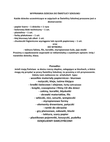 WYPRAWKA DZIECKA DO ŚWIETLICY SZKOLNEJ Każde dziecko uczestniczące w zajęciach w Świetlicy Szkolnej proszone jest o dostarczenie: - papier ksero – 1 dziecko = 1 ryza - kolorowy blok techniczny – 1 szt. - plastelina – 1 szt. - farby plakatowe – 1 szt. - klej biurowy lub vikol- 1 szt. - chusteczki higieniczne wyciągane lub ręcznik papierowy – 1 szt. oraz DO WYBORU: - tektura falista, filc, koraliki, styropianowe kule, jaja stożki Prosimy o zapakowanie wyprawki w reklamówkę z czytelnym opisem: imię i nazwisko dziecka, klasa. Ponadto: Jeżeli mają Państwo w domu rzeczy zbędne, zalegające w biurkach, a które mogą się przydać w pracy Świetlicy Szkolnej, to prosimy o ich przynoszenie. Zależy nam zwłaszcza na artykułach typu: - wszelkie materiały papierniczo– biurowe - nożyczki, kleje, taśma klejąca - kredki świecowe i olejowe, farby witrażowe - książki, czasopisma i filmy CD dla dzieci - cekiny, koraliki, błyskotki - skrawki materiałów, filc - włóczki, nici, sznurki, wstążeczki - styropianowe formy - elementy drewniane, patyczki - ramki do obrazów - gry planszowe, zabawki, klocki - tektura, szary papier - plastikowe pojemniki, koszyczki, pudełka DZIĘKUJEMY DARCZYŃCOM!