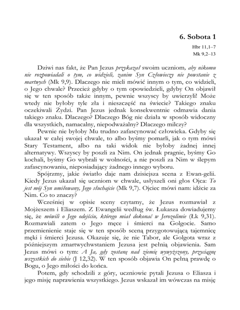 6. Sobota 1 Hbr 11,1–7 Mk 9,2–13 Dziwi nas fakt, że Pan Jezus przykazał swoim uczniom, aby nikomu nie rozpowiadali o tym, co widzieli, zanim Syn Człowieczy nie powstanie z martwych (Mk 9,9). Dlaczego nie mieli mówić innym o tym, co widzieli, o Jego chwale? Przecież gdyby o tym opowiedzieli, gdyby On objawił się w ten sposób także innym, pewnie wszyscy by uwierzyli! Może wtedy nie byłoby tyle zła i nieszczęść na świecie? Takiego znaku oczekiwali Żydzi. Pan Jezus jednak konsekwentnie odmawia dania takiego znaku. Dlaczego? Dlaczego Bóg nie działa w sposób widoczny dla wszystkich, namacalny, niepodważalny? Dlaczego milczy? Pewnie nie byłoby Mu trudno zafascynować człowieka. Gdyby się ukazał w całej swojej chwale, to albo byśmy pomarli, jak o tym mówi Stary Testament, albo na taki widok nie byłoby żadnej innej alternatywy. Wszyscy by poszli za Nim. On jednak pragnie, byśmy Go kochali, byśmy Go wybrali w wolności, a nie poszli za Nim w ślepym zafascynowaniu, nieposiadający żadnego innego wyboru. Spójrzmy, jakie światło daje nam dzisiejsza scena z Ewangelii. Kiedy Jezus ukazał się uczniom w chwale, usłyszeli oni głos Ojca: To jest mój Syn umiłowany, Jego słuchajcie (Mk 9,7). Ojciec mówi nam: idźcie za Nim. Co to znaczy? Wcześniej w opisie sceny czytamy, że Jezus rozmawiał z Mojżeszem i Eliaszem. Z Ewangelii według św. Łukasza dowiadujemy się, że mówili o Jego odejściu, którego miał dokonać w Jerozolimie (Łk 9,31). Rozmawiali zatem o Jego męce i śmierci na Golgocie. Samo przemienienie staje się w ten sposób sceną przygotowującą tajemnicę męki i śmierci Jezusa. Okazuje się, że nie Tabor, ale Golgota wraz z późniejszym zmartwychwstaniem Jezusa jest pełnią objawienia. Sam Jezus mówi o tym: A Ja, gdy zostanę nad ziemię wywyższony, przyciągnę wszystkich do siebie (J 12,32). W ten sposób objawia On pełną prawdę o Bogu, o Jego miłości do końca. Potem, gdy schodzili z góry, uczniowie pytali Jezusa o Eliasza i jego misję naprawienia wszystkiego. Jezus wskazał im wówczas na misję zarówno Eliasza, jak i Jego samego w kategoriach cierpiącego Sługi Jahwe: Ma On wiele cierpieć i być wzgardzonym (Mk 9,12). Sługa Jahwe jest dla Jezusa kluczem do rozumienia Jego własnej misji. To samo nam wskazuje. Wczorajsza Ewangelia mówiła o potrzebie oddania swojego życia dla Niego, co na inny sposób wyrażają słowa o potrzebie wzięcia swojego krzyża i pójściu za Nim. Nasze życie jest drogą. Nie jesteśmy gotowi, ale się stajemy. A staniemy się takimi, jakimi siebie wybierzemy przez konkretne wybory życiowe. Wezwanie Ojca: Jego słuchajcie, wskazuje nam wyraźnie drogę. Nie są nią żadne sztywne zasady, choćby najwznioślejsze, ale zawierzenie Jezusowi. Jest to droga wiary, na której stopniowo odkrywamy pełnię miłości Boga i dajemy się jej pociągnąć. Odkrycie wewnętrznej więzi z Jezusem jako Przewodnikiem na naszej drodze jest czymś zasadniczym w życiu. Bez tego odkrycia i pójścia za Nim nie można dojść do pełni życia, jaka się w Nim objawiła. List do Hebrajczyków z dzisiejszego pierwszego czytania wskazuje na doświadczenia postaci biblijnych, które uzyskały szczególną więź z Bogiem. Każda z nich uzyskała ją dzięki zawierzeniu. Jedynie ono tworzy wewnętrzne powiązanie z Bogiem. Gdyby Bóg objawił się wszystkim, podobnie jak Jezus objawił się na Taborze, nasza więź z Nim byłaby więzią zewnętrzną, bo objawił się na zewnątrz. Objawienie miłości do końca porusza serce i dlatego pociąga wszystkich od wewnątrz. Trzeba to jednak odkryć i temu zawierzyć. W odpowiedzi na takie objawienie pojawia się wewnętrzna fascynacja i pragnienie przylgnięcia nie tylko do samej postaci, ale też do miłości i jej wymagań. I tego właśnie pragnie Bóg dla nas, abyśmy żyli taką samą dynamiką, jaką On żyje.