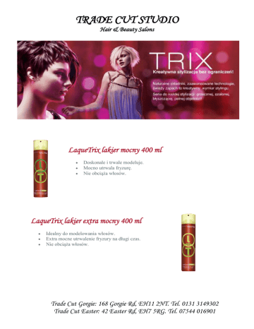 TRADE CUT STUDIO Hair & Beauty Salons LaqueTrix lakier mocny 400 ml Doskonale i trwale modeluje. Mocno utrwala fryzurę. Nie obciąża włosów. LaqueTrix lakier extra mocny 400 ml Idealny do modelowania włosów. Extra mocne utrwalenie fryzury na długi czas. Nie obciąża włosów. Trade Cut Gorgie: 168 Gorgie Rd, EH11 2NT. Tel. 0131 3149302 Trade Cut Easter: 42 Easter Rd, EH7 5RG. Tel. 07544 016901 TRADE CUT STUDIO Hair & Beauty Salons AirTrix Lakier w atomizerze 250 ml Doskonale podkreśla poszczególne pasemka. Włosy są elastyczne i pełne blasku. Fryzura pozostaje idealnie utrwalona przez wiele godzin. Nadaje włosom elastyczność i blask. Porada eksperta Masz cienkie włosy? Ludzie z cienkimi włosami posiadają ok. 90.000 włosów na głowie, a ich głównym problemem jest to, że włosy są miękkie. Aby uniknąć tego stosuj produkty do stylizacji, aby dodać swoim włosom objętości bez efektu ich obciążania. MousseTrix Pianka mocna 250 ml Utrwala włosy delikatne. Nie obciąża włosów. Pozostawia uczucie lekkości we włosach. Porada eksperta Stosuj produkty do stylizacji: aby dodać włosom objętości – piankę mocną MousseTrix, żel włóknisty TufTrix lub lakier w atomizerze AirTrix. aby dodać włosom blasku – nabłyszczacz GlossTrix lub żel mocny GelTrix. aby uzyskać od lekkiego po mocne utrwalenie – lakier w atomizerze AirTrix lub lakier extra mocny LaqueTrix. Trade Cut Gorgie: 168 Gorgie Rd, EH11 2NT. Tel. 0131 3149302 Trade Cut Easter: 42 Easter Rd, EH7 5RG. Tel. 07544 016901 TRADE CUT STUDIO Hair & Beauty Salons MousseTrix Pianka extra mocna 250 ml Utrwala oraz pomaga zdyscyplinować gęste i grube włosy. Nie obciąża włosów. Dodaje włosom blasku. GelTrix Żel mocny 200 ml Maksymalnie utrwalający. Silnie nabłyszcza włosy. Gwarantuje długotrwały efekt. TufTrix Żel włóknisty 150 ml Gwarancja ekstremalnego utrwalenia fryzury. Utrwala włosy podniesione do góry lub wyciągnięte w dół. Wzmocniony włóknami, dzięki czemu produkt lepiej utrzymuje się na włosach. Porada eksperta Żel włóknisty TUFTRIX jest idealny do tworzenia kolców, dredów, utrwalania skrętów lub kreowania kanciastych fryzur. ShapeTrix Pasta 100 ml Mocno utrwala. Nadaje giętkość i zdecydowana formę. Separuje kosmyki. Subtelnie matuje. Trade Cut Gorgie: 168 Gorgie Rd, EH11 2NT. Tel. 0131 3149302 Trade Cut Easter: 42 Easter Rd, EH7 5RG. Tel. 07544 016901