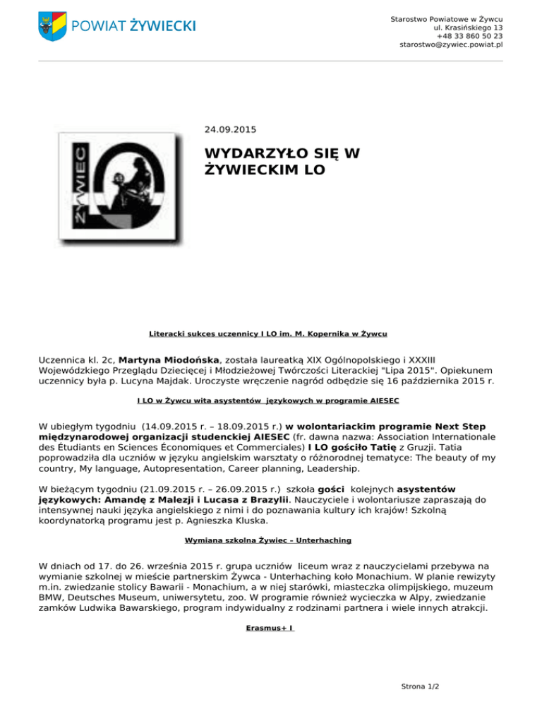 Starostwo Powiatowe w Żywcu ul. Krasińskiego 13 +48 33 860 50 23 [email protected] 24.09.2015 WYDARZYŁO SIĘ W ŻYWIECKIM LO Literacki sukces uczennicy I LO im. M. Kopernika w Żywcu Uczennica kl. 2c, Martyna Miodońska, została laureatką XIX Ogólnopolskiego i XXXIII Wojewódzkiego Przeglądu Dziecięcej i Młodzieżowej Twórczości Literackiej "Lipa 2015". Opiekunem uczennicy była p. Lucyna Majdak. Uroczyste wręczenie nagród odbędzie się 16 października 2015 r. I LO w Żywcu wita asystentów językowych w programie AIESEC W ubiegłym tygodniu (14.09.2015 r. – 18.09.2015 r.) w wolontariackim programie Next Step międzynarodowej organizacji studenckiej AIESEC (fr. dawna nazwa: Association Internationale des Étudiants en Sciences Économiques et Commerciales) I LO gościło Tatię z Gruzji. Tatia poprowadziła dla uczniów w języku angielskim warsztaty o różnorodnej tematyce: The beauty of my country, My language, Autopresentation, Career planning, Leadership. W bieżącym tygodniu (21.09.2015 r. – 26.09.2015 r.) szkoła gości kolejnych asystentów językowych: Amandę z Malezji i Lucasa z Brazylii. Nauczyciele i wolontariusze zapraszają do intensywnej nauki języka angielskiego z nimi i do poznawania kultury ich krajów! Szkolną koordynatorką programu jest p. Agnieszka Kluska. Wymiana szkolna Żywiec – Unterhaching W dniach od 17. do 26. września 2015 r. grupa uczniów liceum wraz z nauczycielami przebywa na wymianie szkolnej w mieście partnerskim Żywca - Unterhaching koło Monachium. W planie rewizyty m.in. zwiedzanie stolicy Bawarii - Monachium, a w niej starówki, miasteczka olimpijskiego, muzeum BMW, Deutsches Museum, uniwersytetu, zoo. W programie również wycieczka w Alpy, zwiedzanie zamków Ludwika Bawarskiego, program indywidualny z rodzinami partnera i wiele innych atrakcji. Erasmus+ I Strona 1/2 Starostwo Powiatowe w Żywcu ul. Krasińskiego 13 +48 33 860 50 23 [email protected] LO zdobywa grant na projekt z UE! I LO otrzymało grant z Unii Europejskiej na projekt o tematyce astronomicznej pt. "Sons of the Sun". Projekt będzie realizowany przez dwa lata wspólnie z partnerami z Litwy, Rumunii i Turcji. Rekrutację chętnych do udziału w projekcie prowadzi p. Michał Kusiak. Strona 2/2 Powered by TCPDF (www.tcpdf.org)