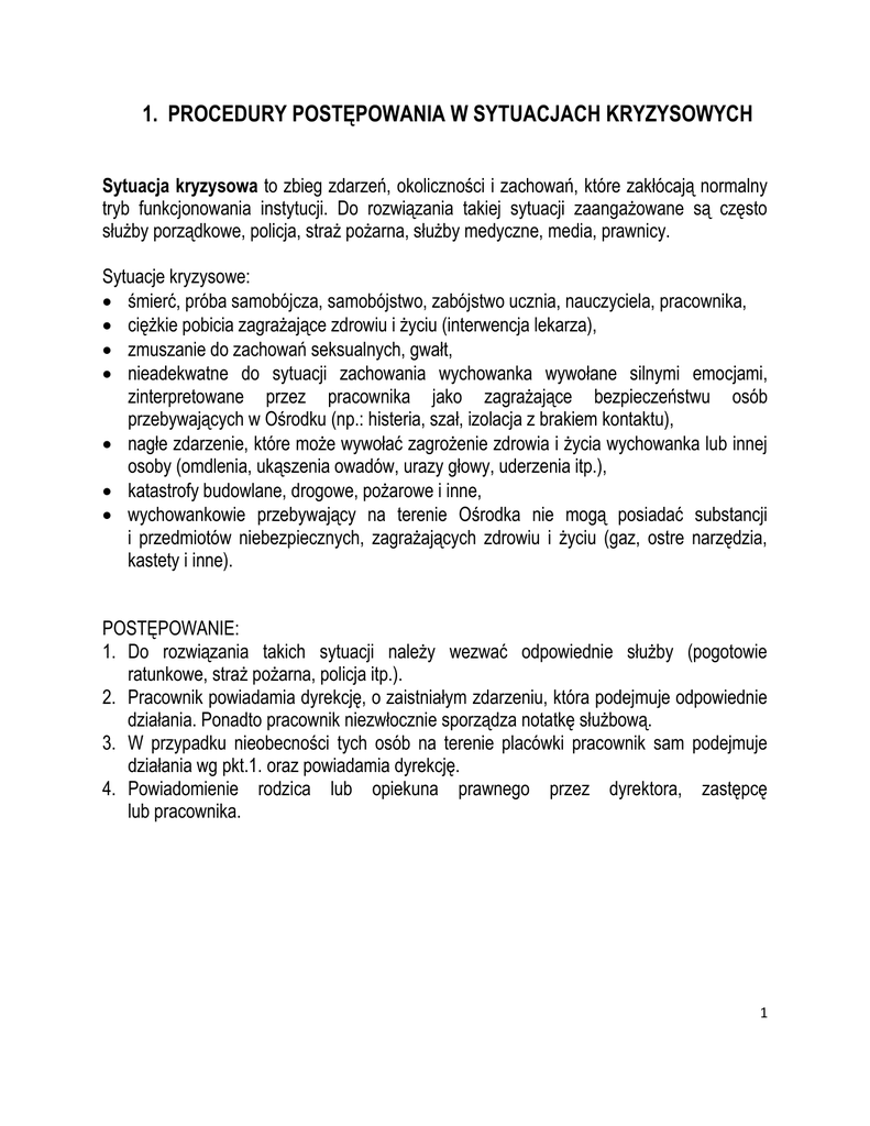1. PROCEDURY POSTĘPOWANIA W SYTUACJACH KRYZYSOWYCH Sytuacja kryzysowa to zbieg zdarzeń, okoliczności i zachowań, które zakłócają normalny tryb funkcjonowania instytucji. Do rozwiązania takiej sytuacji zaangażowane są często służby porządkowe, policja, straż pożarna, służby medyczne, media, prawnicy. Sytuacje kryzysowe: śmierć, próba samobójcza, samobójstwo, zabójstwo ucznia, nauczyciela, pracownika, ciężkie pobicia zagrażające zdrowiu i życiu (interwencja lekarza), zmuszanie do zachowań seksualnych, gwałt, nieadekwatne do sytuacji zachowania wychowanka wywołane silnymi emocjami, zinterpretowane przez pracownika jako zagrażające bezpieczeństwu osób przebywających w Ośrodku (np.: histeria, szał, izolacja z brakiem kontaktu), nagłe zdarzenie, które może wywołać zagrożenie zdrowia i życia wychowanka lub innej osoby (omdlenia, ukąszenia owadów, urazy głowy, uderzenia itp.), katastrofy budowlane, drogowe, pożarowe i inne, wychowankowie przebywający na terenie Ośrodka nie mogą posiadać substancji i przedmiotów niebezpiecznych, zagrażających zdrowiu i życiu (gaz, ostre narzędzia, kastety i inne). POSTĘPOWANIE: 1. Do rozwiązania takich sytuacji należy wezwać odpowiednie służby (pogotowie ratunkowe, straż pożarna, policja itp.). 2. Pracownik powiadamia dyrekcję, o zaistniałym zdarzeniu, która podejmuje odpowiednie działania. Ponadto pracownik niezwłocznie sporządza notatkę służbową. 3. W przypadku nieobecności tych osób na terenie placówki pracownik sam podejmuje działania wg pkt.1. oraz powiadamia dyrekcję. 4. Powiadomienie rodzica lub opiekuna prawnego przez dyrektora, zastępcę lub pracownika. 1 2. PROCEDURY POSTĘPOWANIA W SYTUACJI PODEJRZENIA, ŻE WYCHOWANEK JEST POD WPŁWEM SUBSTANCJI PSYCHOAKTYWNYCH W przypadku, gdy pracownik pedagogiczny podejrzewa, że wychowanek znajduje się pod wpływem substancji psychoaktywnych podejmuje następujące kroki: 1. Izoluje wychowanka od reszty grupy lub klasy, ale ze względów bezpieczeństwa nie pozostawia wychowanka samego. Stwarza warunki, w których nie będzie zagrożone jego życie i zdrowie. 2. W razie potrzeby udziela pomocy przedmedycznej. 3. Zawiadamia bezzwłocznie dyrekcję placówki oraz opiekunów prawnych. 4. Dyrekcja ośrodka wzywa lekarza, w celu stwierdzenia stanu trzeźwości lub odurzenia. W przypadku, gdy zachowanie dziecka może być zagrożeniem życia lub bezpieczeństwa dla niego lub innych wzywa się Pogotowie Ratunkowe. Istnieje możliwość wykonania testu wychowankowi na pisemną prośbę rodzica i w jego obecności. 5. W przypadku podejrzeń wychowawcy, że w momencie przyjazdu wychowanka do Ośrodka jest on pod wpływem środków zmieniających świadomość: - wychowanek nie zostaje przyjęty do placówki, - rodziców zobowiązuje się do konsultacji lekarskiej i dostarczenia w tym samym dniu, zaświadczenia wykluczającego podejrzenia wychowawcy. 6. Jeżeli dziecko nie wyraża zgody na badanie lekarskie wzywa się opiekuna prawnego i jest to jednoznaczne z negowaniem warunków pobytu w MOS. 7. Jeśli wynik testu jest pozytywny dyrekcja w porozumieniu z lekarzem podejmuje decyzję o dalszym postępowaniu oraz wzywa opiekuna prawnego do stawienia się w palcówce. Jeżeli prawny opiekun odmawia przyjazdy, to wzywa się Policję. 8. Spożywanie alkoholu na terenie ośrodka przez wychowanka, który ukończył 17 lat stanowi wykroczenie z art.43 ust.1 Ustawy o wychowaniu w trzeźwości i przeciwdziałaniu alkoholizmowi. Pracownik pedagogiczny powiadamia dyrekcję, która zawiadamia Policję. 9. Dyrekcja powiadamia Sąd Rodzinny o pogłębiającej się demoralizacji. 2 3. PROCEDURY POSTĘPOWANIA W PRZYPADKU, GDY PRACOWNIK ZNAJDUJE NA TERENIE OŚRODKA SUBSTANCJĘ PRZYPOMINAJĄCĄ WYGLĄDEM NARKOTYK Pracownik powinien podjąć następujące kroki: 1. Powiadamia dyrekcję Ośrodka i w porozumieniu z nią jest wyzwana Policja. 2. Zachowując środki ostrożności zabezpiecza substancję przed dostępem do niej osób niepowołanych oraz ewentualnym jej zniszczeniem do czasu przybycia policji. 3. Wszelkie substancje rozlane lub rozsypane należy odgrodzić i zabezpieczyć przed rozniesieniem np. na podeszwach butów. 4. Czekać na przyjazd Policji i nie podejmować żadnych działań związanych z próbą dostarczenia substancji na najbliższy posterunek. 5. Po przyjeździe Policji niezwłocznie dyrekcja przekazuje zabezpieczoną substancję i informacje dotyczące szczegółów zdarzenia. 3 4. PROCEDURY POSTĘPOWANIA W PRZYPADKU, GDY PRACOWNIK PEDAGOGICZNY PODEJRZEWA, ŻE UCZEŃ POSIADA PRZY SOBIE SUBSTANCJE PRZYPOMINAJĄCĄ NARKOTYK Pracownik pedagogiczny powinien podjąć następujące kroki: 1. Odizolować wychowanka/ ucznia poprzez umieszczenie go w oddzielnym pomieszczeniu. 2. Powiadomić o swoich podejrzeniach dyrekcję. 3. W obecności innego pracownika pedagogicznego zażądać, aby wychowanek przekazał mu tę substancję, pokazał zawartość torby oraz kieszeni, ewentualnie innych przedmiotów budzących podejrzenie co do ich związku z poszukiwaną substancją (Uwaga!!! Pracownikowi nie wolno samemu przeszukiwać rzeczy wychowanka). 4. Jeśli wychowanek odda substancję dobrowolnie, należy ją odpowiednio zabezpieczyć i podjąć kroki opisane w procedurze nr 3. 5. W przypadku, gdy wychowanek nie chce oddać substancji dobrowolnie, pracownik w porozumieniu z dyrekcją wzywa Policję, która dokona przeszukania. 6. O zaistniałym zdarzeniu dyrekcja powiadamia opiekunów prawnych wychowanka i wzywa ich do natychmiastowego stawiennictwa. 7. Pracownik pedagogiczny podejmuje próby ustalenia, w jaki sposób i od kogo wychowanek nabył substancję. 8. Całe zdarzenie musi być udokumentowane możliwie dokładna notatką. 4 5. PROCEDURY POSTĘPOWANIA W PRZYPADKU WYCHOWANKÓW PALĄCYCH PAPIEROSY NA TERENIE OŚRODKA I WOKÓŁ NIEGO 1. Każdy wychowanek MOS, który jest podejrzewany lub zostanie zauważony, że palił papierosa na terenie ośrodk