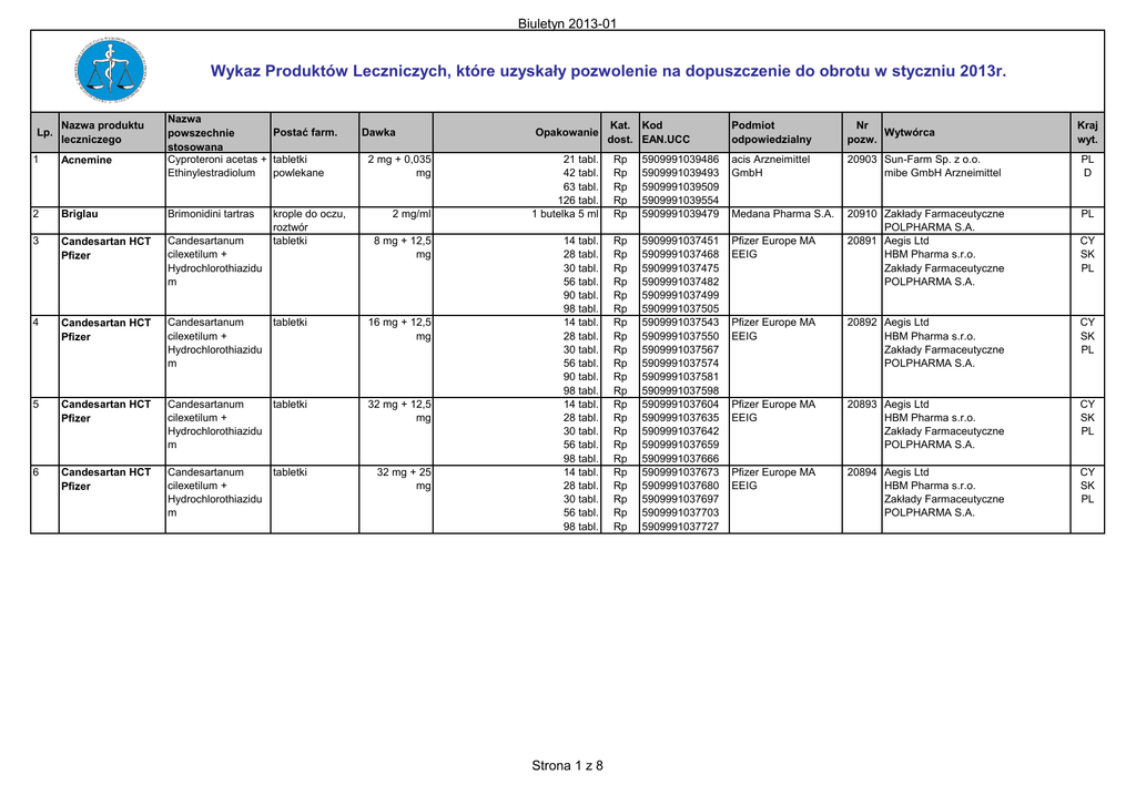 Biuletyn 2013-01 Wykaz Produktów Leczniczych, które uzyskały pozwolenie na dopuszczenie do obrotu w styczniu 2013r. CZ ÓJ OB YCH URZĄ DR EJ E Lp. I PRODUKT CH ÓW NY BI CZ PRODUKTÓW CJI LE RA C ST YROBÓ W CH W ME ZY IC DY ZN Nazwa produktu leczniczego Nazwa Postać farm. powszechnie stosowana Cyproteroni acetas + tabletki Ethinylestradiolum powlekane Dawka 1 Acnemine 2 Briglau Brimonidini tartras 3 Candesartan HCT Pfizer Candesartanum cilexetilum + Hydrochlorothiazidu m 4 Candesartan HCT Pfizer Candesartanum cilexetilum + Hydrochlorothiazidu m tabletki 16 mg + 12,5 mg 5 Candesartan HCT Pfizer Candesartanum cilexetilum + Hydrochlorothiazidu m tabletki 32 mg + 12,5 mg 6 Candesartan HCT Pfizer Candesartanum cilexetilum + Hydrochlorothiazidu m tabletki 32 mg + 25 mg krople do oczu, roztwór tabletki 2 mg + 0,035 mg 2 mg/ml 8 mg + 12,5 mg Opakowanie Kat. Kod dost. EAN.UCC Podmiot odpowiedzialny Nr Wytwórca pozw. Kraj wyt. 21 tabl. 42 tabl. 63 tabl. 126 tabl. 1 butelka 5 ml Rp Rp Rp Rp Rp 5909991039486 5909991039493 5909991039509 5909991039554 5909991039479 acis Arzneimittel GmbH 20903 Sun-Farm Sp. z o.o. mibe GmbH Arzneimittel PL D Medana Pharma S.A. PL 14 tabl. 28 tabl. 30 tabl. 56 tabl. 90 tabl. 98 tabl. 14 tabl. 28 tabl. 30 tabl. 56 tabl. 90 tabl. 98 tabl. 14 tabl. 28 tabl. 30 tabl. 56 tabl. 98 tabl. 14 tabl. 28 tabl. 30 tabl. 56 tabl. 98 tabl. Rp Rp Rp Rp Rp Rp Rp Rp Rp Rp Rp Rp Rp Rp Rp Rp Rp Rp Rp Rp Rp Rp 5909991037451 5909991037468 5909991037475 5909991037482 5909991037499 5909991037505 5909991037543 5909991037550 5909991037567 5909991037574 5909991037581 5909991037598 5909991037604 5909991037635 5909991037642 5909991037659 5909991037666 5909991037673 5909991037680 5909991037697 5909991037703 5909991037727 Pfizer Europe MA EEIG 20910 Zakłady Farmaceutyczne POLPHARMA S.A. 20891 Aegis Ltd HBM Pharma s.r.o. Zakłady Farmaceutyczne POLPHARMA S.A. Strona 1 z 8 CY SK PL Pfizer Europe MA EEIG 20892 Aegis Ltd HBM Pharma s.r.o. Zakłady Farmaceutyczne POLPHARMA S.A. CY SK PL Pfizer Europe MA EEIG 20893 Aegis Ltd HBM Pharma s.r.o. Zakłady Farmaceutyczne POLPHARMA S.A. CY SK PL Pfizer Europe MA EEIG 20894 Aegis Ltd HBM Pharma s.r.o. Zakłady Farmaceutyczne POLPHARMA S.A. CY SK PL Biuletyn 2013-01 7 Carbidopa + Levodopa Accord Nazwa powszechnie stosowana Carbidopum + Levodopum 8 Desirett Desogestrelum 9 Desloratadine Lupin Dessette Desloratadinum Nazwa produktu Lp. leczniczego 10 Postać farm. tabletki o przedłużonym uwalnianiu Dawka Opakowanie 50 mg + 200 mg tabletki powlekane 75 mcg tabletki powlekane Ethinylestradiolum + tabletki Desogestrelum powlekane 5 mg 20 mcg + 150 mcg 10 tabl. 20 tabl. 30 tabl. w blistrze 30 tabl. w butelce 49 tabl. 50 tabl. 56 tabl. w blistrze 56 tabl. w butelce 60 tabl. 84 tabl. w blistrze 84 tabl. w butelce 98 tabl. 100 tabl. w blistrze 100 tabl. w butelce 196 tabl. 200 tabl. 300 tabl. 28 tabl. 84 tabl. 168 tabl. 10 tabl. 30 tabl. 21 tabl. . 63 tabl. 126 tabl. 11 Dessette Forte Ethinylestradiolum + tabletki Desogestrelum powlekane 30 mcg + 150 mcg 21 tabl. . 63 tabl. 126 tabl. 12 Dessette Mono Desogestrelum tabletki powlekane 75 mcg 28 tabl. 84 tabl. 168 tabl. 13 Difumenil Methylphenidati hydrochloridum 14 Edelan Mometasoni furoas tabletki o przedłużonym uwalnianiu krem 27 mg 1 mg/g 28 tabl. 30 tabl. 56 tabl. 1 tuba 15 g 1 tuba 30 g Strona 2 z 8 Kat. Kod dost. EAN.UCC Rp Rp Rp Rp Rp Rp Rp Rp Rp Rp Rp Rp Rp Rp Rp Rp Rp Rp Rp Rp Rp Rp Rp Rp Rp Rp Rp Rp Rp Rp Rp Rp Rp Rp Rp Rp Rp Rp Rp Rp Rp Rp Rp Rp Rp 5909991035679 5909991035686 5909991035693 5909991035839 5909991035709 5909991035723 5909991035730 5909991035846 5909991035747 5909991035754 5909991035853 5909991035761 5909991035778 5909991035860 5909991035785 5909991035792 5909991035808 5909991039295 5909991039301 5909991039356 5909991038199 5909991038205 5909991040666 5909991040697 5909991040703 5909991040673 5909991040741 5909991040680 5909991040758 5909991040789 5909991040796 5909991040765 5909991040802 5909991040772 5909991040826 5909991040857 5909991040864 5909991040833 5909991040871 5909991040840 5909991039035 5909991039042 5909991039059 5909991023683 5909991023690 Podmiot odpowiedzialny Nr Wytwórca pozw. Kraj wyt. Accord Healthcare Polska Sp. z o.o. 20898 Accord Healthcare Ltd GB Temapharm Sp. z o.o. 20904 Laboratorios Leon Farma S.A. E Lupin (Europe) Ltd. 20897 Lupin (Europe) Ltd. GB Sun-Farm Sp. z o.o. 20919 Sun-Farm Sp. z o.o. mibe GmbH Arzneimittel PL D Sun-Farm Sp. z o.o. 20920 Sun-Farm Sp. z o.o. mibe GmbH Arzneimittel PL D Sun-Farm Sp. z o.o. 20918 Sun-Farm Sp. z o.o. mibe GmbH Arzneimittel PL D Sandoz GmbH 20921 Lek Pharmaceuticals d.d. Salutas Pharma GmbH SLO D Zakłady Farmaceutyczne POLPHARMA S.A. 20899 Accord Healthcare Ltd GB Biuletyn 2013-01 16 Nazwa powszechnie stosowana Beclometasoni Fostex Nexthaler dipropionas anhydricus + Formoteroli fumaras dihydricus Irbesartan Fair-Med Irbesartanum 17 Irbesartan Fair-Med Irbesartanum 18 Irbesartan Fair-Med Irbesartanum 19 Irbesartan HCT Fair- Irbesartanum + Hydrochlorothiazidu Med m Irbesartan HCT Fair- Irbesartanum + Hydrochlorothiazidu Med m Irbesartan HCT Fair- Irbesartanum + Hydrochlorothiazidu Med m Levodopum + Levodopa + Carbidopum Carbidopa Mylan Nazwa produktu Lp. leczniczego 15 20 21 22 23 24 Levodopa + Carbidopa Mylan Lortanda Levodopum + Carbidopum Letrozolum Postać farm. Dawka Opakowanie Kat. Kod dost. EAN.UCC Podmiot odpowiedzialny Nr Wytwórca pozw. Kraj wyt. proszek do inhalacji (100 mcg + 6 mcg)/dawkę inh. 1 inhalator 120 dawek Rp 5909991037031 Chiesi Pharmaceuticals GmbH 20878 Chiesi Farmaceutici S.p.A. Chiesi Pharmaceuticals GmbH Chiesi S.A. tabletki powlekane tabletki powlekane tabletki powlekane tabletki powlekane 75 mg 28 tabl. Rp 5909991036997 150 mg 28 tabl. Rp 5909991037000 300 mg 28 tabl. Rp 5909991037024 150 mg + 12,5 mg 28 tabl. Rp 5909991036553 Fair-Med Healthcare GmbH Fair-Med Healthcare GmbH Fair-Med Healthcare GmbH Fair-Med Healthcare GmbH 20874 Medicofarma S.A. Pharmadox Healthcare Ltd. 20875 Medicofarma S.A. 