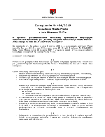 Zarządzenie Nr 424/2015 Prezydenta Miasta Płocka z dnia 18 marca 2015 r. w sprawie: przeprowadzenia konsultacji społecznych dotyczących opracowania dokumentu pn. „Lokalny Program Rewitalizacji Miasta Płocka Aktualizacja na lata 2014–2020 i lata następne”. Na podstawie art. 5a ustawy z dnia 8 marca 1990 r. o samorządzie gminnym (Tekst jednolity Dz. U. z 2013 r. poz. 594 ze zm.) oraz §3 i §4 pkt 2 Uchwały Nr 848/L/2014 Rady Miasta Płocka z dnia 26 sierpnia 2014 r. w sprawie zasad i trybu przeprowadzenia konsultacji społecznych na terenie Miasta Płocka zarządzam co następuje: §1 Postanawiam przeprowadzić konsultacje społeczne dotyczące opracowania dokumentu pn. „Lokalny Program Rewitalizacji Miasta Płocka - Aktualizacja na lata 2014–2020 i lata następne”. §2 Celem konsultacji społecznych jest: 1. zapewnienie udziału lokalnej społeczności przy aktualizacji programu rewitalizacji, 2. pozyskanie partnerów do realizacji projektów rewitalizacyjnych, 3. identyfikacja lokalnych liderów w zakresie planowanych działań rewitalizacyjnych, 4. maksymalizacja efektywności i trafności wypracowanych kierunków działań. 1. 2. 3. 1. §3 Konsultacje społeczne polegać będą na wyrażeniu opinii, złożeniu uwag, wniosków i propozycji w zakresie objętym przedmiotem konsultacji. W szczególności konsultacje przeprowadzone zostaną w formie: a) spotkań, b) debat publicznych; c) przekazania do zaopiniowania projektu aktualizacji programu rewitalizacji. W konsultacjach uczestniczyć będą mogli wszyscy mieszkańcy Płocka, podmioty gospodarcze, organizacje pozarządowe, właściciele nieruchomości i inne podmioty, które będą zainteresowane tematyką objętą zakresem konsultacji. Konsultacje społeczne prowadzone będą z uwzględnieniem zapisów ustawy z dnia 3.10.2008 r. o udostępnianiu informacji o środowisku i jego ochronie, udziale społeczeństwa w ochronie środowiska oraz o ocenach oddziaływania na środowisko. §4 Informacje o prowadzonych konsultacjach, w tym terminy i miejsca spotkań, debat, przyjmowania wniosków i uwag do projektu dokumentu przekazane zostaną za pośrednictwem: a) strony internetowej: www.plock.eu - zakładka „Konsultacje Społeczne” oraz 2. 1. 2. „Rewitalizacja”; b) mediów lokalnych; c) portalu społecznościowego. W ramach prowadzonych konsultacji będzie możliwość wnoszenia uwag i wniosków w formie pisemnej w wersji papierowej oraz elektronicznej na adres [email protected] §5 Konsultacje społeczne zostaną przeprowadzone w terminie od 27 marca do 31 grudnia 2015 roku. Wyniki konsultacji społecznych zostaną umieszczone na stronie internetowej Urzędu Miasta Płocka w zakładce „Rewitalizacja” i „Konsultacje Społeczne”. §6 Jednostką organizacyjną odpowiedzialną za przeprowadzenie konsultacji jest: 1. w zakresie przebiegu konsultacji - Zespół Komunikacji Społecznej w Oddziale Informacji Miejskiej, Wydział Promocji i Informacji; 2. w zakresie przedmiotu konsultacji - Referat Rewitalizacji i Estetyzacji Miasta w Wydziale Rozwoju i Polityki Gospodarczej Miasta. §7 Wykonanie zarządzenia powierzam Zastępcy Prezydenta Miasta Płocka ds. Polityki Społecznej oraz ds. Rozwoju i Inwestycji. §8 Zarządzenie wchodzi w życie z dniem podpisania. Prezydent Miasta Płocka /-/ Andrzej Nowakowski
