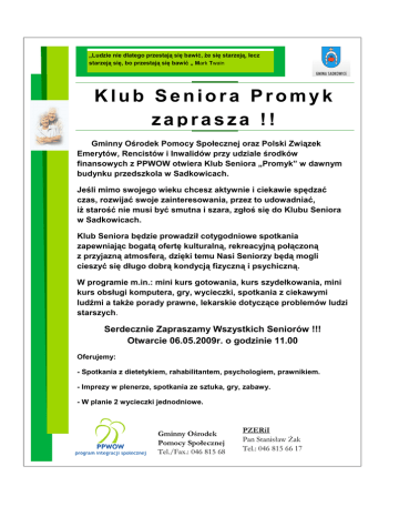 „Ludzie nie dlatego przestają się bawić, Ŝe się starzeją, lecz starzeją się, bo przestają się bawić „ Mark Twain Klub Seniora Promyk zaprasza !! Gminny Ośrodek Pomocy Społecznej oraz Polski Związek Emerytów, Rencistów i Inwalidów przy udziale środków finansowych z PPWOW otwiera Klub Seniora „Promyk” w dawnym budynku przedszkola w Sadkowicach. Jeśli mimo swojego wieku chcesz aktywnie i ciekawie spędzać czas, rozwijać swoje zainteresowania, przez to udowadniać, iŜ starość nie musi być smutna i szara, zgłoś się do Klubu Seniora w Sadkowicach. Klub Seniora będzie prowadził cotygodniowe spotkania zapewniając bogatą ofertę kulturalną, rekreacyjną połączoną z przyjazną atmosferą, dzięki temu Nasi Seniorzy będą mogli cieszyć się długo dobrą kondycją fizyczną i psychiczną. W programie m.in.: mini kurs gotowania, kurs szydełkowania, mini kurs obsługi komputera, gry, wycieczki, spotkania z ciekawymi ludźmi a takŜe porady prawne, lekarskie dotyczące problemów ludzi starszych. Serdecznie Zapraszamy Wszystkich Seniorów !!! Otwarcie 06.05.2009r. o godzinie 11.00 Oferujemy: - Spotkania z dietetykiem, rahabilitantem, psychologiem, prawnikiem. - Imprezy w plenerze, spotkania ze sztuka, gry, zabawy. - W planie 2 wycieczki jednodniowe. Gminny Ośrodek Pomocy Społecznej Tel./Fax.: 046 815 68 PZERiI Pan Stanisław śak Tel.: 046 815 66 17