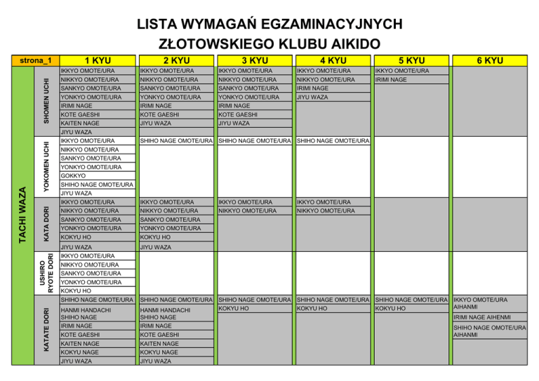 LISTA WYMAGAŃ EGZAMINACYJNYCH ZŁOTOWSKIEGO KLUBU AIKIDO SHOMEN UCHI strona_1 1 KYU 2 KYU 3 KYU 4 KYU 5 KYU IKKYO OMOTE/URA IKKYO OMOTE/URA IKKYO OMOTE/URA IKKYO OMOTE/URA IKKYO OMOTE/URA NIKKYO OMOTE/URA NIKKYO OMOTE/URA NIKKYO OMOTE/URA NIKKYO OMOTE/URA IRIMI NAGE SANKYO OMOTE/URA SANKYO OMOTE/URA SANKYO OMOTE/URA IRIMI NAGE YONKYO OMOTE/URA YONKYO OMOTE/URA YONKYO OMOTE/URA JIYU WAZA IRIMI NAGE IRIMI NAGE IRIMI NAGE KOTE GAESHI KOTE GAESHI KOTE GAESHI KAITEN NAGE JIYU WAZA JIYU WAZA SHIHO NAGE OMOTE/URA SHIHO NAGE OMOTE/URA SHIHO NAGE OMOTE/URA IKKYO OMOTE/URA IKKYO OMOTE/URA IKKYO OMOTE/URA IKKYO OMOTE/URA NIKKYO OMOTE/URA NIKKYO OMOTE/URA NIKKYO OMOTE/URA NIKKYO OMOTE/URA SANKYO OMOTE/URA SANKYO OMOTE/URA YONKYO OMOTE/URA YONKYO OMOTE/URA KOKYU HO KOKYU HO JIYU WAZA JIYU WAZA SHIHO NAGE OMOTE/URA SHIHO NAGE OMOTE/URA SHIHO NAGE OMOTE/URA SHIHO NAGE OMOTE/URA HANMI HANDACHI SHIHO NAGE HANMI HANDACHI SHIHO NAGE KOKYU HO KOKYU HO KOKYU HO IRIMI NAGE IRIMI NAGE KOTE GAESHI KOTE GAESHI KAITEN NAGE KAITEN NAGE KOKYU NAGE KOKYU NAGE JIYU WAZA JIYU WAZA 6 KYU YOKOMEN UCHI KATA DORI USHIRO RYOTE DORI IKKYO OMOTE/URA NIKKYO OMOTE/URA SANKYO OMOTE/URA YONKYO OMOTE/URA GOKKYO SHIHO NAGE OMOTE/URA JIYU WAZA IKKYO OMOTE/URA NIKKYO OMOTE/URA SANKYO OMOTE/URA YONKYO OMOTE/URA KOKYU HO SHIHO NAGE OMOTE/URA KATATE DORI TACHI WAZA JIYU WAZA IKKYO OMOTE/URA AIHANMI IRIMI NAGE AIHENMI SHIHO NAGE OMOTE/URA AIHANMI 1 KYU 2 KYU 3 KYU SHIHO NAGE OMOTE/URA SHIHO NAGE OMOTE/URA SHIHO NAGE OMOTE/URA HANMI HANDACHI SHIHO NAGE OMOTE/URA TEN CHI NAGE TEN CHI NAGE KOKYU HO KOKYU HO IRIMI NAGE IRIMI NAGE IRIMI NAGE KOTE GAESHI KOTE GAESHI KOTE GAESHI RYOTE DORI 3 RODZAJE KATATE DORI 3 RODZAJE MOROTE DORI KOKYU HO KATATE DORI 3 RODZAJE MOROTE DORI KOKYU HO RYOTE DORI 5 KYU 6 KYU TEN CHI NAGE KOKYU HO TSUKI KAITEN NAGE JIYU WAZA MOROTE DORI 3 RODZAJE SHOMEN UCHI IKKYO OMOTE/URA IKKYO OMOTE/URA NIKKYO OMOTE/URA NIKKYO OMOTE/URA NIKKYO OMOTE/URA NIKKYO OMOTE/URA SANKYO OMOTE/URA SANKYO OMOTE/URA SANKYO OMOTE/URA YONKYO OMOTE/URA YONKYO OMOTE/URA YONKYO OMOTE/URA IKKYO OMOTE/URA IKKYO OMOTE/URA IKKYO OMOTE/URA NIKKYO OMOTE/URA NIKKYO OMOTE/URA NIKKYO OMOTE/URA NIKKYO OMOTE/URA SANKYO OMOTE/URA SANKYO OMOTE/URA YONKYO OMOTE/URA YONKYO OMOTE/URA KOKYU HO KOKYU HO KOKYU HO KOKYU HO KOKYU HO KOKYU HO 1-7 SUBURI 1-7 SUBURI 1-7 SUBURI 1-7 SUBURI 1-7 SUBURI 1-3 SUBURI HAPPOGIRI HAPPOGIRI HAPPOGIRI HAPPOGIRI 1-10 AWASE 1-10 AWASE 1-5 AWASE 1-5 KUMITACHI 1-3 KUMITACHI 1-5 SUBURI 1-3 SUBURI BOKKEN KATA DORI IKKYO OMOTE/URA YOKOMEN UCHI MOROTE DORI KOKYU HO IKKYO OMOTE/URA IKKYO OMOTE/URA NIKKYO OMOTE/URA SANKYO OMOTE/URA YONKYO OMOTE/URA GOKKYO KIMUSUBI NO TACHI JO SUWARI WAZA BUKI WAZA 4 KYU KOKYU HO JIYU WAZA KOKYU NAGE TACHI WAZA strona_2 1-20 SUBURI 1-20 SUBURI 31 KATA 31 KATA 1-13 SUBURI 1-10 SUBURI 31 KATA KUMI JO 13 KATA 60 po 2 kyu Minimalna ilość treningów pozwalająca przystąpić do egzaminu 50 po 3 kyu 50 po 4 kyu 40 po 5 kyu 30 po 6 kyu 25 dni treningowych
