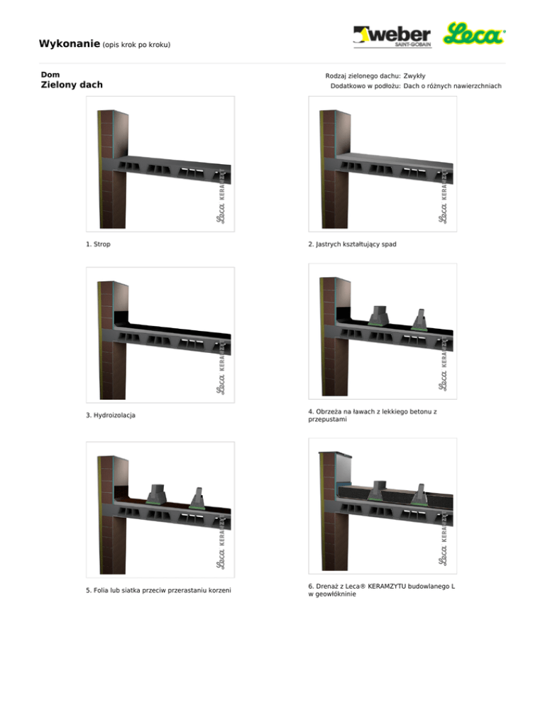 Wykonanie (opis krok po kroku) Dom Zielony dach Rodzaj zielonego dachu: Zwykły Dodatkowo w podłożu: Dach o różnych nawierzchniach 1. Strop 2. Jastrych kształtujący spad 3. Hydroizolacja 4. Obrzeża na ławach z lekkiego betonu z przepustami 5. Folia lub siatka przeciw przerastaniu korzeni 6. Drenaż z Leca® KERAMZYTU budowlanego L w geowłókninie Wykonanie (opis krok po kroku) 7. Nawierzchnie zielonego dachu