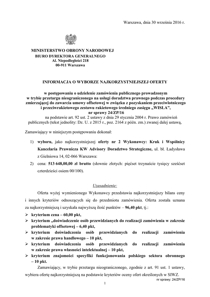 Warszawa, dnia 30 września 2016 r. MINISTERSTWO OBRONY NARODOWEJ BIURO DYREKTORA GENERALNEGO Al. Niepodległości 218 00-911 Warszawa INFORMACJA O WYBORZE NAJKORZYSTNIEJSZEJ OFERTY w postępowaniu o udzielenie zamówienia publicznego prowadzonym w trybie przetargu nieograniczonego na usługi doradztwa prawnego podczas procedury zmierzającej do zawarcia umowy offsetowej w związku z pozyskaniem przeciwlotniczego i przeciwrakietowego zestawu rakietowego średniego zasięgu „WISŁA”, nr sprawy 24/ZP/16 na podstawie art. 92 ust. 2 ustawy z dnia 29 stycznia 2004 r. Prawo zamówień publicznych (tekst jednolity: Dz. U. z 2015 r., poz. 2164 z późn. zm.) zwanej dalej ustawą, Zamawiający w niniejszym postępowaniu dokonał: 1) wyboru, jako najkorzystniejszej oferty nr 2 Wykonawcy: Kruk i Wspólnicy Kancelaria Prawnicza KW Advisory Doradztwo Strategiczne, ul. bł. Ładysława z Gielniowa 14, 02-066 Warszawa: 2) cena: 513 648,00,00 zł brutto (słownie złotych: pięćset trzynaście tysięcy sześćset czterdzieści osiem 00/100). Uzasadnienie: Oferta wyżej wymienionego Wykonawcy przedstawia najkorzystniejszy bilans ceny i innych kryteriów odnoszących się do przedmiotu zamówienia. Oferta została uznana za najkorzystniejszą i uzyskała najwyższą ilość punktów – 96,40 pkt, tj.: kryterium cena – 60,00 pkt, kryterium „doświadczenie osób przewidzianych do realizacji zamówienia w zakresie problematyki offsetowej – 6,40 pkt, kryterium doświadczenia osób przewidzianych do realizacji zamówienia w zakresie prawa handlowego – 10 pkt, kryterium doświadczenia osób przewidzianych do realizacji zamówienia w zakresie prawa własności intelektualnej – 10 pkt, kryterium znajomości specyfiki funkcjonowania polskiego sektora obronnego – 10 pkt. Zamawiający, w trybie przetargu nieograniczonego, zgodnie z art. 91 ust. 1 ustawy, wybiera ofertę najkorzystniejszą na podstawie kryteriów oceny ofert określonych w SIWZ. nr sprawy: 24/ZP/16 1 Zgodnie z zapisem zawartym w SIWZ, Rozdział XIII Opis kryteriów i sposobu dokonywania oceny oferty, ust. 2: przy wyborze najkorzystniejszej oferty Zamawiający kierował się następującym kryterium i jego znaczeniem: Nr Kryterium Znaczenie procentowe kryterium 1. Cena (A) 60% 100 Maksymalna ilość punktów, jakie może otrzymać oferta za dane kryterium po uwzględnieniu wagi kryterium 60 2. Doświadczenie osób przewidzianych do realizacji zamówienia w zakresie problematyki offsetowej (stosowanie przepisów ustawy z dn. 10 września 1999 r. o niektórych umowach kompensacyjnych zawieranych w związku z umowami dostawy na potrzeby obronności i bezpieczeństwa państwa lub ustawy z dn. 26 czerwca 2014 r. o niektórych umowach zawieranych w związku z realizacją zamówień o podstawowym znaczenia dla bezpieczeństwa państwa)(B) Doświadczenie osób przewidzianych do realizacji zamówienia w zakresie prawa handlowego (C) 10% 100 10 10% 100 10 3. Maksymalna ilość punktów do uzyskania w danym kryterium 4. Doświadczenie osób przewidzianych do realizacji zamówienia w zakresie prawa własności intelektualnej (D) 10% 100 10 5. Znajomość specyfiki funkcjonowania polskiego sektora obronnego (E) 10% 100 10 Streszczenie oceny i porównania ofert Liczba pkt Nr oferty Nazwa (firma) i adres wykonawcy kryterium (A) – 60 pkt kryterium (B) – 10 pkt kryterium (C) – 10 pkt kryterium (D) – 10 pkt kryterium (E) – 10 pkt Razem pkt 1 KPWW Kancelaria Prawnicza Pasierbiak, Wasilewski i Wspólnicy Sp.k. ul. Nowy Świat 49 l. 201-206 00-042 Warszawa 51,18 10,00 3,50 10,00 5,00 79,68 2 Jarosław Kruk Kruk i Wspólnicy Kancelaria Prawnicza KW Advisory Doradztwo Strategiczne ul. bł. Ładysława z Gielniowa 14 02-066 Warszawa 60 6,40 10,00 10,00 10,00 96,40 nr sprawy: 24/ZP/16 2