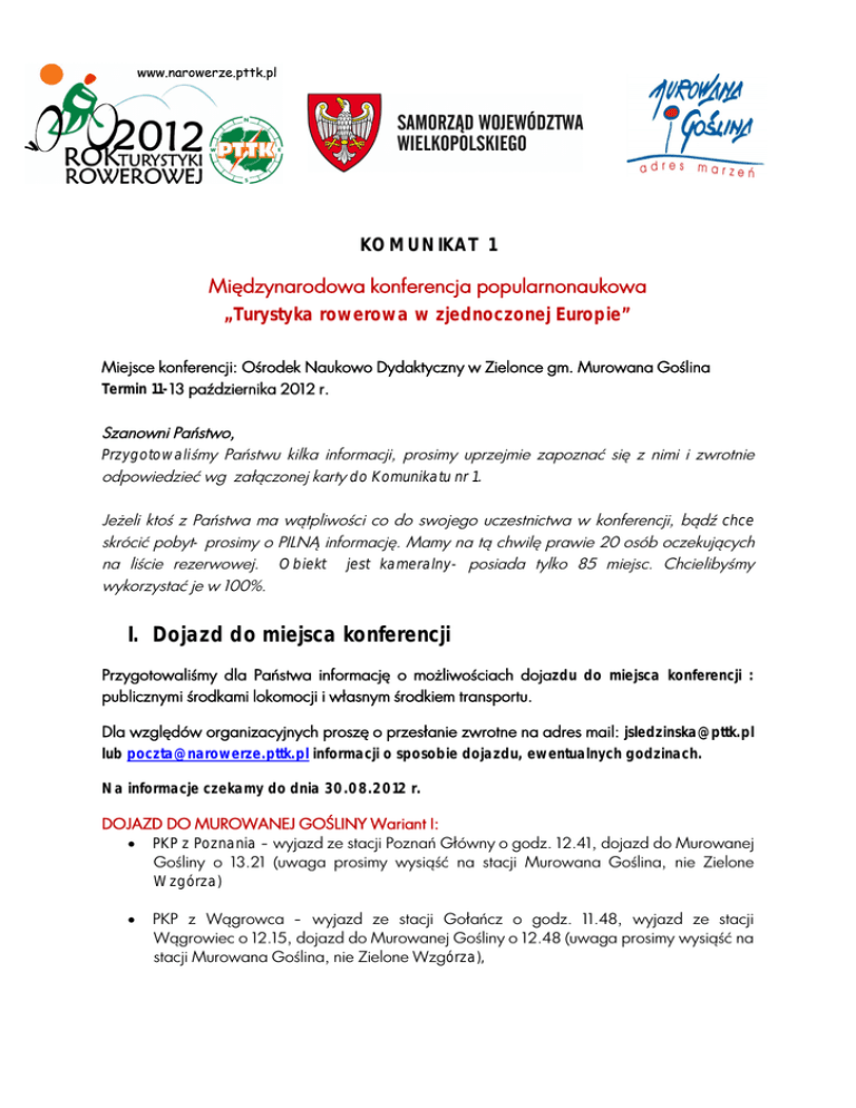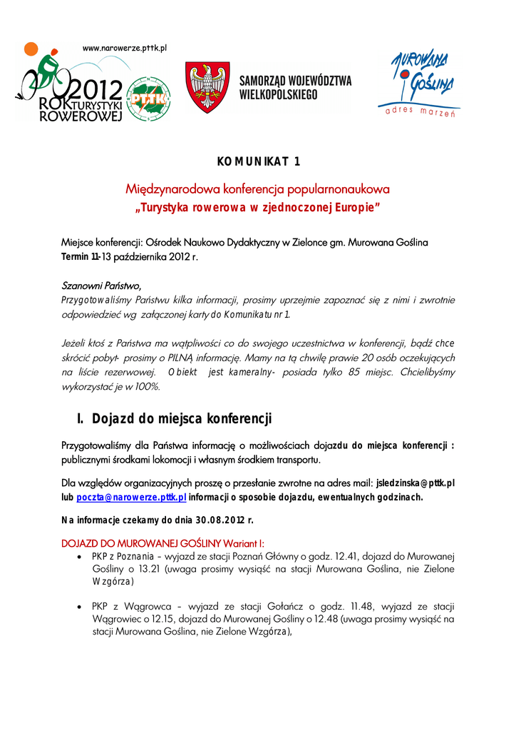 KOMUNIKAT 1 Międzynarodowa konferencja popularnonaukowa „Turystyka rowerowa w zjednoczonej Europie” Miejsce konferencji: Ośrodek Naukowo Dydaktyczny w Zielonce gm. Murowana Goślina Termin 11-13 października 2012 r. Szanowni Państwo, Przygotowaliśmy Państwu kilka informacji, prosimy uprzejmie zapoznać się z nimi i zwrotnie odpowiedzieć wg załączonej karty do Komunikatu nr 1. Jeżeli ktoś z Państwa ma wątpliwości co do swojego uczestnictwa w konferencji, bądź chce skrócić pobyt- prosimy o PILNĄ informację. Mamy na tą chwilę prawie 20 osób oczekujących na liście rezerwowej. Obiekt jest kameralny- posiada tylko 85 miejsc. Chcielibyśmy wykorzystać je w 100%. I. Dojazd do miejsca konferencji Przygotowaliśmy dla Państwa informację o możliwościach dojazdu do miejsca konferencji : publicznymi środkami lokomocji i własnym środkiem transportu. Dla względów organizacyjnych proszę o przesłanie zwrotne na adres mail: [email protected] lub [email protected] informacji o sposobie dojazdu, ewentualnych godzinach. Na informacje czekamy do dnia 30.08.2012 r. DOJAZD DO MUROWANEJ GOŚLINY Wariant I: PKP z Poznania – wyjazd ze stacji Poznań Główny o godz. 12.41, dojazd do Murowanej Gośliny o 13.21 (uwaga prosimy wysiąść na stacji Murowana Goślina, nie Zielone Wzgórza) PKP z Wągrowca – wyjazd ze stacji Gołańcz o godz. 11.48, wyjazd ze stacji Wągrowiec o 12.15, dojazd do Murowanej Gośliny o 12.48 (uwaga prosimy wysiąść na stacji Murowana Goślina, nie Zielone Wzgórza), Autobusem linii 341 z Poznania z Ronda Śródka (dojazd w Poznaniu do Ronda Śródka z dworca PKP – przystanek Most Dworcowy tramwajem linii nr 6), II wersje: 1. wyjazd autobusu z Ronda Śródka o godz. 11.10, dojazd do Murowanej Gośliny (przystanek Rynek na placu Powstańców Wielkopolskich) o godz. 11.57, 2. wyjazd autobusu z Ronda Śródka o godz. 12.05, dojazd do Murowanej Gośliny (przystanek Rynek na placu Powstańców Wielkopolskich) o godz. 12.52, Autobusem linii 348 z Poznania z Pętli PST na Osiedlu Sobieskiego (dojazd w Poznaniu do Pętli PST z dworca PKP – przystanek Dworzec Zachodni tramwajem linii nr 14 – zawieszona na razie do 3 września), wyjazd autobusu z Pętli PST na Osiedlu Sobieskiego o godz. 12.20, dojazd do Murowanej Gośliny (przystanek Rynek na placu Powstańców Wielkopolskich) o godz. 12.55. Dojście do stacji PKP ok 500 m. Na przystanku autobusowym będzie czekała osoba, która będzie przewodnikiem na stację. Rozkład jazdy autobusów 341 i 348 (na stronie www.narowerze.pttk.pl) Istnieje również alternatywna możliwość dojazdu autobusami PKS z Dworca PKS w Poznaniu. Cena biletu PKP z Poznania do Murowanej Gośliny 6,80 zł Cena biletu autobusowego na trasie Poznań – Murowana Goślina 6,50 zł DOJAZD Z MUROWANEJ GOŚLINY DO ZIELONKI: O godz. 13.00 i 13.30 wyjadą podstawione przy stacji PKP w Murowanej Goślinie autobusy, które dowiozą chętnych do Zielonki. UWAGA! Proszę przed wyjazdem sprawdzić aktualny rozkład jazdy! DOJAZD DLA UCZESTNIKÓW KONFERENCJI SAMOCHODAMI WŁASNYMI- WARIANT II DOJAZD DO MUROWANEJ GOŚLINY: od strony Poznania – drogą wojewódzką 196 (żółte oznakowanie) - wyjazd ul. Gdyńską, przez Koziegłowy, Czerwonak, Owińska, Bolechowo, Murowana Goślina (uwaga na początku obwodnicy skręcić w prawo), od strony Poznania – przez Morasko, Radojewo, Biedrusko, Promnice, Bolechowo, Murowana Goślina (uwaga na początku obwodnicy skręcić w prawo), od strony Obornik – drogą wojewódzką 187 (żółte oznakowanie) – przez Uchorowo, Białężyn, Białęgi, Przebędowo, Murowana Goślina, od strony Piły przez Rogożno – drogą powiatową przez Długą Goślinę, przejazd przez obwodnicę na wprost (uwaga niebezpieczne miejsce), Trojanowo, Przebędowo, Murowana Goślina, od strony Wągrowca – drogą wojewódzką 196 (żółte oznakowanie) przez Skoki, Sławę Wlkp., Łopuchowo, Trojanowo, Przebędowo, Murowana Goślina, od strony Gniezna – drogą wojewódzką 197 (żółte oznakowanie) przez Kiszkowo, Rejowiec, Sławę Wlkp., dalej drogą wojewódzką 196 przez Łopuchowo, Trojanowo, Przebędowo, Murowana Goślina, DOJAZD Z MUROWANEJ GOŚLINY DO ZIELONKI: I droga: w Murowanej Goślinie zjazd z ul. Rogozińskiej w ul. Polną, przejazd przez linię kolejową (bez zapór), przez Strefę Przemysłową, na końcu drogi skręcić w lewo w drogę powiatową do Boduszewa, w Boduszewie prosto w kierunku Zielonki, obok leśniczówki Boduszewo, wjazd do Puszczy Zielonka (witacz), Zielonka, parking przy Ośrodku Naukowo-Dydaktycznym II droga: w Murowanej Goślinie skręcić w ul. Mostową, na końcu skręcić w prawo, przejazd przez most nad linią kolejową (uwaga światła), dalej ul. Gnieźnieńską do granic Murowanej Gośliny, następnie w lewo do Boduszewa, w Boduszewie prosto w kierunku Zielonki, obok leśniczówki Boduszewo, wjazd do Puszczy Zielonka (witacz), Zielonka, parking przy Ośrodku Naukowo-Dydaktycznym. UWAGA! (mapa dojazdu dostępna na stronie www.narowerze.pttk.pl w zakładce KONFERENCJA) II. Warsztaty terenowe- poznanie PUSZCZY ZIELONKA. Przygotowaliśmy dla Państwa kilka propozycji, natomiast ze względów organizacyjnych (wypożyczenie transportu, rowerów itd.) bardzo proszę o określenie się, z którego wariantu będą Państwo korzystać. Na informację czekamy [email protected] lub [email protected] do 30.08.2012r. adres mail: PREZENTACJA PUSZCZY ZIELONKA I OKOLIC TERMIN: 12 października 2012 r. Godziny: 14.00 – 19.00 1. Wyjazd promocyjny autokarowy – zwiedzanie wybranych obiektów na Szlaku Kościołów Drewnianych, Szlaku Cysterskim oraz wieży widokowej na Dziewiczej Górze, Wstępny plan: Szlak Cysterski: Zespół Pocysterski w Owińskach, Wieża widokowa na Dziewiczej Górze, Szlak Kościołów Drewnianych: Kościoły w Kicinie (powiązany z Janem Kochanowskim) i Wierzenicy (powiązany z Augustem Cieszkowskim) W trakcie kawa, herbata i słodki poczęstunek, przewidywany cz