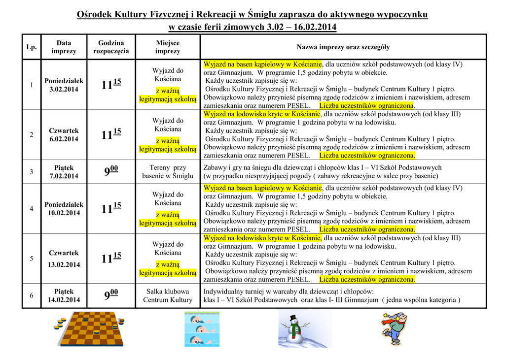 Ośrodek Kultury Fizycznej i Rekreacji w Śmiglu zaprasza do aktywnego wypoczynku w czasie ferii zimowych 3.02 – 16.02.2014 Lp. Data imprezy Godzina rozpoczęcia 1 Poniedziałek 3.02.2014 1115 2 Czwartek 6.02.2014 1115 3 Piątek 7.02.2014 900 4 5 6 Poniedziałek 10.02.2014 1115 Czwartek 13.02.2014 1115 Piątek 14.02.2014 900 Miejsce imprezy Nazwa imprezy oraz szczegóły Wyjazd na basen kąpielowy w Kościanie, dla uczniów szkół podstawowych (od klasy IV) oraz Gimnazjum. W programie 1,5 godziny pobytu w obiekcie. Każdy uczestnik zapisuje się w: Ośrodku Kultury Fizycznej i Rekreacji w Śmiglu – budynek Centrum Kultury 1 piętro. z ważną Obowiązkowo należy przynieść pisemną zgodę rodziców z imieniem i nazwiskiem, adresem legitymacją szkolną zamieszkania oraz numerem PESEL. Liczba uczestników ograniczona. Wyjazd na lodowisko kryte w Kościanie, dla uczniów szkół podstawowych (od klasy III) Wyjazd do oraz Gimnazjum. W programie 1 godzina pobytu w na lodowisku. Kościana Każdy uczestnik zapisuje się w: Ośrodku Kultury Fizycznej i Rekreacji w Śmiglu – budynek Centrum Kultury 1 piętro. z ważną legitymacją szkolną Obowiązkowo należy przynieść pisemną zgodę rodziców z imieniem i nazwiskiem, adresem zamieszkania oraz numerem PESEL. Liczba uczestników ograniczona. Wyjazd do Kościana Tereny przy basenie w Śmiglu Zabawy i gry na śniegu dla dziewcząt i chłopców klas I – VI Szkół Podstawowych (w przypadku niesprzyjającej pogody ( zabawy rekreacyjne w salce przy basenie) Wyjazd na basen kąpielowy w Kościanie, dla uczniów szkół podstawowych (od klasy IV) oraz Gimnazjum. W programie 1,5 godziny pobytu w obiekcie. Każdy uczestnik zapisuje się w: Ośrodku Kultury Fizycznej i Rekreacji w Śmiglu – budynek Centrum Kultury 1 piętro. z ważną legitymacją szkolną Obowiązkowo należy przynieść pisemną zgodę rodziców z imieniem i nazwiskiem, adresem zamieszkania oraz numerem PESEL. Liczba uczestników ograniczona. Wyjazd na lodowisko kryte w Kościanie, dla uczniów szkół podstawowych (od klasy III) Wyjazd do oraz Gimnazjum. W programie 1 godzina pobytu w na lodowisku. Kościana Każdy uczestnik zapisuje się w: Ośrodku Kultury Fizycznej i Rekreacji w Śmiglu – budynek Centrum Kultury 1 piętro. z ważną legitymacją szkolną Obowiązkowo należy przynieść pisemną zgodę rodziców z imieniem i nazwiskiem, adresem zamieszkania oraz numerem PESEL. Liczba uczestników ograniczona. Wyjazd do Kościana Salka klubowa Centrum Kultury Indywidualny turniej w warcaby dla dziewcząt i chłopców: klas I – VI Szkół Podstawowych oraz klas I- III Gimnazjum ( jedna wspólna kategoria )