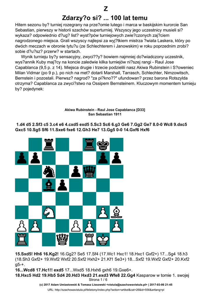 Z Zdarzy?o si? ... 100 lat temu Hitem sezonu by? turniej rozegrany na prze?omie lutego i marca w baskijskim kurorcie San Sebastian, pierwszy w historii szachów superturniej. Wszyscy jego uczestnicy musieli si? wykaza? odpowiednio d?ug? list? wyst?pów turniejowych zwie?czonych zaj?ciem nagrodzonego miejsca. Grali wszyscy najlepsi za wyj?tkiem mistrza ?wiata Laskera, który po dwóch meczach w obronie tytu?u (ze Schlechterem i Janowskim) w roku poprzednim zrobi? sobie d?u?sz? przerw? w startach. Wynik turnieju by?y sensacyjny, zwyci??y? bowiem najmniej do?wiadczony uczestnik, wys?annik Kuby maj?cy na koncie zaledwie kilka turniejów ni?szej rangi - Raul Jose Capablanca (9,5 p. z 14). Miejsca drugie i trzecie podzielili nasz Akiwa Rubinstein i S?oweniec Milan Vidmar (po 9 p.), po nich na met? dotarli Marshall, Tarrasch, Schlechter, Nimzowitsch, Bernstein i pozostali. Pierwsz? nagrod? "za pi?kno??" ufundowan? przez barona Rotszylda otrzyma? Capablanca za zwyci?stwo na Ossipem Bernsteinem. Kluczowym momentem turnieju by? pojedynek: Akiwa Rubinstein - Raul Jose Capablanca [D33] San Sebastian 1911 1.d4 d5 2.Sf3 c5 3.c4 e6 4.cxd5 exd5 5.Sc3 Sc6 6.g3 Ge6 7.Gg2 Ge7 8.0-0 Wc8 9.dxc5 Gxc5 10.Sg5 Sf6 11.Sxe6 fxe6 12.Gh3 He7 13.Gg5 0-0 14.Gxf6 Hxf6 15.Sxd5! Hh6 16.Kg2! 16.Gg2? Se5 17.Sf4 (17.Wc1 Hxc1! 18.Hxc1 Gxf2+) 17...Sg4 18.h3 (18.Sh3 Gxf2+ 19.Wxf2 Wxf2 20.Sxf2 Hxh2+ 21.Kf1 Se3+) 18...Sxf2 19.Wxf2 Gxf2+ 20.Kxf2 g5-+. 16...Wcd8 17.Hc1!! exd5 17...Wxd5 18.Hxh6 gxh6 19.Gxe6+. 18.Hxc5 Hd2 19.Hb5 Sd4 20.Hd3 Hxd3 21.exd3 Wfe8 22.Gg4 Kasparow w tomie 1. swojej Strona 1 / 6 (c) 2017 Adam Umiastowski & Tomasz Lissowski <[email protected]> | 2017-03-06 21:45 URL: http://szachowavistula.pl/felietony/index.php?action=artikel&cat=26&id=556&artlang=pl Z fundamentalnego dzie?a "Moi wielcy poprzednicy" za lepsze uwa?a 22.Wfe1 Sc2 23.Wxe8+ Wxe8 24.Wd1 itd. 22...Wd6 23.Wfe1 Wxe1 24.Wxe1 Wb6 25.We5 Wxb2 26.Wxd5 Sc6 27.Ge6+ Kf8 28.Wf5+ Ke8 29.Gf7+ Kd7 30.Gc4 a6 Capablanca widzia? szanse na ratunek w wariancie 30...Kd6! 31.Wb5 Wxb5 32.Gxb5 Sd4 33.Ga4 b5; ale komputery Kasparowa ka?? gra? 31.Wf7, co ma prowadzi? do zwyci?stwa. 31.Wf7+ Kd6 32.Wxg7 b5 33.Gg8 a5 34.Wxh7 a4 35.h4 b4 36.Wh6+ Kc5 37.Wh5+ Kb6 38.Gd5? Prawid?owe wg Kasparowa by?o 38.Gc4 b3 39.axb3 a3 40.Wb5+ Kc7 41.b4+. 38...b3? Pogodzony z pora?k? Capablanca nie zauwa?y? ratuj?cego uderzenia 38...Wxa2!!, po którym nawet Kasparow nie zdo?a? odszuka? wygranej dla bia?ych. 39.axb3 a3 40.Gxc6 Wxb3 40...a2 41.Wb5+ Ka6 42.Wb8 41.Gd5 a2 42.Wh6+ 1-0. Po tym turnieju Kuba?czyk natychmiast zacz?? by? uwa?any za realnego pretendenta do tytu?u mistrza ?wiata, zmuszaj?c Rubinsteina do podzielenia si? tym splendorem. Niebawem rz?d kuba?ski zaoferowa? Capablance wyj?tkowo dobrze p?atn? funkcj? dyplomaty, co oznacza?o stabilizacj? finansow? na ca?e dziesi?ciolecia i mo?liwo?? nieskr?powanego po?wi?cenia si? szachom. A tymczasem niewiele brakowa?o, by genialny Capablanca turnieju w San Sebastian nie wygra?! Gdyby Dawid Janowski w odpowiednim momencie ?wietnie prowadzonej partii znalaz? wygrywaj?cy wariant... Raul Jose Capablanca - Dawid Janowski [D40] San Sebastian 1911 1.d4 d5 2.e3 Sf6 3.Sf3 c5 4.c4 e6 5.Sc3 Ge7 6.dxc5 0-0 7.a3 Gxc5 8.b4 Ge7 9.Gb2 a5 10.b5 Strona 2 / 6 (c) 2017 Adam Umiastowski & Tomasz Lissowski <[email protected]> | 2017-03-06 21:45 URL: http://szachowavistula.pl/felietony/index.php?action=artikel&cat=26&id=556&artlang=pl Z b6 11.cxd5 exd5 12.Sd4 Gd6 13.Ge2 Ge6 14.Gf3 Wa7 15.0-0 Wc7 16.Hb3 Sbd7 17.Wfd1 Se5 18.Ge2 He7 19.Wac1 Wfc8 20.Sa4 Wxc1 21.Wxc1 Wxc1+ 22.Gxc1 Se4 23.Gb2 23...Sc4! 24.Gxc4 Gxh2+! 25.Kxh2 Hh4+ 26.Kg1 Hxf2+ 27.Kh2 Hg3+ 28.Kg1 dxc4 29.Hc2 Hxe3+ 30.Kh2 Hh6+ 31.Kg1 He3+ 32.Kh2 Hg3+ 33.Kg1 He1+ 34.Kh2 Sf6 (Czarne tymczasowo oddaj? drug? figur?.) 35.Sxe6 Hh4+ 36.Kg1 He1+ 37.Kh2 Hh4+ 38.Kg1 Sg4 39.Hd2 Hh2+ 40.Kf1 Hh1+ 41.Ke2 Hxg2+ 42.Kd1 Sf2+ 43.Kc2 Hg6+ 44.Kc1 Hg1+ 45.Kc2 Hg6+ 46.Kc1 Sd3+ 47.Kb1 fxe6 48.Hc2 h5 49.Gd4 h4 50.Gxb6 h3 51.Gc7 e5 52.b6 He4! 53.Gxe5 Strona 3 / 6 (c) 2017 Adam Umiastowski & Tomasz Lissowski <[email protected]> | 2017-03-06 21:45 URL: http://szachowavistula.pl/felietony/index.php?action=artikel&cat=26&id=556&artlang=pl Z 53...He1+? Ko?czy?o walk? 53...Hh1+ 54.Ka2 Sxe5 55.He2 Hg2 56.Sc3 Hxe2+ 57.Sxe2 h2 58.Sg3 Kf7 -+. 54.Ka2 Sxe5 55.b7 Sd7 56.Sc5 Sb8 57.Hxc4+ Kh8 58.Se4 Kh7? Wg Kasparowa zarówno 58...He3 jak i 58...Hh4 wci?? dawa?o du?e szanse na remis. 59.Hd3 g6 60.Hxh3+ Kg7 61.Hf3 Hc1 62.Hf6+ Kh7 63.Hf7+ Kh6 64.Hf8+ Kh5 65.Hh8+ Kg4 66.Hc8+ 1-0. Drugim punktem kulminacyjnym sezonu by? marato?ski (25 rund w ci?gu 35 dni sierpnia i wrze?nia) turniej w czeskim uzdrowisku Karlsbad. Bezapelacyjnym triumfatorem okaza? si? Niemiec Richard Teichmann, gromadz?c 18 punktów, o ca?y punkt przed Rubinsteinem i Schlechterem. Teichmanna, którego g?owa przes?oni?ta by?a jak u pirata czarn? opask? (choroba oka), zwano ?artobliwie Ryszardem Pi?tym, bo z uwagi na niedostatek walorów sportowych du?o remisowa? i zwykle w turniejach zadowala? si? czwart? lub pi?ta nagrod?. W Karlsbadzie Teichmann by? nie do poznania. Richard Teichmann - Carl Schlechter [C90] Karlsbad 1911 1.e4 e5 2.Sf3 Sc6 3.Gb5 a6 4.Ga4 Sf6 5.0-0 Ge7 6.We1 b5 7.Gb3 d6 8.c3 0-0 9.d3 Sa5 10.Gc2 c5 11.Sbd2 Hc7 12.Sf1 Sc6 13.Se3 Gb7 14.Sf5 Wfe8 15.Gg5 Sd7 16.Gb3 Sf8 17.Gd5 Sg6 (17...Gd8!) 18.Gxe7 Sgxe7 Strona 4 / 6 (c) 2017 Adam Umiastowski & Tomasz Lissowski <[email protected]> | 2017-03-06 21:45 URL: http://szachowavistula.pl/felietony/index.php?action=artikel&cat=26&id=556&artlang=pl Z 19.Gxf7+! Kxf7 20.Sg5+ Kg8 Albo 20...Kg6 21.Sxg7 Wh8 22.Hh5+ Kxg7 23.Hf7+ Kh6 24.Se6+. 21.Hh5 Sxf5 22.Hxh7+ Kf8 23.Hxf5+ Kg8 24.Hg6! Hd7 Nie pomaga 24...Se7 25.Hf7+ Kh8 26.We3 ani 24...Sd8 25.Hxe8 mat. 25.We3 1-0. Czwart? nagrod? (167 p.) zdoby? niezwykle utalentowany przedstawiciel szachowej ?odzi Hersz Rotlewi, do ostatnich rund bezkompromisowo walcz?cy (tylko 2 remisy!) z Teichmannem o prymat. Po kilku latach codziennych treningów z Rubinsteinem 20-letni Rotlewi uzyska? niezwyk?? bi