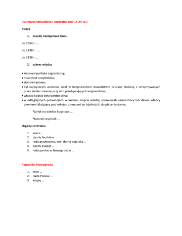 Ruś wczesnofeudalna i rozdrobniona (IX-XV w.) Książę 1. zasady następstwa tronu do 1054 r. … do 1138 r. … do 1328 r. … 2. zakres władzy kierował polityka zagraniczną; mianował urzędników; stanowił prawo; był najwyższym wodzem, miał w bezpośrednim dowództwie drużynę złożoną z utrzymywanych przez siebie i zawsze przy nim przebywających wojowników; władza księcia była bardzo silna; w odleglejszych prowincjach w imieniu księcia władzę sprawowali namiestnicy lub dawni władcy plemienni (książęta pod rukoju), zmuszeni do lojalności i do płacenia danin; *jarłyk na wielkie księstwo: … *tatarski wychod: … Organy centralne 1. 2. 3. 4. 5. wiece … zjazdy feudalne … rada przyboczna, tzw. duma bojarska … zjazdy książąt … rada panów w Nowogrodzie … Republika Nowogrodu 1. wiec … 2. Rada Panów … 3. książę … Rosja w okresie monarchii stanowej i absolutnej XV-XVII w. monarchia stanowa (funkcjonowanie soborów ziemskich i samorządów stanowych) XVII-XIX w. monarchia absolutna *władcy moskiewscy nosili tytuł wielkiego księcia Moskwy *od 1547 r. Iwan IV Groźny zaczął używać tytułu cara Car 1. zasady następstwa tronu następstwo tronu nie było uregulowane, tron obejmował syn lub córka, obowiązywało starszeństwo urodzenia, ale następcę wyznaczał ojciec; 1598-1613 – elekcyjność tronu, elekcji dokonywały Sobory Ziemskie (wielka smuta) 1797 – sukcesja w systemie kognatycznym, ustawa wydana przez Pawła I 2. zakres władzy władza samodzierżawna – … polityka zagraniczna; brak odpowiedzialności; powoływanie Soborów Ziemskich, określanie miejsca, czasu i porządku dziennego ich obrad; obsadzanie i kontrola urzędów; Organy centralne 1. Duma Bojarska … W XVII w. wykształciły się z niej pewne zespoły do określonych spraw: Rasprawnaja Pałata … Bliżnaja Duma … 2. Sobór Ziemski (1549-1665) …