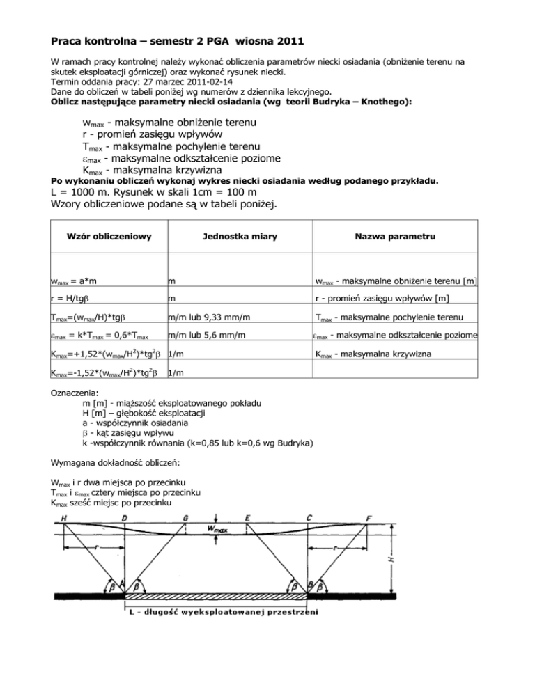 Praca kontrolna – semestr 2 PGA wiosna 2011 W ramach pracy kontrolnej należy wykonać obliczenia parametrów niecki osiadania (obniżenie terenu na skutek eksploatacji górniczej) oraz wykonać rysunek niecki. Termin oddania pracy: 27 marzec 2011-02-14 Dane do obliczeń w tabeli poniżej wg numerów z dziennika lekcyjnego. Oblicz następujące parametry niecki osiadania (wg teorii Budryka – Knothego): wmax - maksymalne obniżenie terenu r - promień zasięgu wpływów Tmax - maksymalne pochylenie terenu εmax - maksymalne odkształcenie poziome Kmax - maksymalna krzywizna Po wykonaniu obliczeń wykonaj wykres niecki osiadania według podanego przykładu. L = 1000 m. Rysunek w skali 1cm = 100 m Wzory obliczeniowe podane są w tabeli poniżej. Wzór obliczeniowy Jednostka miary Nazwa parametru wmax = a*m m wmax - maksymalne obniżenie terenu [m] r = H/tgβ m r - promień zasięgu wpływów [m] Tmax=(wmax/H)*tgβ m/m lub 9,33 mm/m Tmax - maksymalne pochylenie terenu εmax = k*Tmax = 0,6*Tmax m/m lub 5,6 mm/m εmax - maksymalne odkształcenie poziome Kmax=+1,52*(wmax/H2)*tg2β 1/m Kmax=-1,52*(wmax/H2)*tg2β 1/m Oznaczenia: m [m] - miąższość eksploatowanego pokładu H [m] – głębokość eksploatacji a - współczynnik osiadania β - kąt zasięgu wpływu k -współczynnik równania (k=0,85 lub k=0,6 wg Budryka) Wymagana dokładność obliczeń: Wmax i r dwa miejsca po przecinku Tmax i εmax cztery miejsca po przecinku Kmax sześć miejsc po przecinku Kmax - maksymalna krzywizna kąt zasięgu wpływów współczynnik k=0,85 lub 0,6 a β k 1 2,00 300,00 m [m] M [m] 0,70 63,00 a β 2 2,10 310,00 m [m] M [m] 0,10 63,10 a β 3 2,20 320,00 m [m] M [m] 0,15 63,20 a β 4 2,30 330,00 m [m] M [m] 0,20 63,30 a β 5 2,40 340,00 m [m] M [m] 0,70 63,40 a β 6 2,50 350,00 m [m] M [m] 0,10 63,50 a β 7 2,60 360,00 m [m] M [m] 0,15 63,60 a β 8 2,70 370,00 m [m] M [m] 0,20 63,70 a β 9 2,80 380,00 m [m] M [m] 0,70 63,80 a β 10 2,90 390,00 m [m] M [m] 0,10 63,90 a β 11 3,00 400,00 m [m] M [m] 0,15 63,00 a β 12 3,10 300,00 m [m] M [m] 0,20 63,10 a β 13 3,20 310,00 m [m] M [m] 0,70 63,20 a β zasięg wpływów m [m] M [m] NR w dzienniku współczynnik osiadania miąższość wybranego pokładu Tabela z danymi do obliczeń wg numerów z dziennika lekcyjnego 0 0,60 k 0 0,85 k 0 0,60 k 0 0,85 k 0 0,60 k 0 0,85 k 0 0,60 k 0 0,85 k 0 0,60 k 0 0,85 k 0 0,60 k 0 0,85 k 0 0,60 k 14 3,30 320,00 0,10 63,30 0 0,85 β m [m] M [m] a 15 3,40 330,00 m [m] M [m] 0,15 63,40 a β 16 3,50 340,00 m [m] M [m] 0,20 63,50 a β 17 2,00 350,00 m [m] M [m] 0,70 63,60 a β 18 2,10 360,00 m [m] M [m] 0,10 63,70 a β 19 2,20 370,00 m [m] M [m] 0,15 63,80 a β 20 2,30 380,00 m [m] M [m] 0,20 63,90 a β 21 2,40 390,00 m [m] M [m] 0,70 63,00 a β 22 2,50 400,00 m [m] M [m] 0,10 63,10 a β 23 2,60 300,00 m [m] M [m] 0,15 63,20 a β 24 2,70 310,00 m [m] M [m] 0,20 63,30 a β 25 2,80 320,00 m [m] M [m] 0,70 63,40 a β 26 2,90 330,00 m [m] M [m] 0,10 63,50 a β 27 3,00 340,00 m [m] M [m] 0,15 63,60 a β 28 3,10 350,00 m [m] M [m] 0,20 63,70 a β 29 3,20 360,00 m [m] M [m] 0,70 63,80 a β 30 3,30 370,00 m [m] M [m] 0,10 63,90 a β 31 3,40 380,00 0,15 63,10 k 0 0,60 k 0 0,85 k 0 0,60 k 0 0,85 k 0 0,60 k 0 0,85 k 0 0,60 k 0 0,85 k 0 0,60 k 0 0,85 k 0 0,60 k 0 0,85 k 0 0,60 k 0 0,85 k 0 0,60 k 0 0,85 k 0 0,60 Niecka osiadania według teorii Budryka - Knothego grubość wybranych pokładów węgla głębokość eksploatacji g= 2,75 m H= 300 m współczynnik osiadania a= 0,7 wmax = 1,925 r = 150 Tmax= 0,012833333 tgb= 2 emax = 0,0077 pierwiastek(pi)= 1,7725 2 0,000165 T = Kmax+= 0,000095 Kmax-= -0,000095 wykres sporządzamy na podstawie równania (krzywej) Gaussa T f ( x ) = wmax π e −T 2 x2 Niecka osiadania 0 -300 -275 -250 -225 -200 -175 -150 -125 -100 -0,005 -0,01 -0,015 -75 -50 -25 0 0 0 0 0 25 50 75 100 125 150 175 -300 0,00000000 -275 -0,00000005 -250 -0,00000045 -225 -0,00000322 -200 -0,00001866 -175 -0,00008796 -150 -0,00033724 -125 -0,00105147 -100 -0,00266600 -75 -0,00549707 -50 -0,00921747 -25 -0,01256896 0 -0,01393784 0 -0,01393784 0 -0,01393784 0 -0,01393784 0 -0,01393784 25 -0,01256896 50 -0,00921747 75 -0,00549707 100 -0,00266600 125 -0,00105147 150 200 225 175 -0,00033724 250 275 300 -0,00008796 200 -0,00001866 225 -0,00000322 250 -0,00000045 275 -0,00000005 300 0,00000000 12,83 7,70 lub
