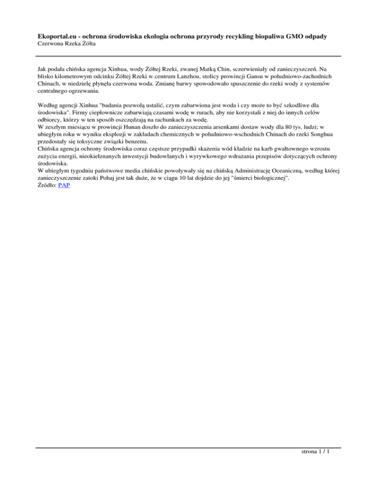 Ekoportal.eu - ochrona środowiska ekologia ochrona przyrody recykling biopaliwa GMO odpady Czerwona Rzeka Żółta Jak podała chińska agencja Xinhua, wody Żółtej Rzeki, zwanej Matką Chin, sczerwieniały od zanieczyszczeń. Na blisko kilometrowym odcinku Żółtej Rzeki w centrum Lanzhou, stolicy prowincji Gansu w południowo-zachodnich Chinach, w niedzielę płynęła czerwona woda. Zmianę barwy spowodowało spuszczenie do rzeki wody z systemów centralnego ogrzewania. Według agencji Xinhua "badania pozwolą ustalić, czym zabarwiona jest woda i czy może to być szkodliwe dla środowiska". Firmy ciepłownicze zabarwiają czasami wodę w rurach, aby nie korzystali z niej do innych celów odbiorcy, którzy w ten sposób oszczędzają na rachunkach za wodę. W zeszłym miesiącu w prowincji Hunan doszło do zanieczyszczenia arsenkami dostaw wody dla 80 tys. ludzi; w ubiegłym roku w wyniku eksplozji w zakładach chemicznych w południowo-wschodnich Chinach do rzeki Songhua przedostały się toksyczne związki benzenu. Chińska agencja ochrony środowiska coraz częstsze przypadki skażenia wód kładzie na karb gwałtownego wzrostu zużycia energii, nieokiełznanych inwestycji budowlanych i wyrywkowego wdrażania przepisów dotyczących ochrony środowiska. W ubiegłym tygodniu państwowe media chińskie powoływały się na chińską Administrację Oceaniczną, według której zanieczyszczenie zatoki Pohaj jest tak duże, że w ciągu 10 lat dojdzie do jej "śmierci biologicznej". Źródło: PAP strona 1 / 1