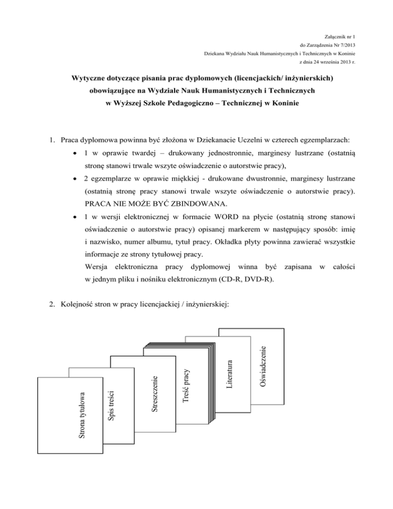Załącznik nr 1 do Zarządzenia Nr 7/2013 Dziekana Wydziału Nauk Humanistycznych i Technicznych w Koninie z dnia 24 września 2013 r. Wytyczne dotyczące pisania prac dyplomowych (licencjackich/ inżynierskich) obowiązujące na Wydziale Nauk Humanistycznych i Technicznych w Wyższej Szkole Pedagogiczno – Technicznej w Koninie 1. Praca dyplomowa powinna być złożona w Dziekanacie Uczelni w czterech egzemplarzach: 1 w oprawie twardej – drukowany jednostronnie, marginesy lustrzane (ostatnią stronę stanowi trwale wszyte oświadczenie o autorstwie pracy), 2 egzemplarze w oprawie miękkiej - drukowane dwustronnie, marginesy lustrzane (ostatnią stronę pracy stanowi trwale wszyte oświadczenie o autorstwie pracy). PRACA NIE MOŻE BYĆ ZBINDOWANA. 1 w wersji elektronicznej w formacie WORD na płycie (ostatnią stronę stanowi oświadczenie o autorstwie pracy) opisanej markerem w następujący sposób: imię i nazwisko, numer albumu, tytuł pracy. Okładka płyty powinna zawierać wszystkie informacje ze strony tytułowej pracy. Wersja elektroniczna pracy dyplomowej winna być zapisana w całości w jednym pliku i nośniku elektronicznym (CD-R, DVD-R). ZAŁĄCZNIKI SPIS LITERATURY, TABEL, RYSUNKÓW Oświadczenie Literatura SPIS LITERATURY, TABEL, RYSUNKÓW Treść pracy OŚWIADCZENIE Streszczenie STRONA TYTUŁOWA Spis treści Strona tytułowa 2. Kolejność stron w pracy licencjackiej / inżynierskiej: 3. Praca dyplomowa (licencjacka, inżynierska) musi być napisana samodzielnie przez studenta Wyższej Szkoły Pedagogiczno - Technicznej w Koninie. Student podpisując oświadczenie o autorstwie pracy, bierze na siebie odpowiedzialność za informacje w niej zamieszczone. 4. Wersja elektroniczna pracy dyplomowej winna być zapisana w całości w jednym pliku i nośniku elektronicznym (CD-R, DVD-R). 5. W całym tekście pracy student powinien stosować czcionkę Times New Roman, rozmiar 12, odstępy 1,5 wiersza. 6. Cytując opracowania innych autorów używamy cudzysłowów i przypisów. 7. Praca musi zawierać rozdział dotyczący wykorzystanej literatury (Literatura). Rozdział ten musi zawierać spis literatury, z których Autor korzystał w czasie pisania pracy. Wszystkie podane pozycje literatury muszą być cytowane w pracy. Kolejność pozycji -alfabetyczny według nazwisk. Spis literatury można ew. podzielić na źródła. Pozycje internetowe powinny również mieć autora i tytuł. Ponadto źródła internetowe powinny mieć datę pobrania informacji z sieci. Przykład odwołania się do pozycji literatury w tekście ...... dokładny opis działania algorytmu można znaleźć w [1, 4]. 8. Podpisy pod rysunkami i wykresami powinny być umieszczone tuż pod rysunkiem: czcionka Times New Roman, rozmiar 10 (według załączonego wzoru) 9. Tabele, rysunki i wykresy powinny być wyśrodkowane. 10. Marginesy: górny i dolny 2,5 cm; prawy 2,5 cm; lewy 3,0 cm 11. Numery stron powinny zostać wyśrodkowane i umieszczone w stopce pracy. Strona tytułowa pracy pozostaje bez numeru, zaczynamy numerować od strony drugiej, jaką jest spis treści. 12. Układ strony tytułowej pracy, spisu treści oraz tekstu według załączonego wzoru. WYŻSZA SZKOŁA PEDAGOGICZNO-TECHNICZNA W KONINIE WYDZIAŁ NAUK HUMANISTYCZNYCH I TECHNICZNYCH WYKORZYSTANIE MULTIMEDIÓW W NAUCZANIU Imię i nazwisko studenta numer albumu … Promotor: dr inż. imię i nazwisko Konin 2013 SPIS TREŚCI Wprowadzenie . . . . . . . . . . . . . . . . . . . . . . . . . . . . . . . . . . . . . . . . . . . . . . . . . . . . . 4 1. REGULAMIN ĆWICZEŃ LABORATORYJNYCH 1.1 Przepisy ogólne . . . . . . . . . . . . . . . . . . . . . . .. . . . . . . . . . . . . . . . . . 6 1.2 Przebieg ćwiczenia . . . . . . . . . . . . . . . . . . . . . . . . . . . . . . . . . . . . . 6 1.3 Technika wykonywania pomiarów . . . . . . . . . . . . . . . . . . . . . . . . . 7 1.4 Sprawozdania z ćwiczeń . . . . . . . . . . .. . . . . . . . . . . . . . . . . . . . . . 8 1.5 Bezpieczeństwo i higiena pracy w laboratorium . . . . . .. . . . . . . . 9 2. PODSTAWOWE WIADOMOŚCI O PRZYRZĄDACH POMIAROWYCH 2.1 Klasyfikacja przyrządów pomiarowych . . . . . . . . . . . . . . . . . . . . . . 10 2.2 Rozszerzenie zakresów pomiarowych mierników . . . . . .. . . . . . . . . 11 2.3 Podstawowe cechy mierników elektrycznych . . . . . . . . . . . . . . . . . . 13 2.4 Wymagania stawiane miernikom elektrycznym . . . . . . . . . . . . . . . . . 16 2.5 Oznaczenia i symbole na skalach mierników elektrycznych . . . . . . . 18 3. ĆWICZENIA LABORATORYJNE 3.1 Pomiar miernikami analogowymi i cyfrowymi . . . . . . . . . . . . . . . . . 22 3.1.1 Pomiar miernikami analogowymi. . . . . . . . . . . . . . . . . . . . . . 22 3.1.2 Pomiar miernikami cyfrowymi . . . . . . . . . . . . .. . . . . . . . . . . 25 3.2 Sposoby wyznaczania rezystancji prądem stałym . . . . . . . . . . . . . . 27 3.3 Dopasowanie odbiornika do źródła energii elektrycznej . . . . . . . . . 30 3.4 Ładowanie i wyładowanie kondensatora . . . . . . . . . . . . . . . . . . . . . 34 3.5 Elementy R,L,C w obwodzie prądu sinusoidalnie zmiennego . . . . . 36 3.6 Rezonans napięć i rezonans prądów . . . . . . . . ………. . . . . . . . . . . . . . . . . 40 3.7 Moc i energia odbiorników jednofazowych . . . . . . . . . . . . . . . . . . . 41 Podsumowanie . . . . . . . . . . . . . . . . . . . . . . . . . . . . . . . . . . . . . . . . . . . . . . . . . . . .42 Literatura . . . . . . . . . . . . . .. . . . . . . . . . . . . . . . . . . . . . . . . . . . . . . . . . . . . . . . . . . 43 Załączniki (schematy, szczegółowe wyniki pomiarów, ankiety, itp.) Streszczenie pracy dyplomowej Temat pracy dyplomowej ……………………………………………………………………………………………… Imię i nazwisko autora pracy: …………………………………………………………… Nr albumu: …………………………. Imię i nazwisko promotora pracy: …………………