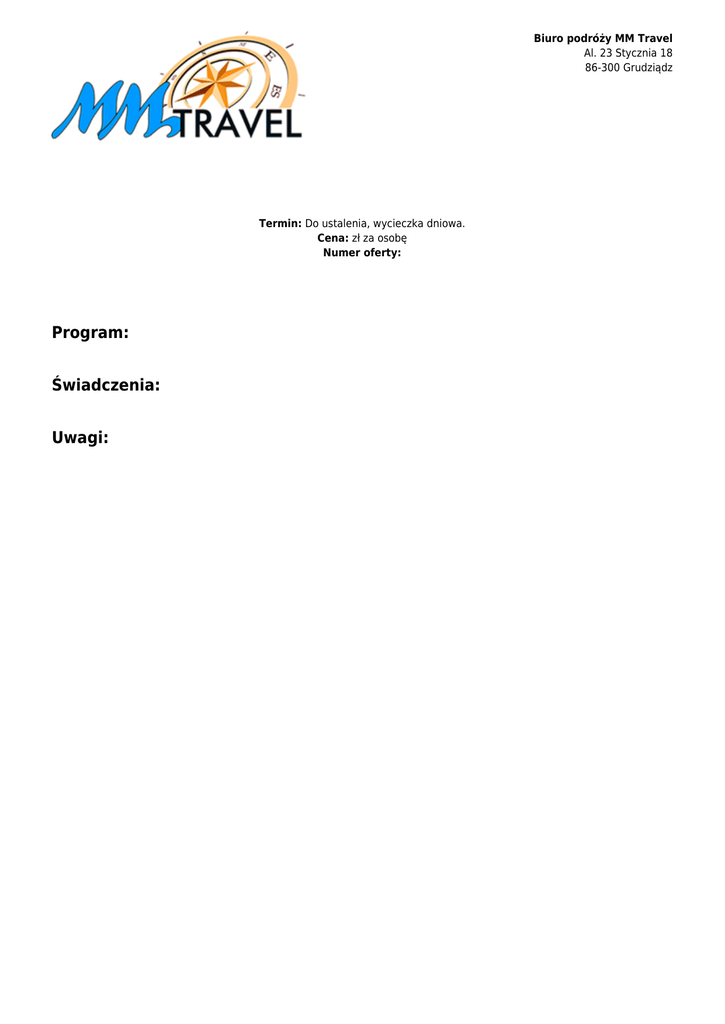 Biuro podróży MM Travel Al. 23 Stycznia 18 86-300 Grudziądz Termin: Do ustalenia, wycieczka dniowa. Cena: zł za osobę Numer oferty: Program: Świadczenia: Uwagi: