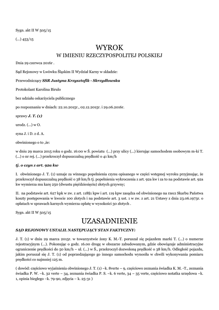Sygn. akt II W 505/15 (...) 453/15 WYROK W IMIENIU RZECZYPOSPOLITEJ POLSKIEJ Dnia 29 czerwca 2016r . Sąd Rejonowy w Lwówku Śląskim II Wydział Karny w składzie: Przewodniczący SSR Justyna Krzysztofik - Skrzydłowska Protokolant Karolina Birulo bez udziału oskarżyciela publicznego po rozpoznaniu w dniach: 22.10.2015r., 02.12.2015r. i 29.06.2016r. sprawy J. T. (1) urodz. (...) w O. syna J. i D. z d. A. obwinionego o to ,że: w dniu 29 marca 2015 roku o godz. 16:00 w Ś. powiatu (...) przy ulicy (...) kierując samochodem osobowym m-ki T. (...) o nr rej. (...) przekroczył dopuszczalną prędkość o 41 km/h tj. o czyn z art. 92a kw I. obwinionego J. T. (1) uznaje za winnego popełnienia czynu opisanego w części wstępnej wyroku przyjmując, że przekroczył dopuszczalną prędkość o 38 km/h tj. popełnienia wykroczenia z art. 92a kw i za to na podstawie art. 92a kw wymierza mu karę 250 (dwustu pięćdziesięciu) złotych grzywny; II. na podstawie art. 627 kpk w zw. z art. 118§1 kpw i art. 119 kpw zasądza od obwinionego na rzecz Skarbu Państwa koszty postępowania w kwocie 100 złotych i na podstawie art. 3 ust. 1 w zw. z art. 21 Ustawy z dnia 23.06.1973r. o opłatach w sprawach karnych wymierza opłatę w wysokości 30 złotych . Sygn. akt II W 505/15 UZASADNIENIE SĄD REJONOWY USTALIŁ NASTĘPUJĄCY STAN FAKTYCZNY: J. T. (1) w dniu 29 marca 2015r. w towarzystwie żony K. M.-T. poruszał się pojazdem marki T. (...) o numerze rejestracyjnym (...). Pokonując o godz. 16.00 drogę w obszarze zabudowanym, gdzie obowiązuje administracyjne ograniczenie prędkości do 50 km/h – ul. (...) w Ś., przekroczył dozwoloną prędkość o 38 km/h. Odległość pojazdu, jakim poruszał się J. T. (1) od poprzedzającego go innego samochodu wynosiła w chwili wykonywania pomiaru prędkości co najmniej 125 m. ( dowód: częściowo wyjaśnienia obwinionego J. T. (1) –k. 8verte – 9, częściowo zeznania świadka K. M. -T., zeznania świadka P. W. –k. 32 verte – 34, zeznania świadka P. S. –k. 6 verte, 34 – 35 verte, częściowo notatka urzędowa –k. 1, opinia biegłego –k. 79-90, zdjęcia – k. 25-31 ) Pomiar prędkości dokonany został przy użyciu urządzenia laserowego (...) 20-20 100LR o nr (...) posiadającego ważną legalizację. Przyrząd był sprawny i miał prawidłowo ustawiony celownik. ( dowód: notatka urzędowa -k. 1, opinia biegłego – k. 79-90, kserokopia instrukcji obsługi urządzenia wraz ze świadectwem legalizacji – k. 40-58, pismo KPP w L. – k. 39) J. T. (1) ma obecnie 34 lata. O wykształceniu wyższym w dziedzinie eksploatacji i budowy maszyn, prowadzi własną działalność gospodarczą zarabiają średnio miesięcznie 10 000 zł. Żona prowadzi kancelarię radcowską. Obwiniony nie posiada żadnych osób na utrzymaniu. ( dowód: wyjaśnienia obwinionego J. T. (1) –k. 8, 32 ) J. T. (1) nie przyznał się do popełnienia zarzucanego mu czynu. Na etapie czynności wyjaśniających wskazał, że jadąc wraz z żoną w kierunku S. poruszał się za samochodem jadącym w odległości 40-50 m z taką samą prędkością, za którym chwilę po wyjechał zza łuku drogi. Następnie poprzedzający go pojazd został zatrzymany przez patrol Policji, a zaraz potem puszczony, po czym zatrzymano pojazd obwinionego. Widząc wynik pomiaru prędkości okazany mu na radarze, od razu go zakwestionował i odmówił przyjęcia mandatu. Bezskutecznie prosił o sprawdzenie prawidłowości wykonania pomiaru, otoczenia i warunków jego wykonania i okazanie instrukcji urządzenia. Powziął wątpliwości co do prawidłowości pomiaru wobec warunków atmosferycznych: mokrej nawierzchni drogi, opadów deszczu, a nadto bliskiej odległości między mierzonymi pojazdami, czasu pomiaru jaki upłynął między mierzeniem jednego i drugiego samochodu oraz miejsca, z którego dokonywano pomiaru – pozostawania pojazdu policyjnego za kontenerem z gałęziami, nachylenia drogi , które powodować mogło, że wiązka laserowa mogła nie być skierowana na jego samochód. Zapewniał, że dozwolonej prędkości nie przekroczył. W toku postępowania sądowego odmawiając składania wyjaśnień, podtrzymał złożone poprzednio i do akt sprawy dołączył zdjęcia wykonane w miejscu, gdzie doszło do pomiaru prędkości i zatrzymania. SĄD ZWAŻYŁ, CO NASTĘPUJE: Zgromadzony w sprawie materiał dowodowy dał wystarczające podstawy do poczynienia prawidłowych ustaleń w zakresie winy i sprawstwa J. T. (1). Wobec charakteru wysuwanych zastrzeżeń co do prawidłowości wykonania pomiaru prędkości Sąd dopuścił dowód z opinii posiadającego wiadomości specjalne biegłego z zakresu technologii pomiaru prędkości pojazdów, uwzględniając w tym przedmiocie wniosek dowodowy obrońcy. Wydanie pisemnej opinii przez biegłego J. T. (2) poprzedzało uzyskanie przez Sąd instrukcji obsługi urządzenia i przesłuchanie dokonujących pomiaru policjantów. Nadto biegły dokonał sprawdzenia przyrządu za pomocą wbudowanych funkcji diagnostycznych wykorzystując fakt, że akta sprawy otrzymał przed upływem ważności świadectwa legalizacji obejmującego dzień zdarzenia. Nie doszukał się Sąd żadnych obiektywnych powodów, dla których wiary opinii biegłego należałoby odmówić. Wnioski biegłego poprzedzała, jak wynika z treści opinii, wnikliwa analiza zarówno uprzednio zebranego materiału dowodowego, jak i miejsca zdarzenia. Analizując parametry wskazane w notatce i zeznaniach policjantów biegły nie znalazł podstaw, by zebrane bezpośrednio dowody kwestionować. Dał Sąd wiarę także dalszym nieosobowym materiałom dowodowym, które korespondują ze sobą wzajemnie i nie były kwestionowane w toku postępowania. Próba podważania wniosków opinii przez obwinionego, który wskazał, że opinia ta w treści odbiega od opinii wydawanych przez tego biegłego w innych sprawach jest nieudolna. Biegły za każdym razem zobowiązany zostaje do wydania opinii w d